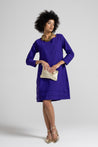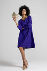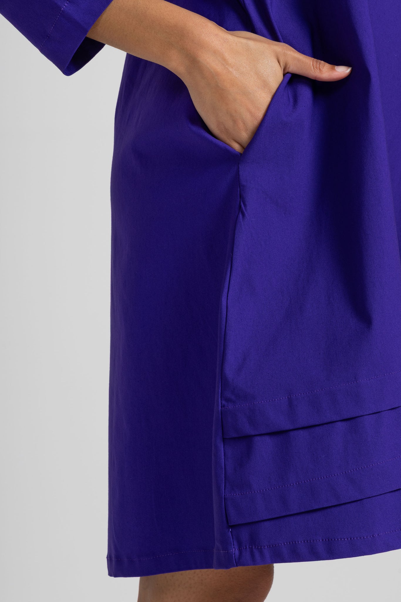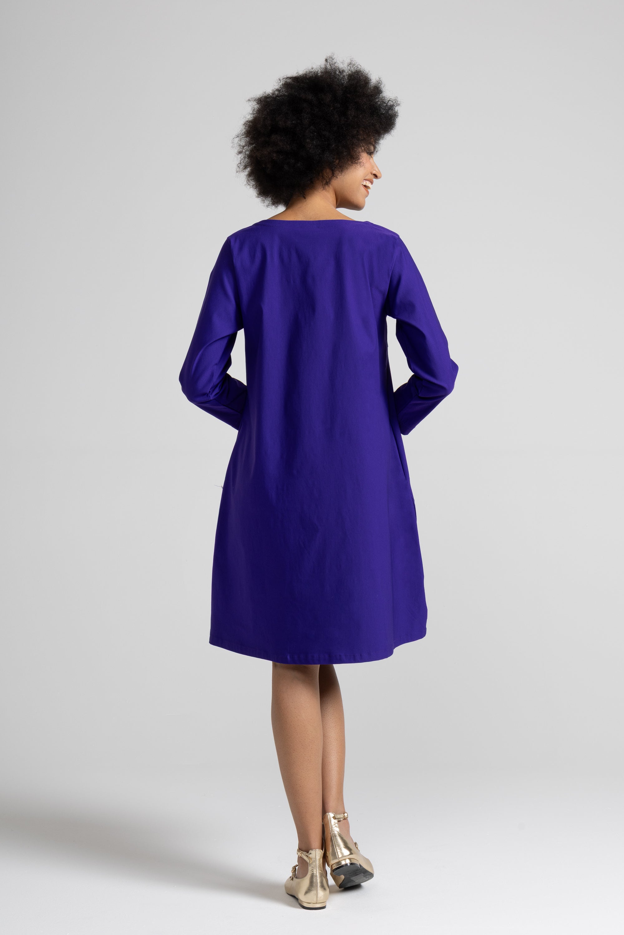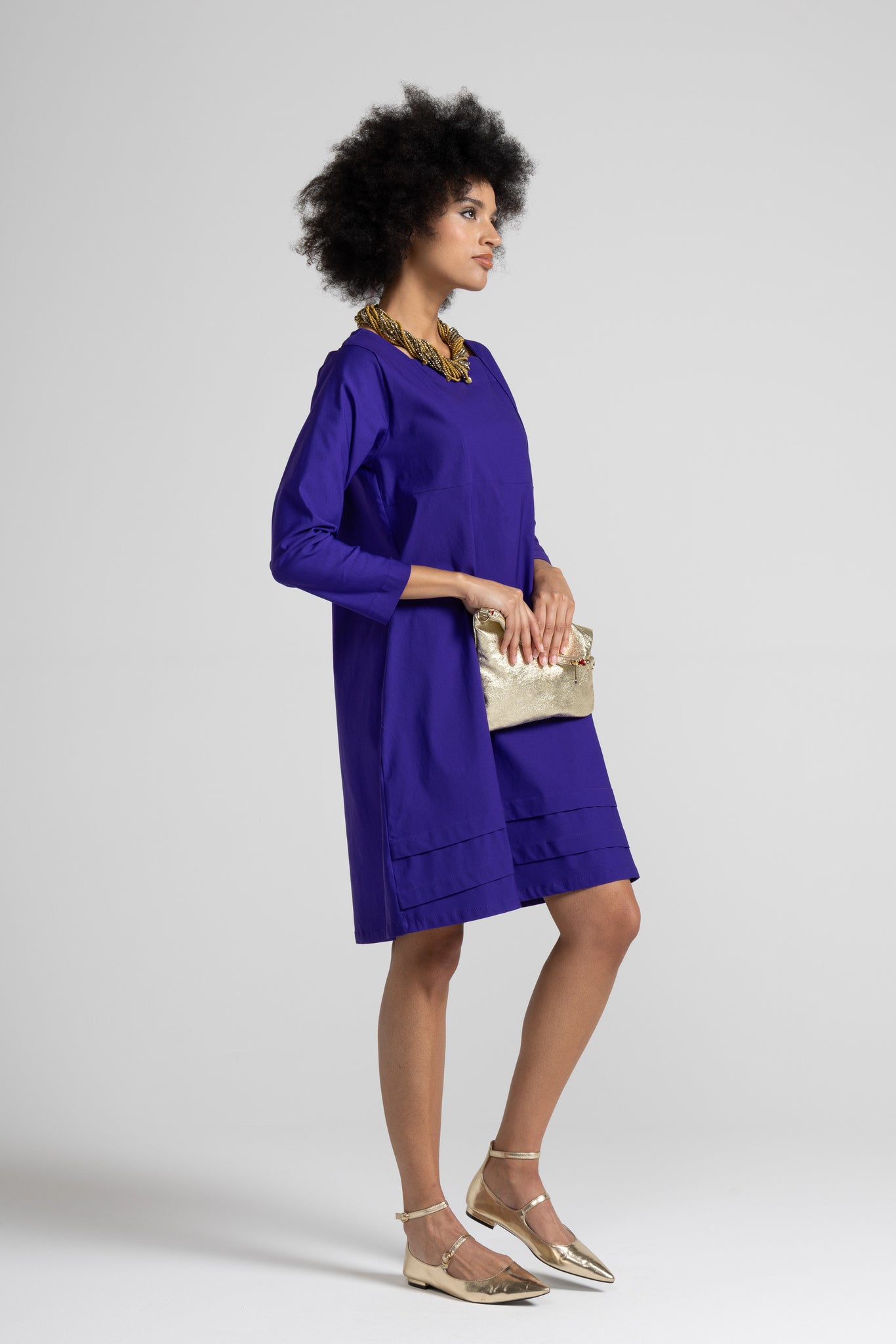 Abito midi in bengalina di viscosa, linea svasata, manica lunga, corpetto geometrico con taglio sotto il seno e scollo squadrato, tasche a filo, dettaglio doppie balze impunturate sull’orlo.