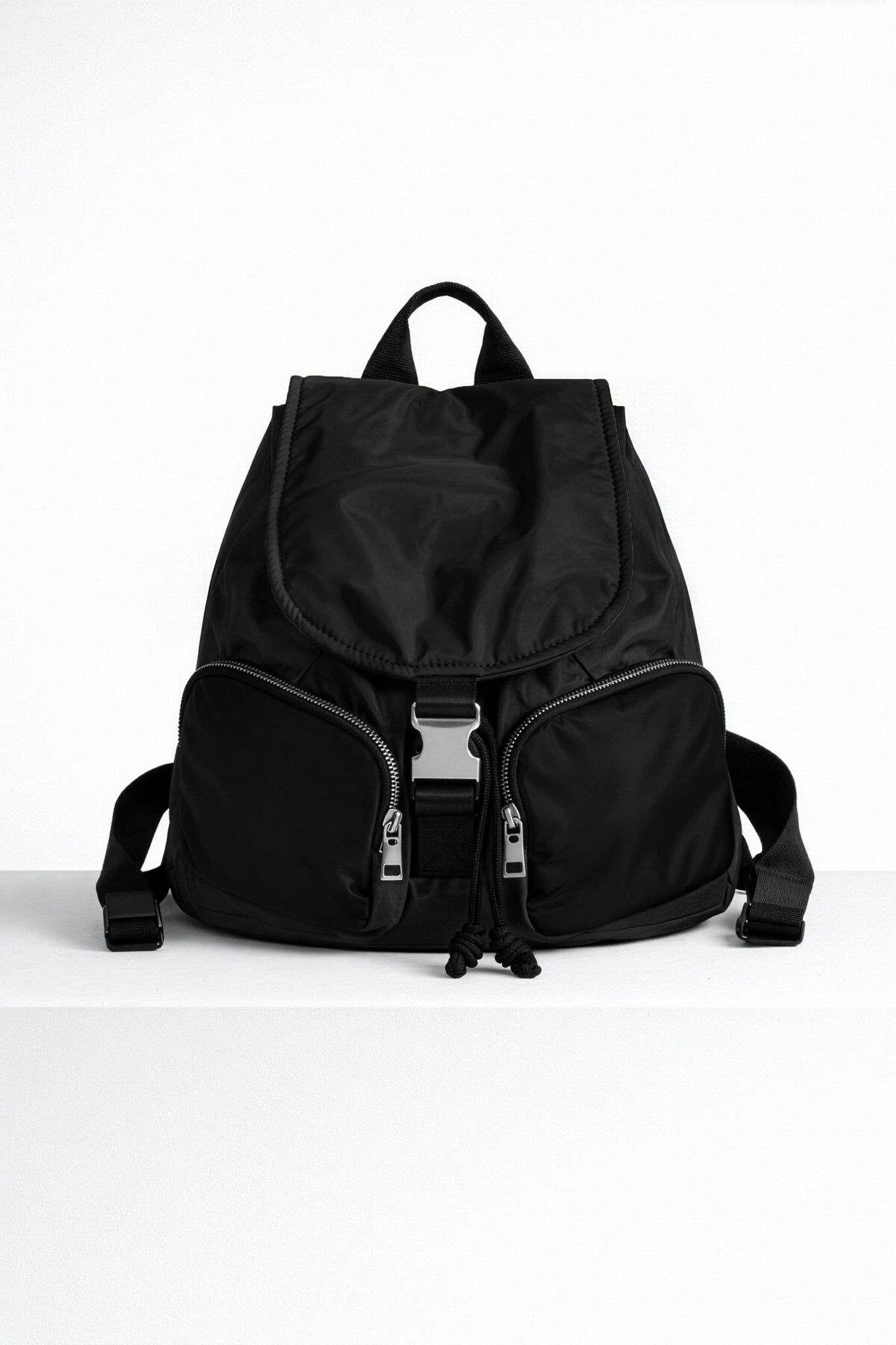 La chiusura con patta e fibbia aggiunge sicurezza e un tocco sport-chic, mentre le due ampie tasche frontali con zip sono ideali per tenere a portata di mano tutto ciò che serve.