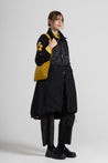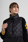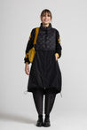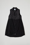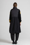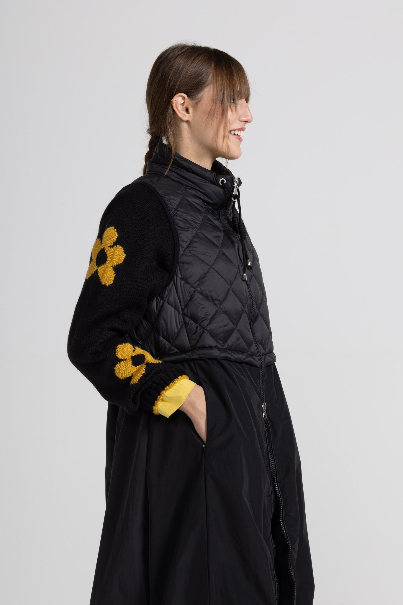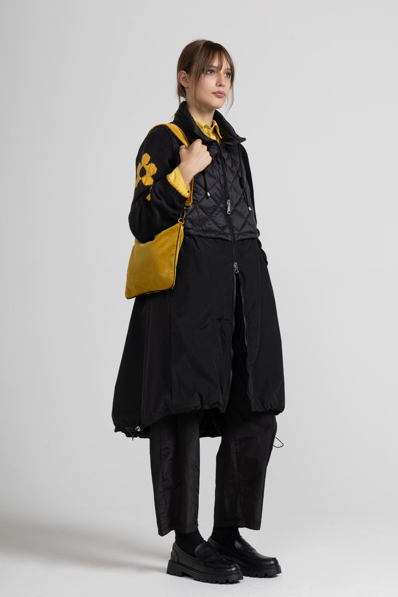 Smanicato asimmetrico tecnico lungo, collo alto con coulisse regolabile, imbottitura leggera con trapuntatura a rombi nella parte superiore,  tessuto tecnico liscio nella parte inferiore, tasche a filo sul davanti con chiusura zip invisibile, coulisse regolabile in vita e in fondo, chiusura con zip nera a due cursori sul davanti.