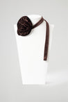 Il design presenta un fiore applicato, modellato in pieghe e volumi delicati per evocare la forma di una rosa. Il fiore è posizionato lateralmente per un effetto sofisticato e femminile.