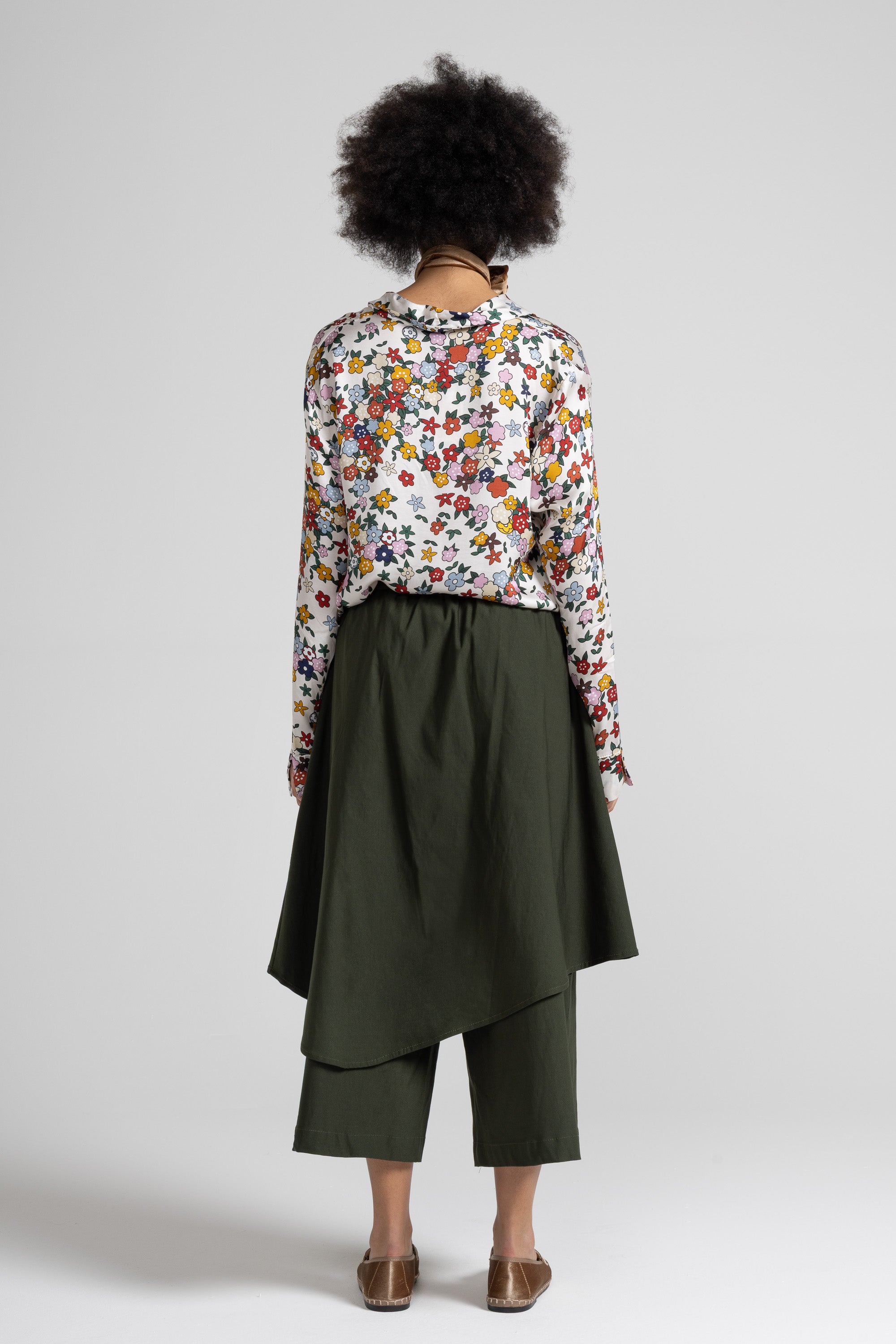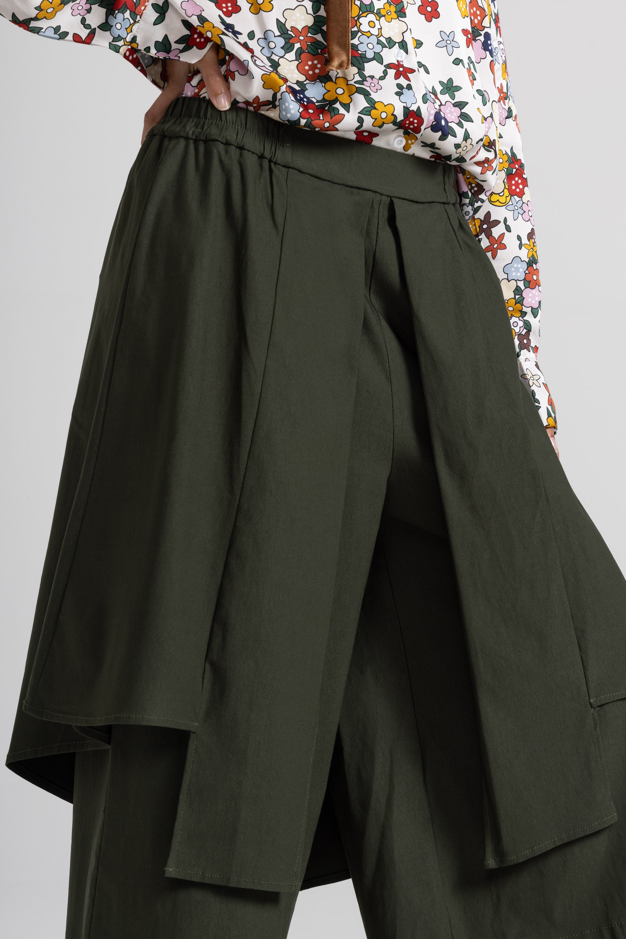 Gonna pantalone, un capo dallo stile raffinato e dall’anima versatile, avvolge la figura con morbidezza, garantendo comfort e movimento in ogni passo, il design asimmetrico e i pannelli sovrapposti creano un effetto dinamico e sofisticato.