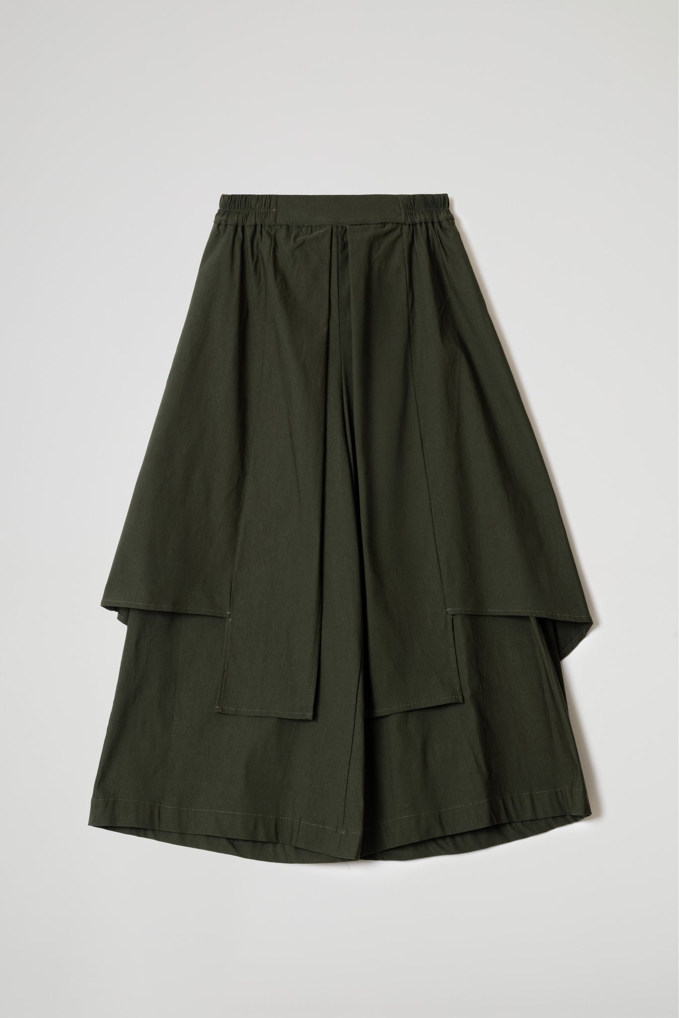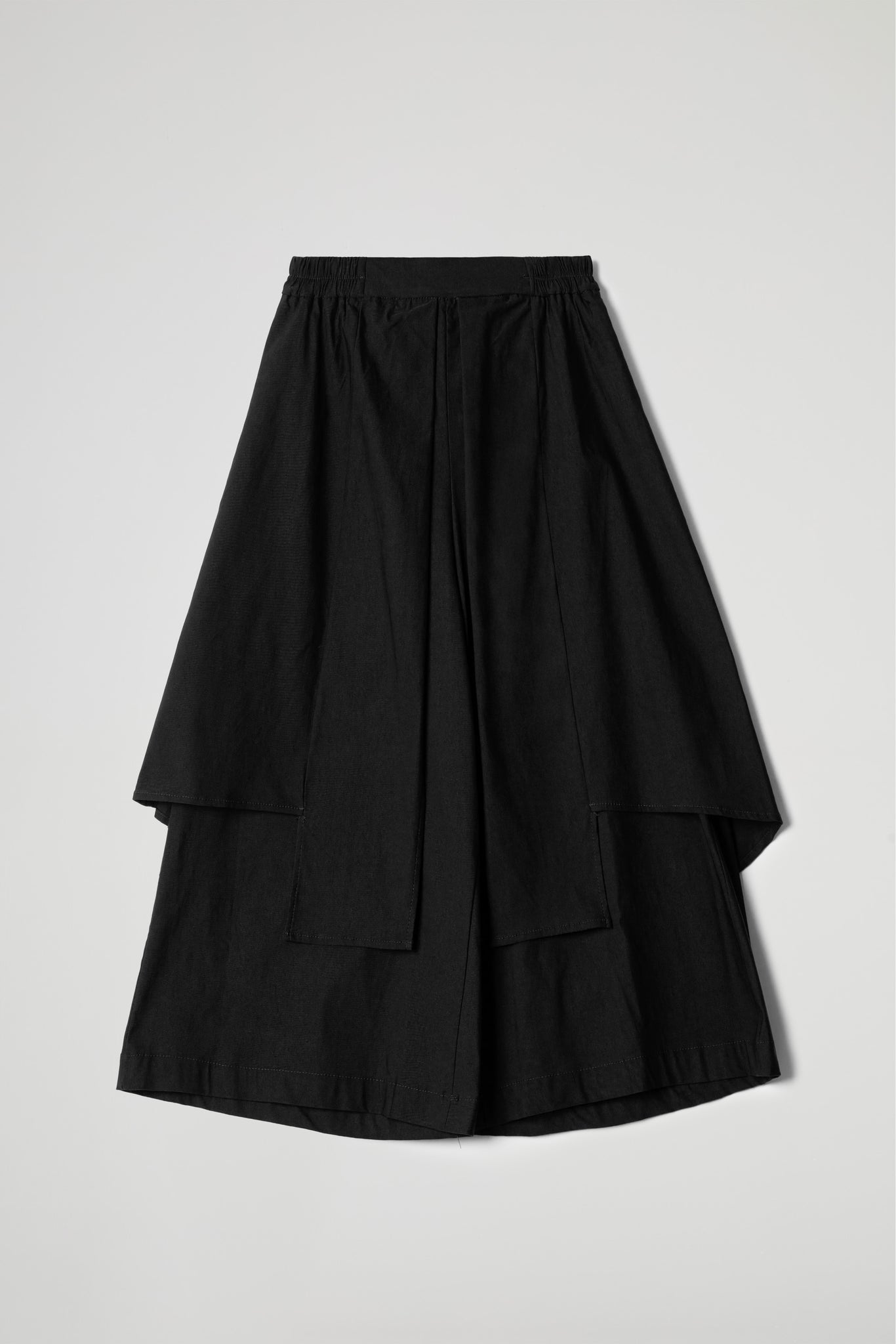 Gonna pantalone in tessuto di viscosa elasticizzato, vita elastica, nella parte superiore la gonna scende a strati irregolari, dettaglio cuciture, al di sotto pantalone dalla linea ampia, orlo alto sul fondo.