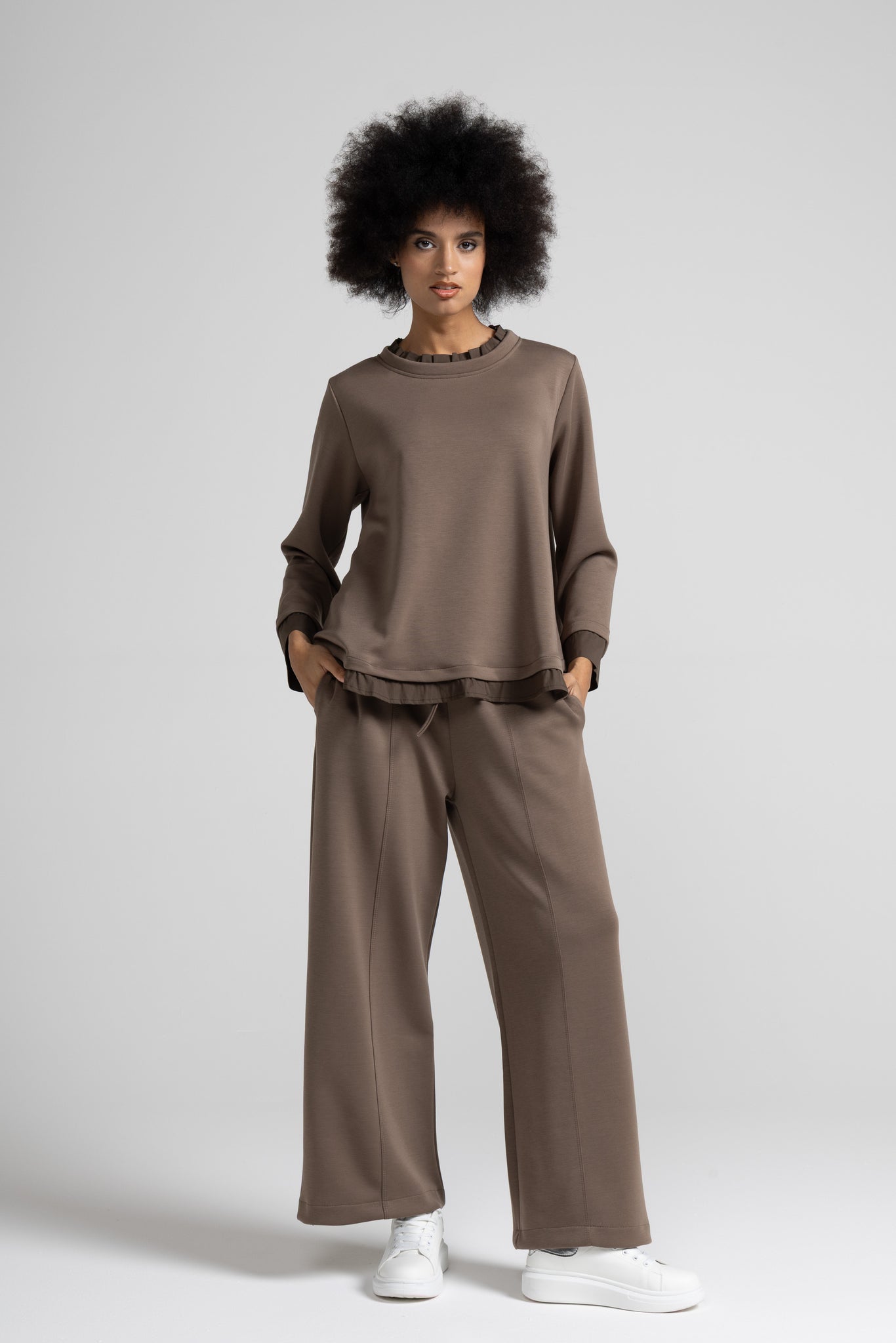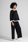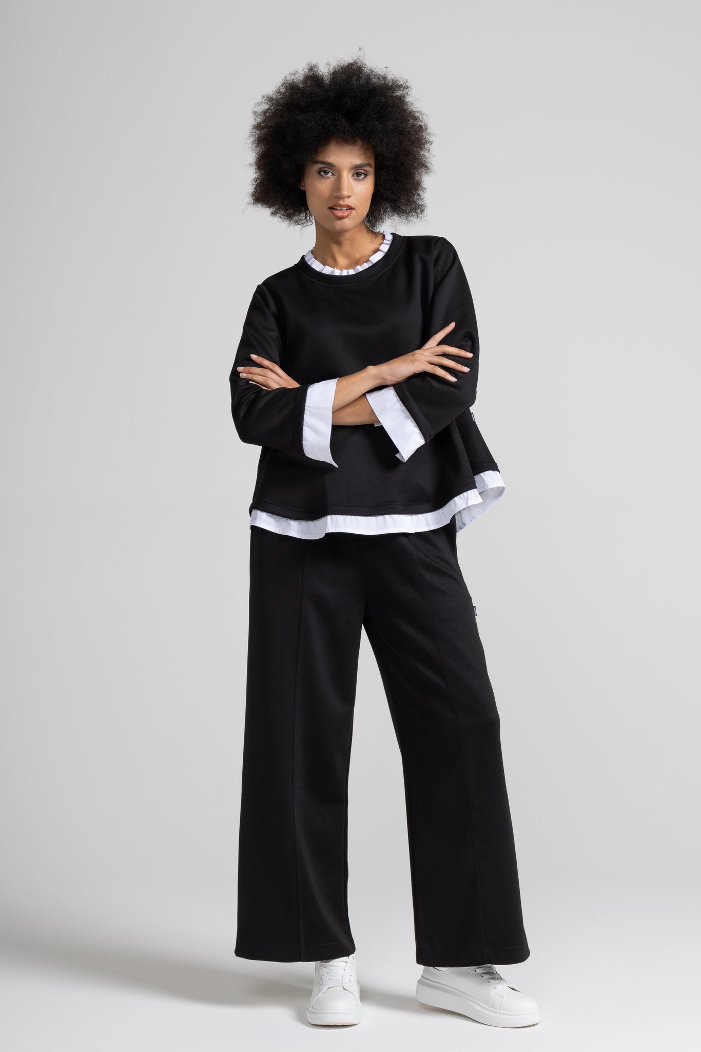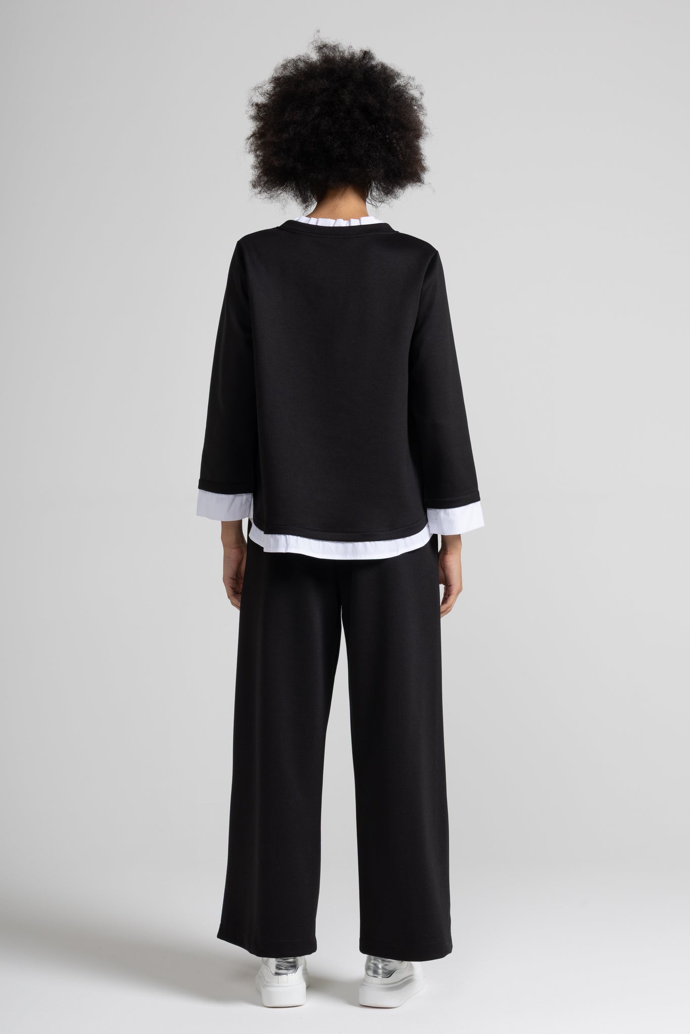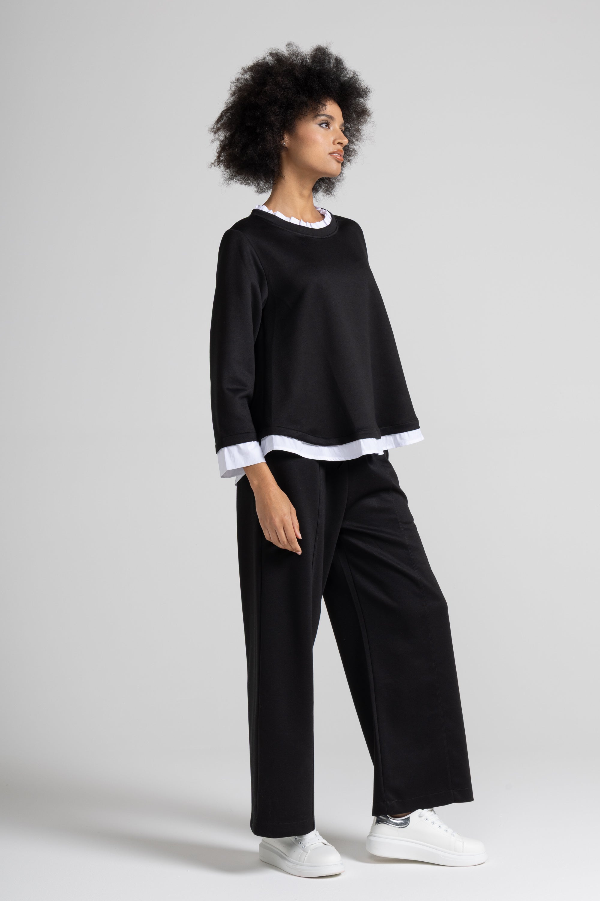 Top a trapezio in tessuto fluido di viscosa, scollo rotondo con dettaglio colletto in rouches in popeline, manica lunga, dettaglio popeline su manica e fondo.