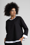 Top  dal design raffinato e contemporaneo. Il modello unisce la comodità di una maglia in cotone elasticizzato alla ricercatezza di inserti effetto camicia in popeline, visibili al collo e al fondo manica.