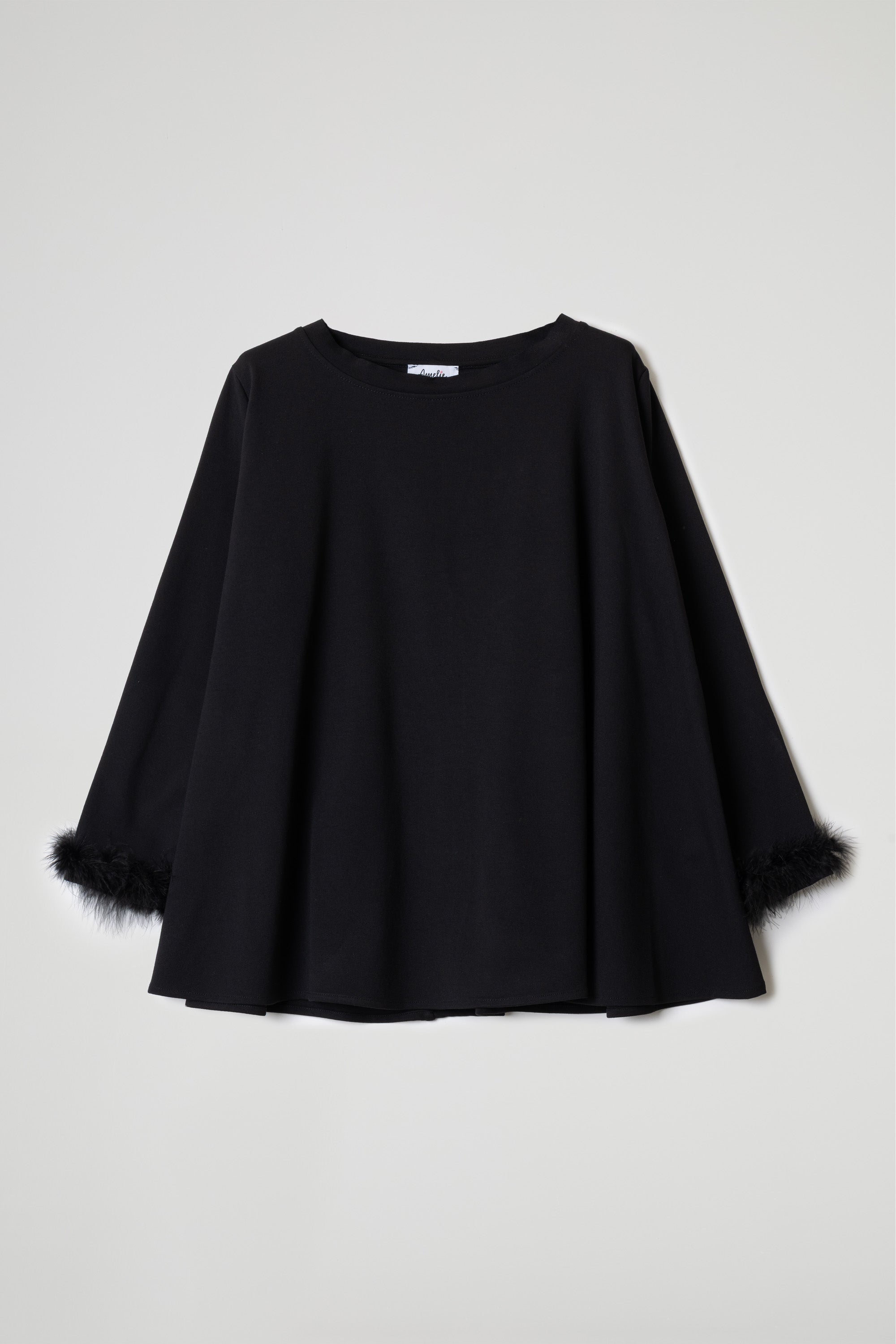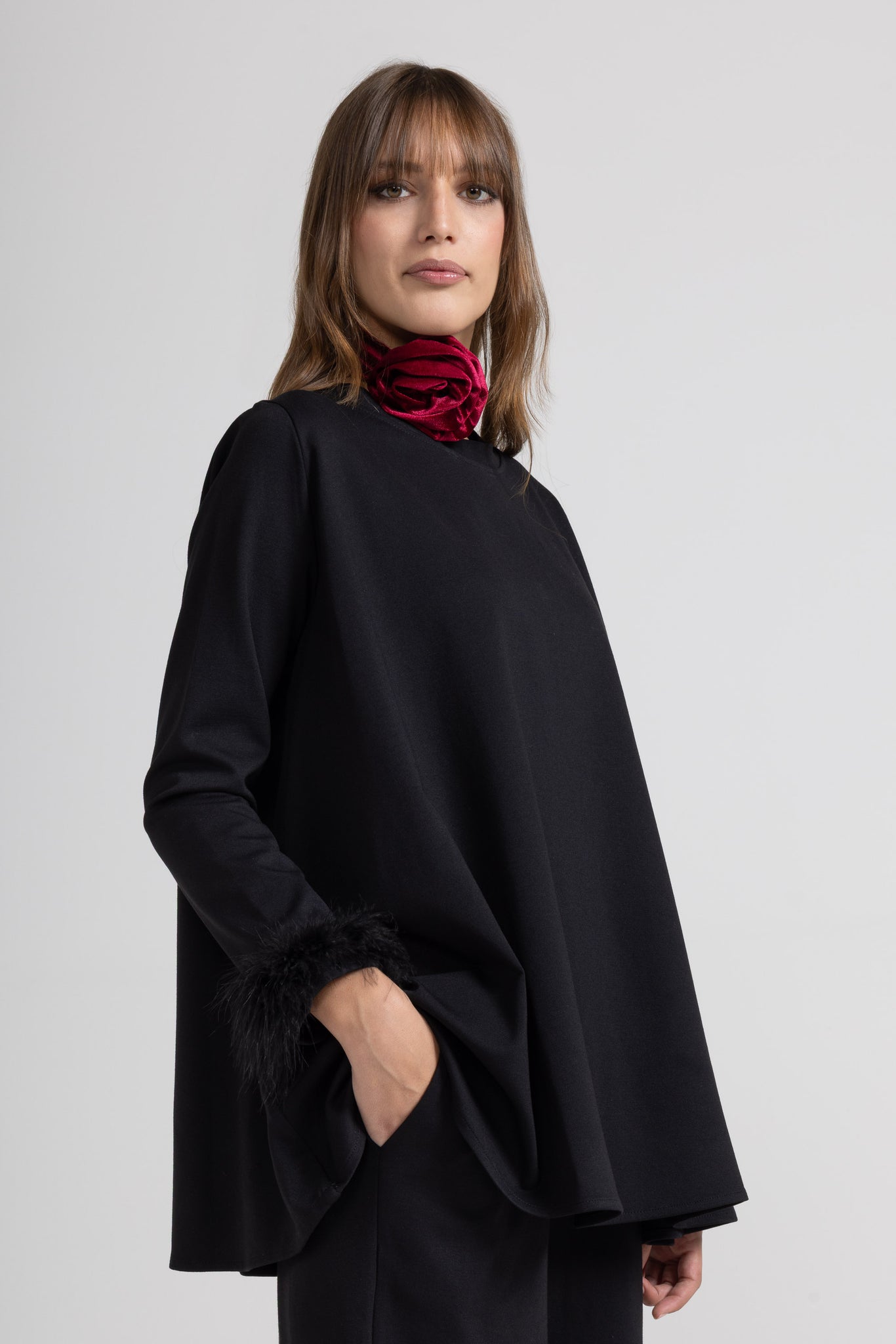 Top in tessuto punto Milano di viscosa, ampio girocollo ribattuto, linea a trapezio leggermente asimmetrico, manica lunga arricchite da un dettaglio in piuma sul fondo.
