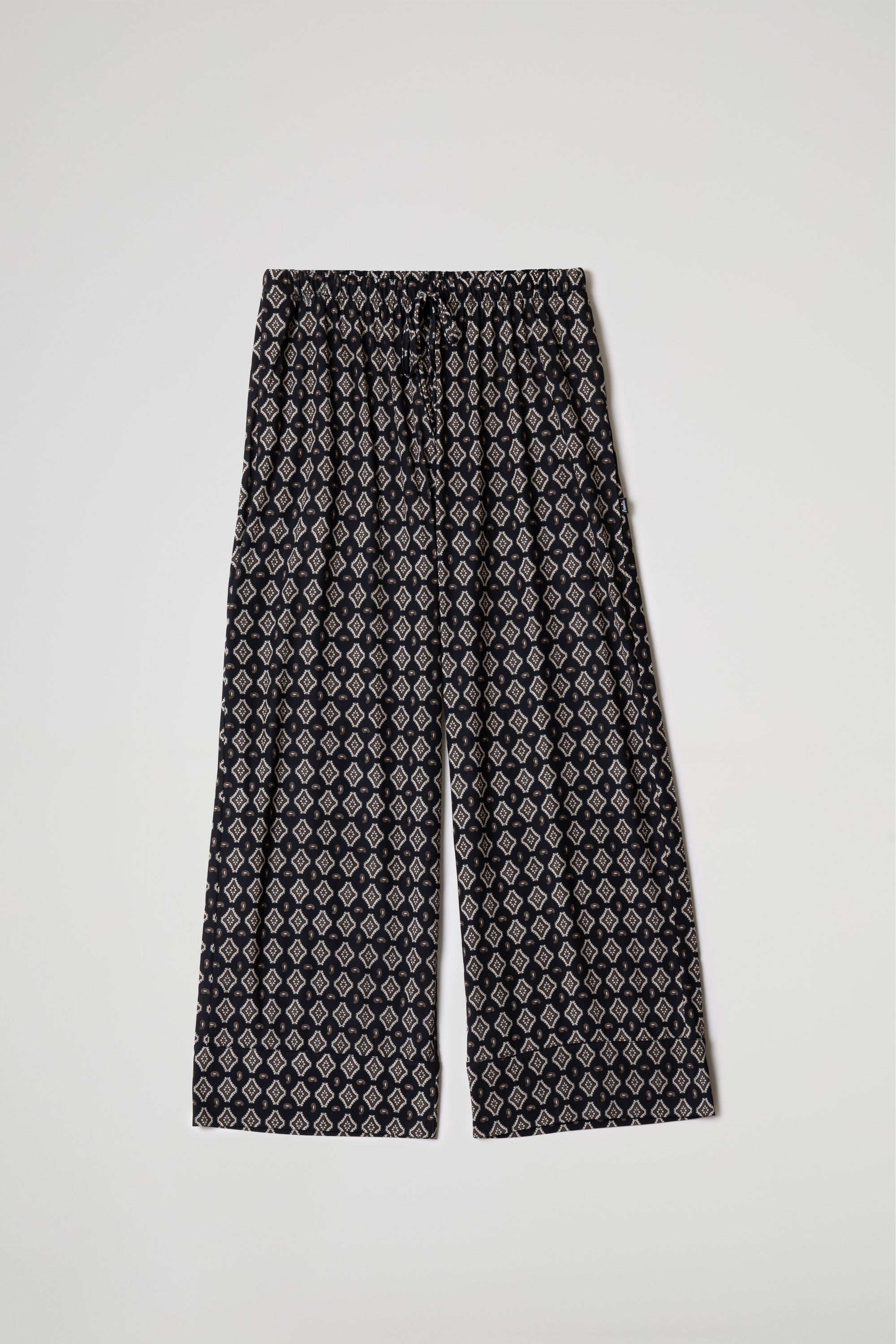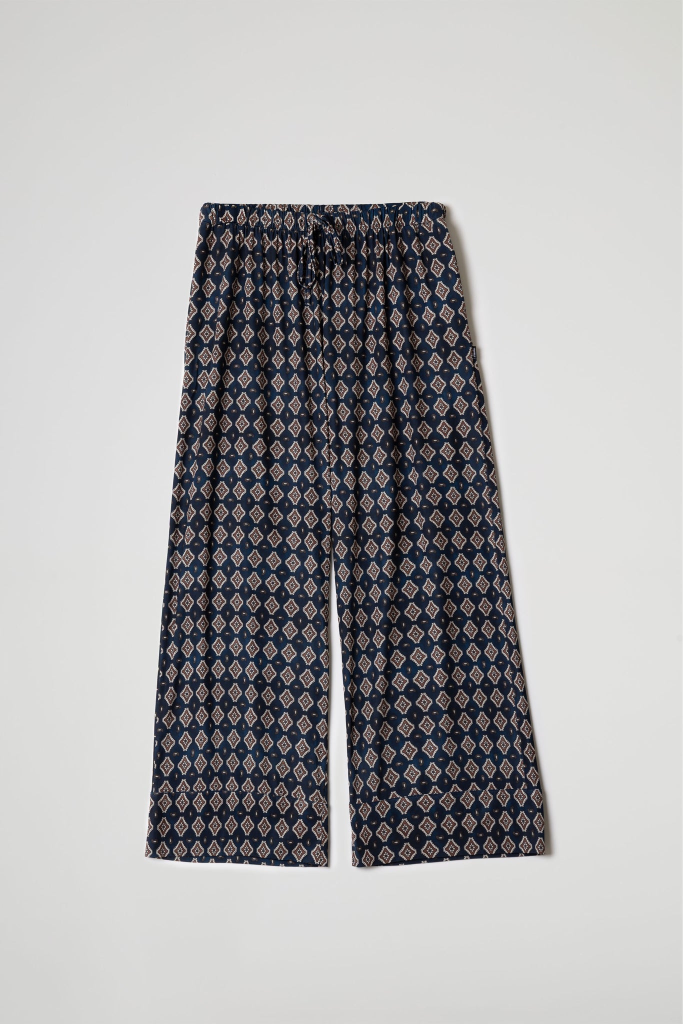 Pantalone a palazzo in tessuto tecnico, elastico in vita con coulisse regolabile, tasche a filo, orlo ribattuto alto sul fondo, fantasia geometrica su tutto il capo, Lina morbida