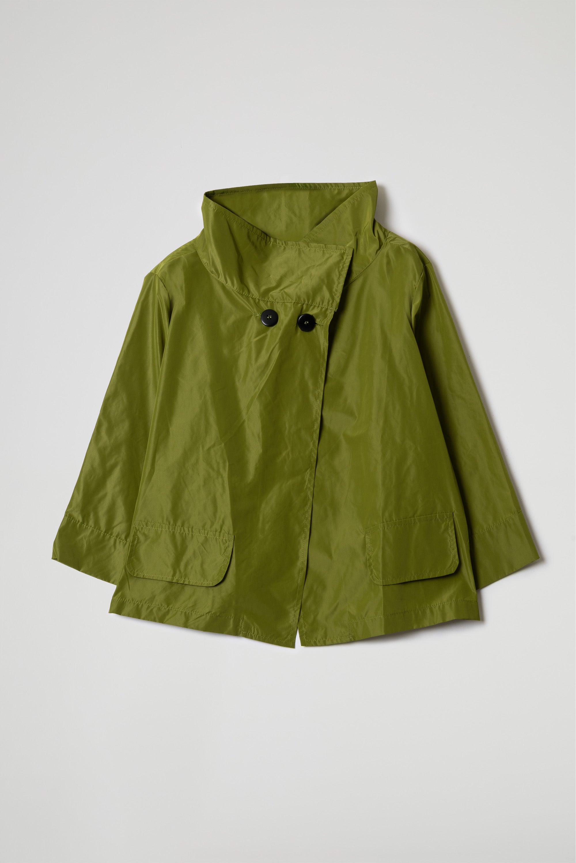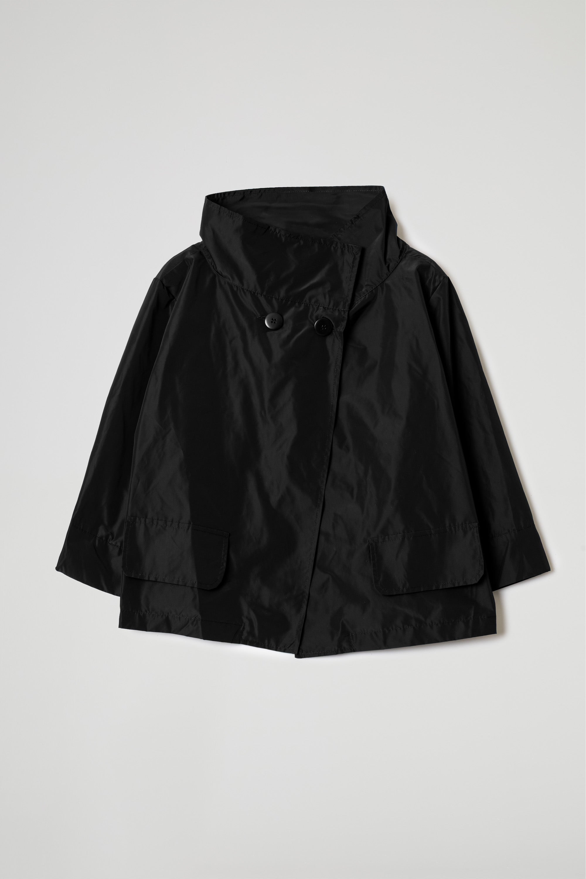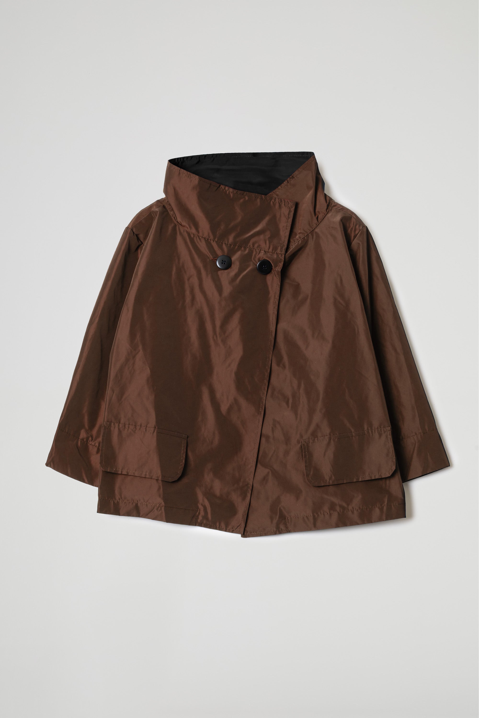 Giacca corta in tessuto taffetà effetto nacrè, interno con colore a contrasto, collo ampio ad anello, tasche frontali con pattina, manica ampia a 3/4 con orlo ribattuto alto, chiusura frontale con bottoni neri visibili sulla parte superiore. Linea ampia e morbida.