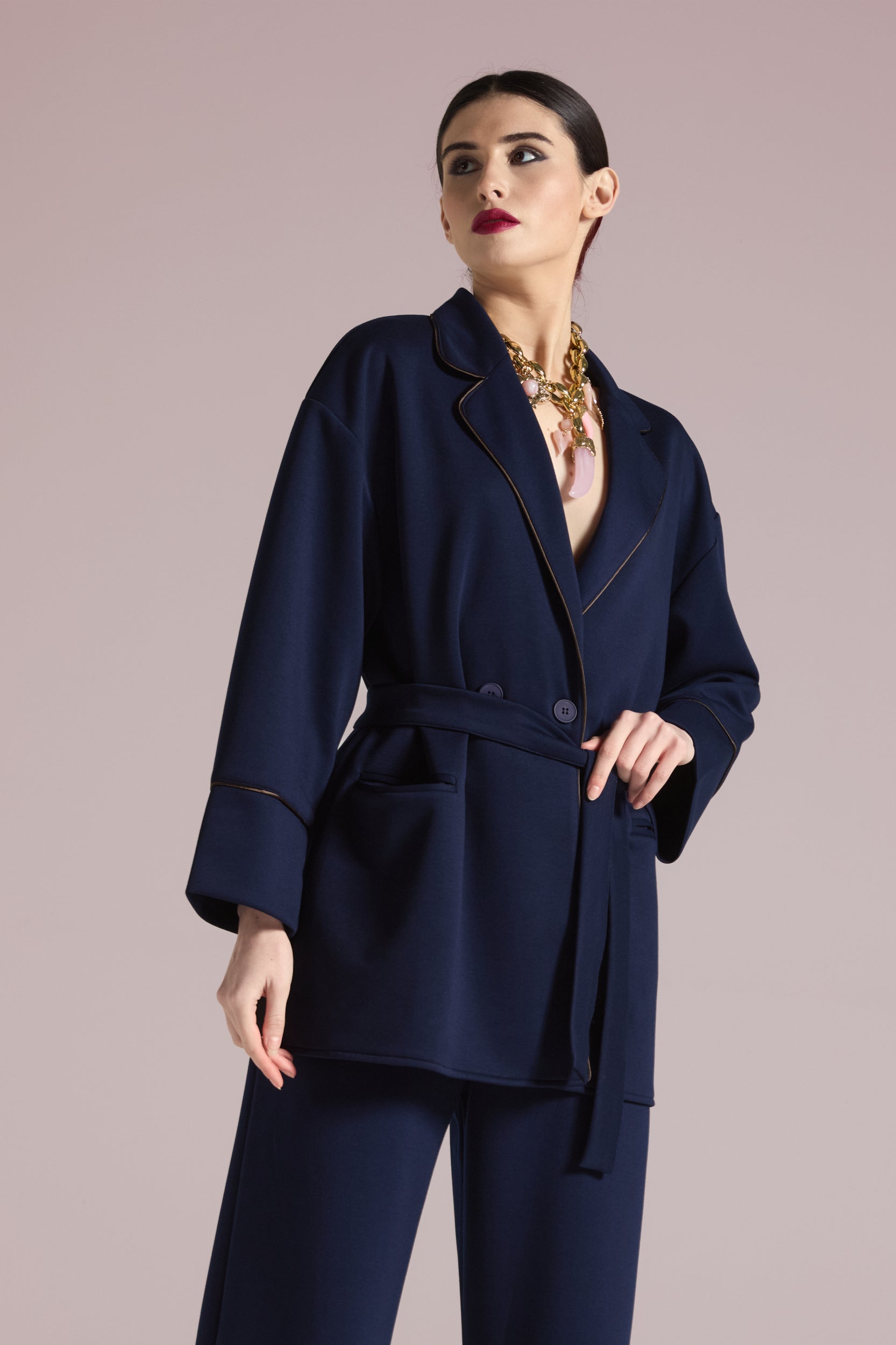 Giacca dal taglio contemporaneo, perfetta per dare subito carattere anche ai look più semplici. La linea è morbida e leggermente over, con rever ampio e un finish super curato grazie alle profilature a contrasto che definiscono i bordi e le maniche. Da indossare aperta oppure da stringere in vita con la fusciacca coordinata per valorizzare la silhouette.