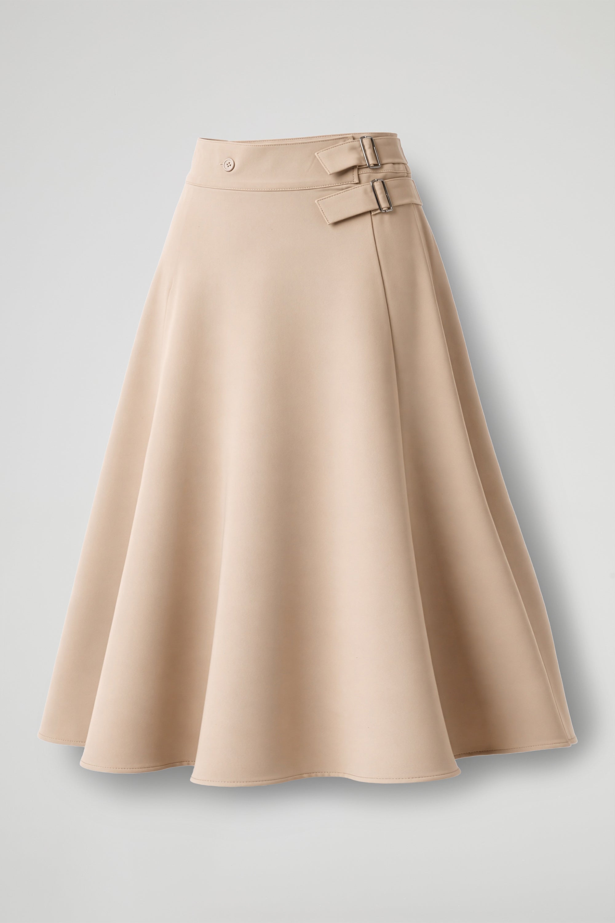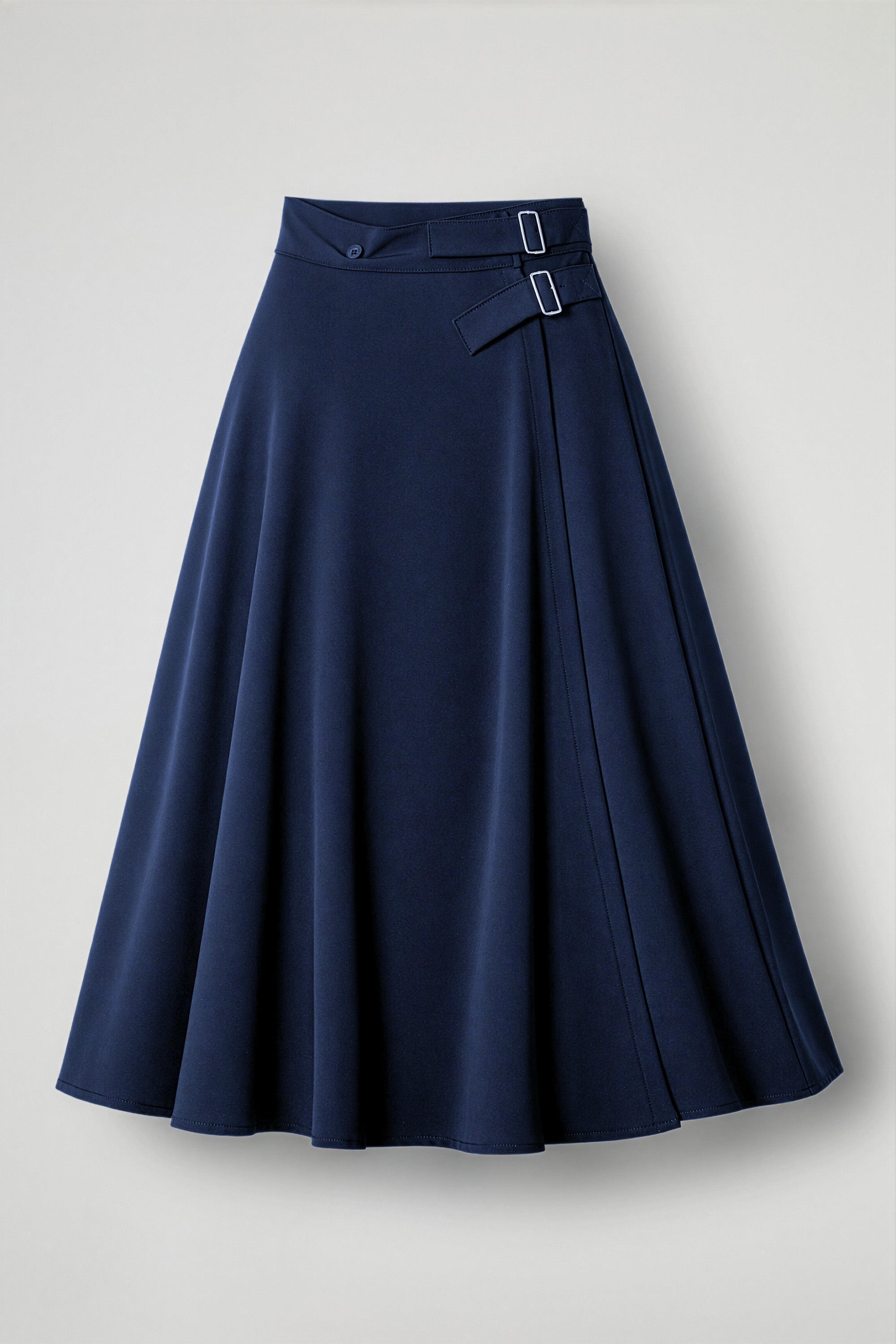 Gonna midi dal tessuto fluido, linea svasata, vita strutturata con cinturini decorativi con fibbie, tasche a filo. Linea confortevole