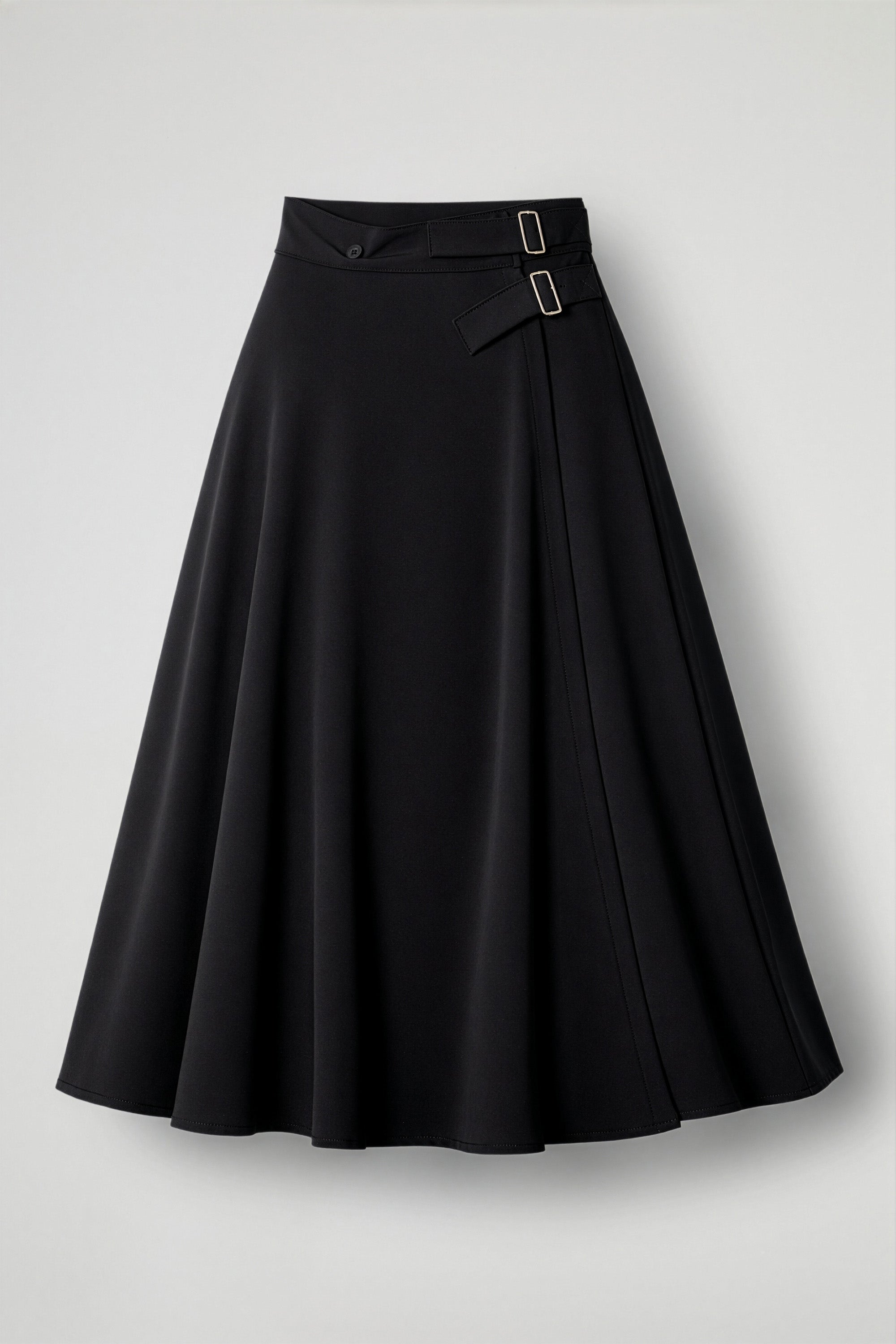 Gonna midi, realizzata in tessuto morbido e scivolato, che accompagna il passo con leggerezza creando un effetto raffinato e femminile; La linea ampia e svasata dona armonia alla figura, mentre il taglio asimmetrico in vita e i cinturini decorativi con fibbie metalliche aggiungono un dettaglio distintivo e di tendenza, capace di rendere il capo unico e moderno. La vita è strutturata per garantire una vestibilità confortevole e ben definita.