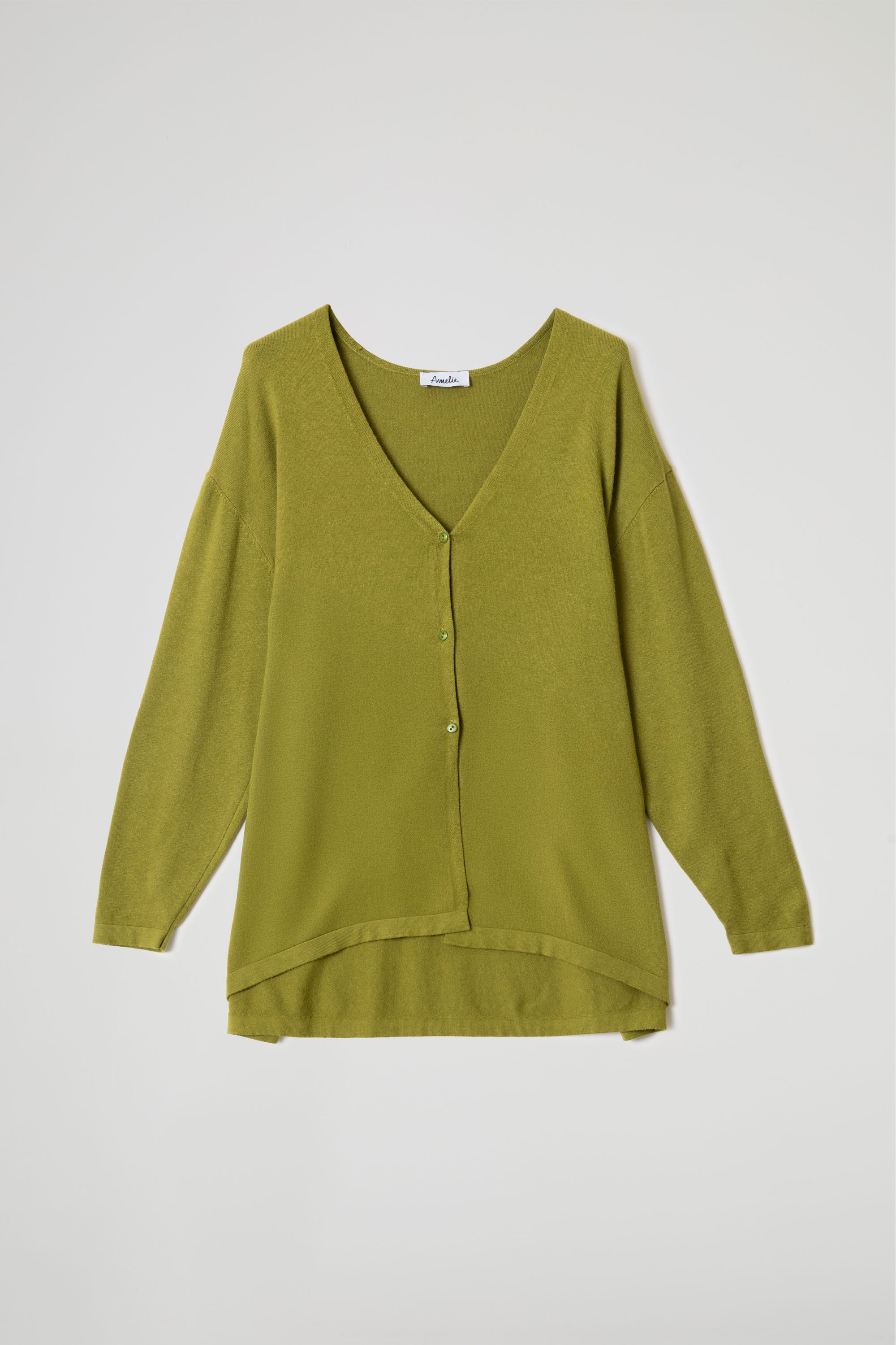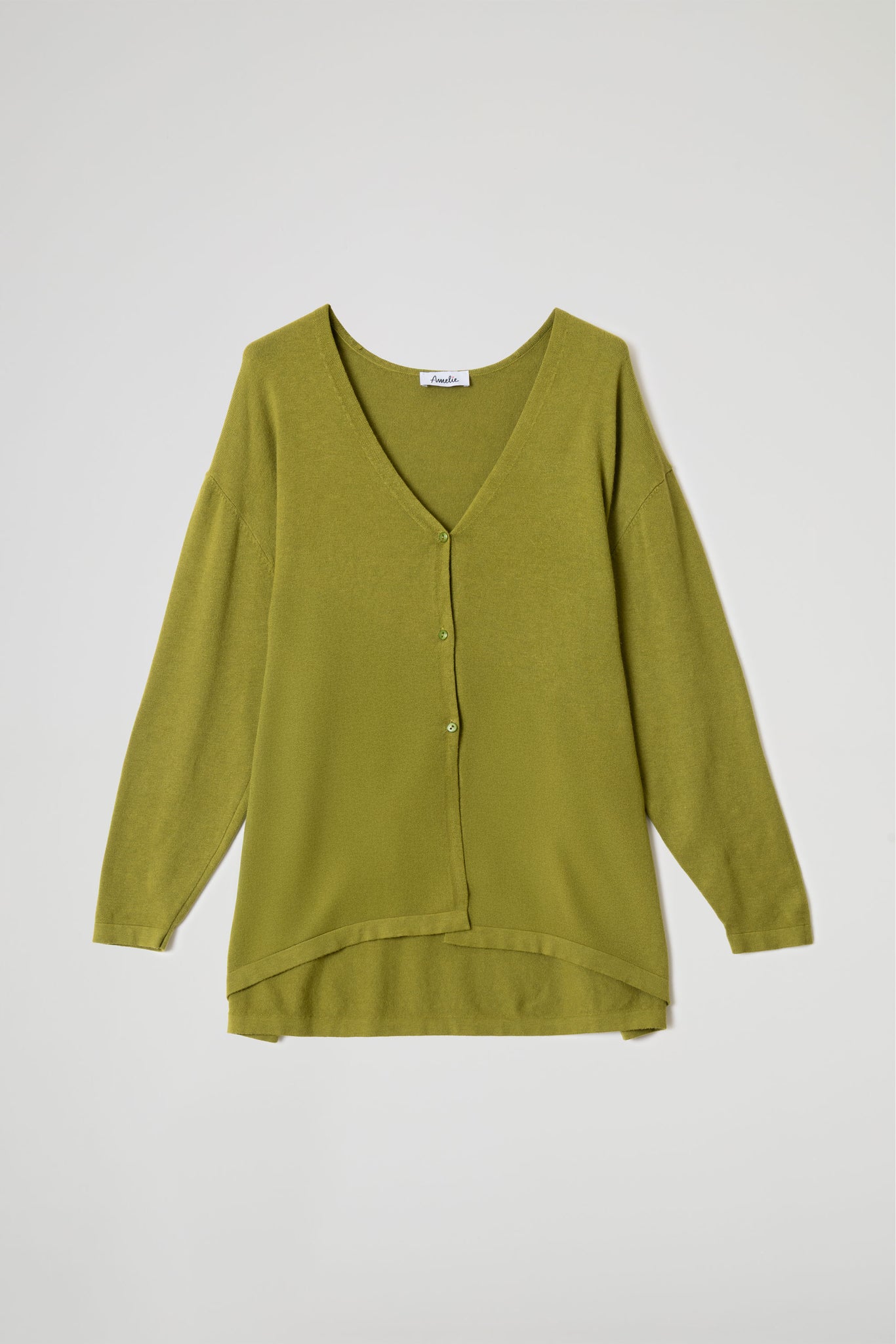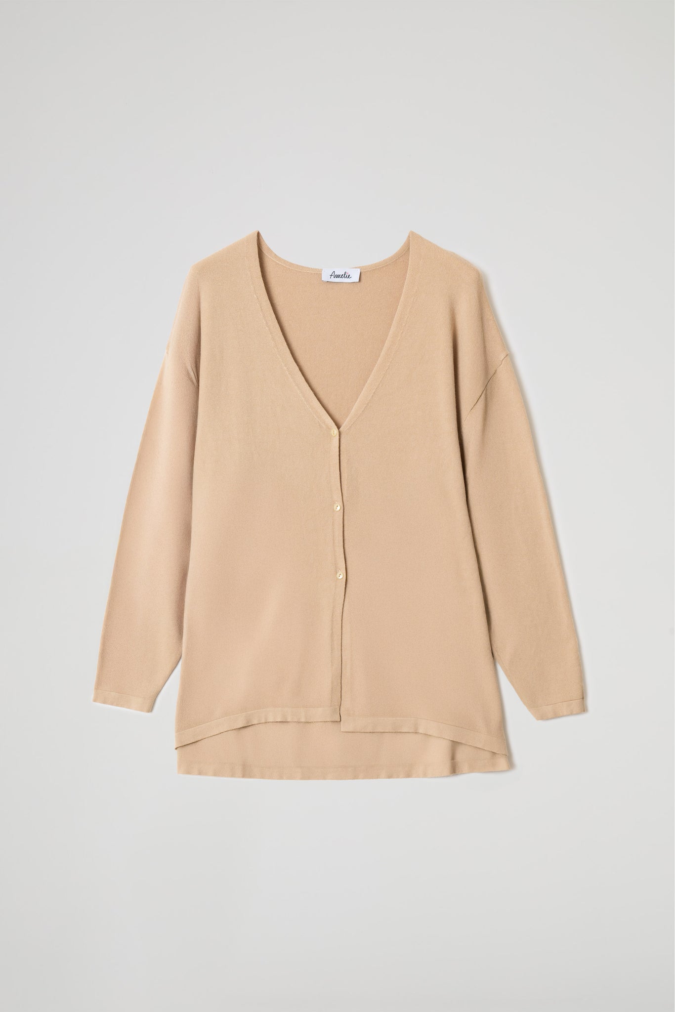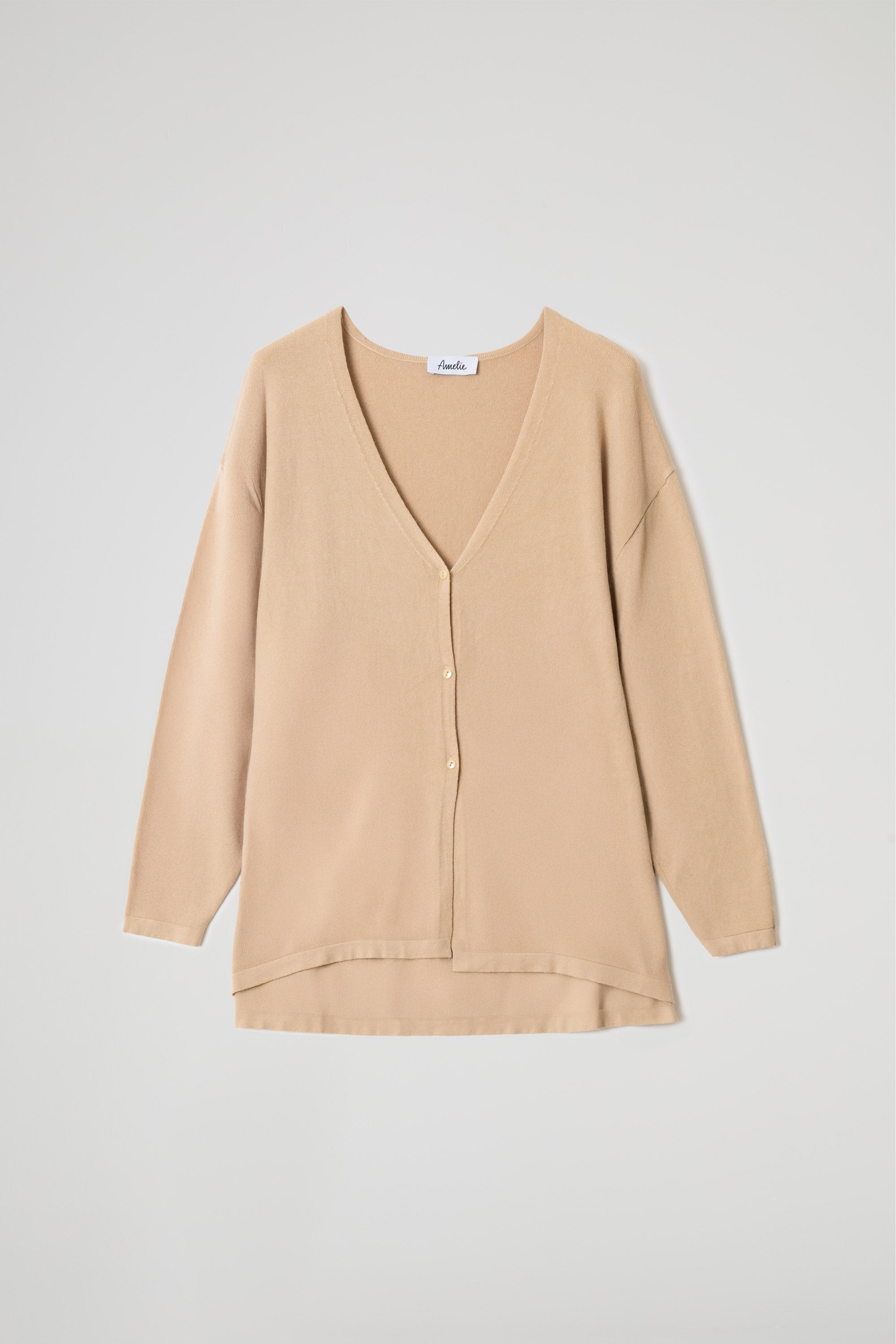 Cardigan over asimmetrico in morbida maglina di viscosa, scollo profondo a V, spalla scesa, manica lunga con orlo ribattuto su polsi, chiusura frontale con bottoncini, taglio stondato sul fondo con orlo ribattuto. Linea ampia e morbida
