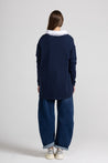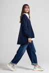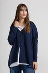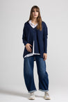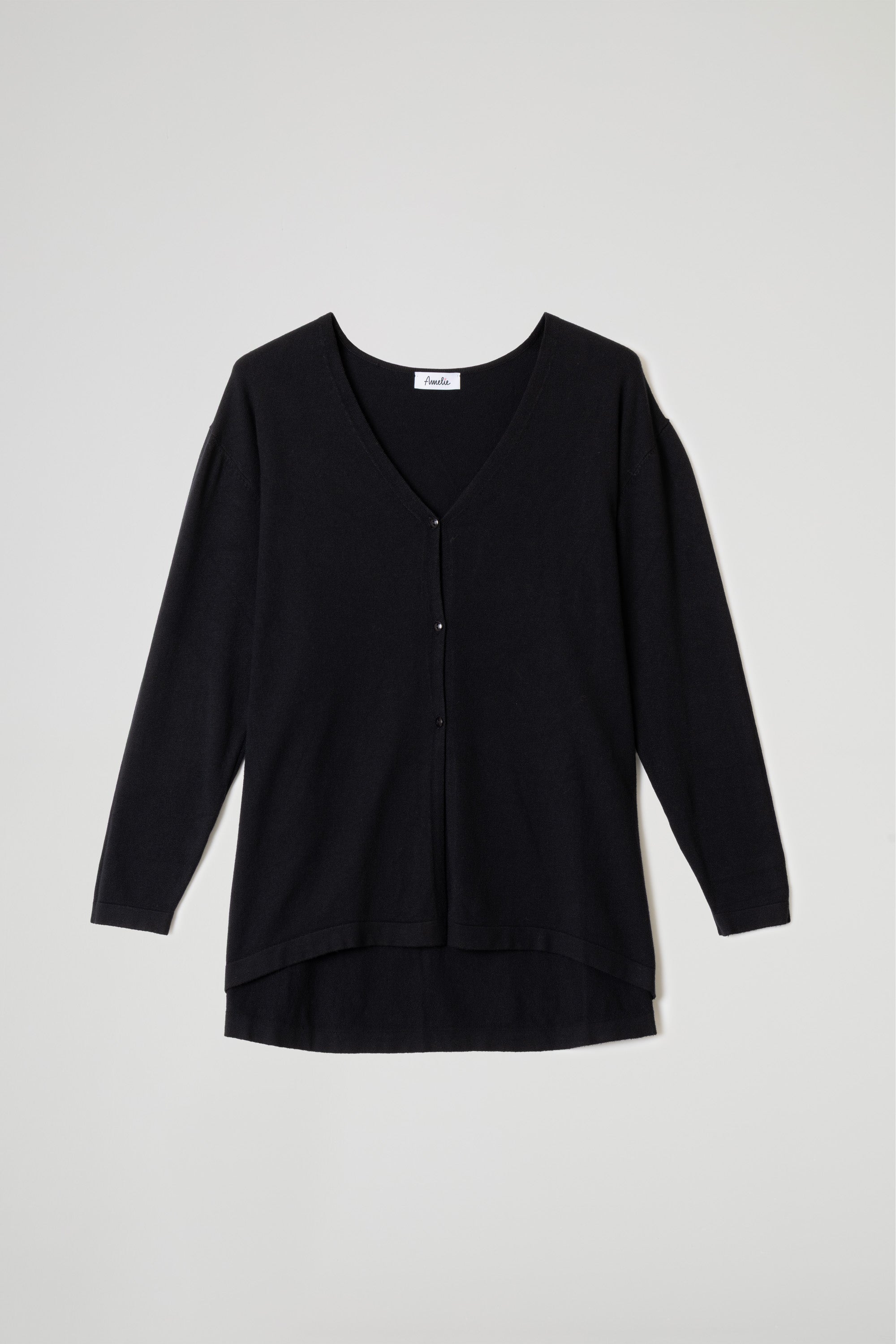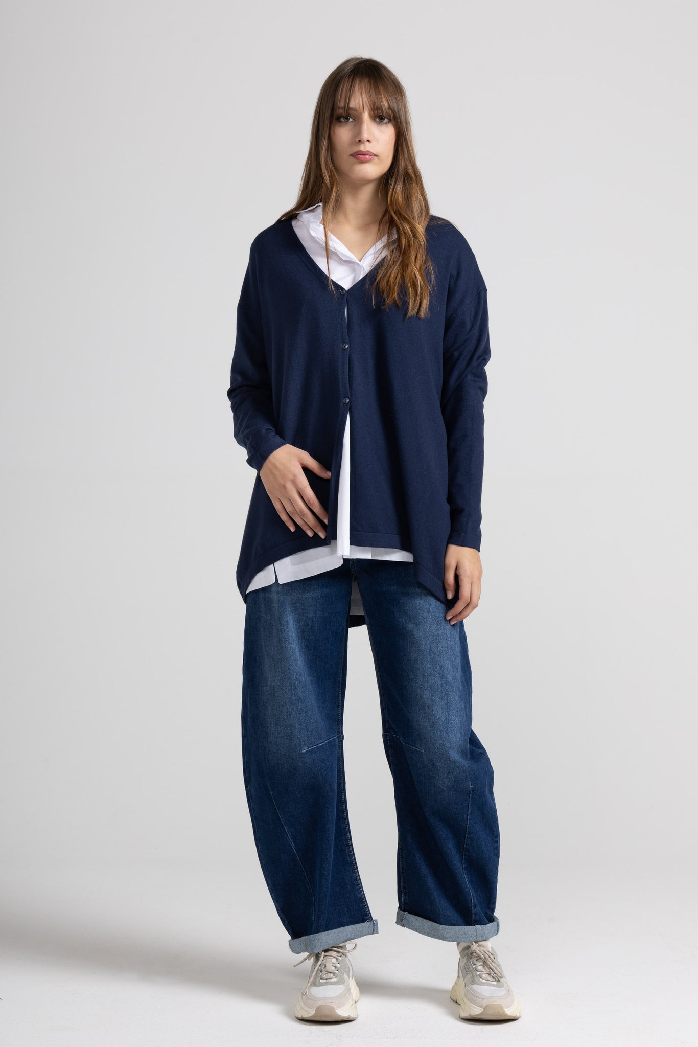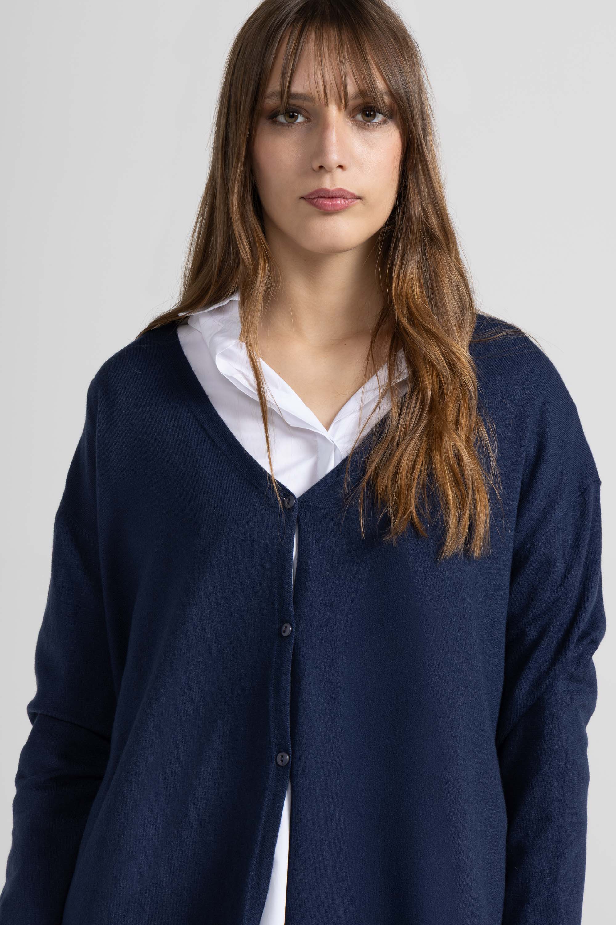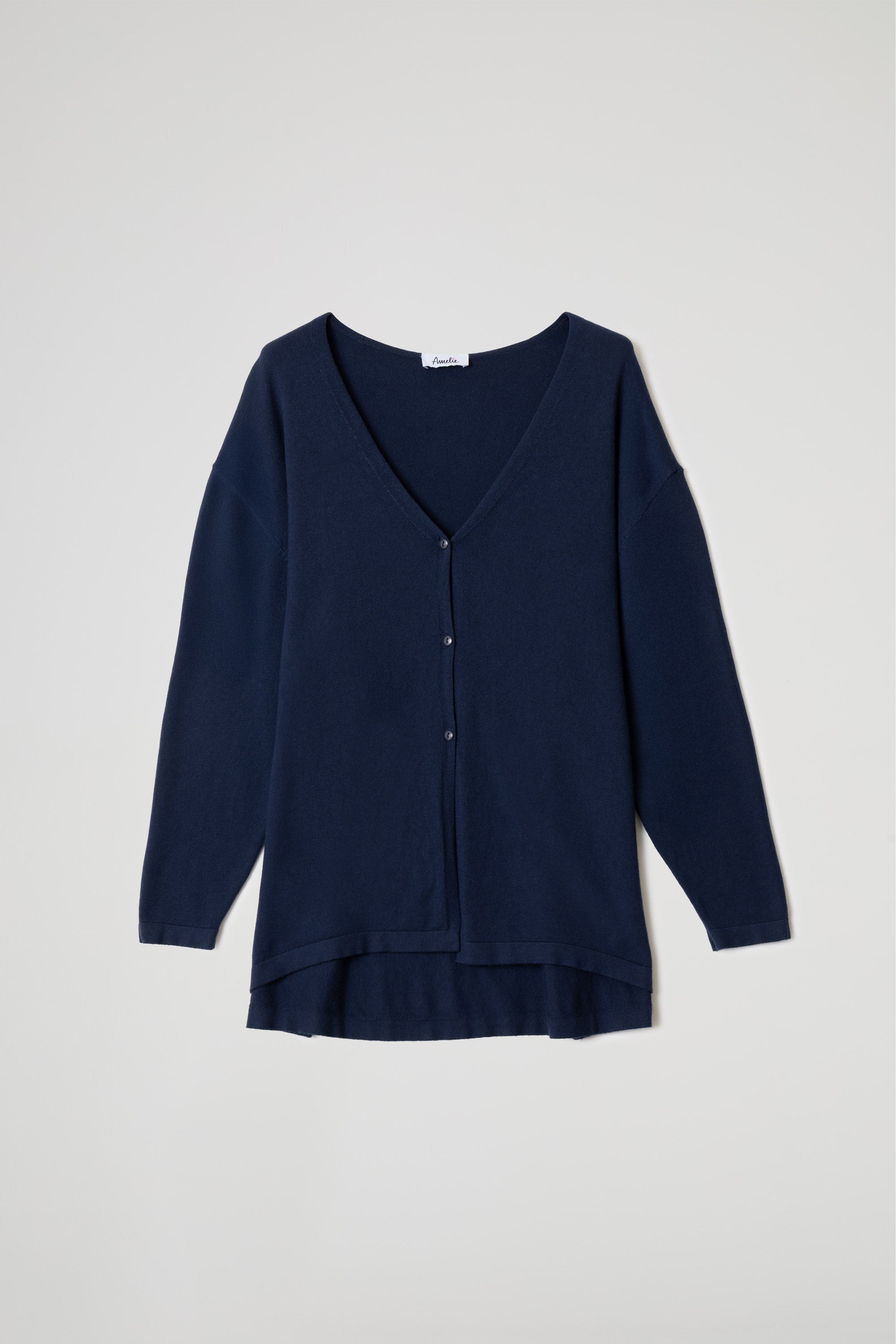 Cardigan over asimmetrico in morbida maglina di viscosa, scollo profondo a V, spalla scesa, manica lunga con orlo ribattuto su polsi, chiusura frontale con bottoncini, taglio stondato sul fondo con orlo ribattuto. Linea ampia e morbida