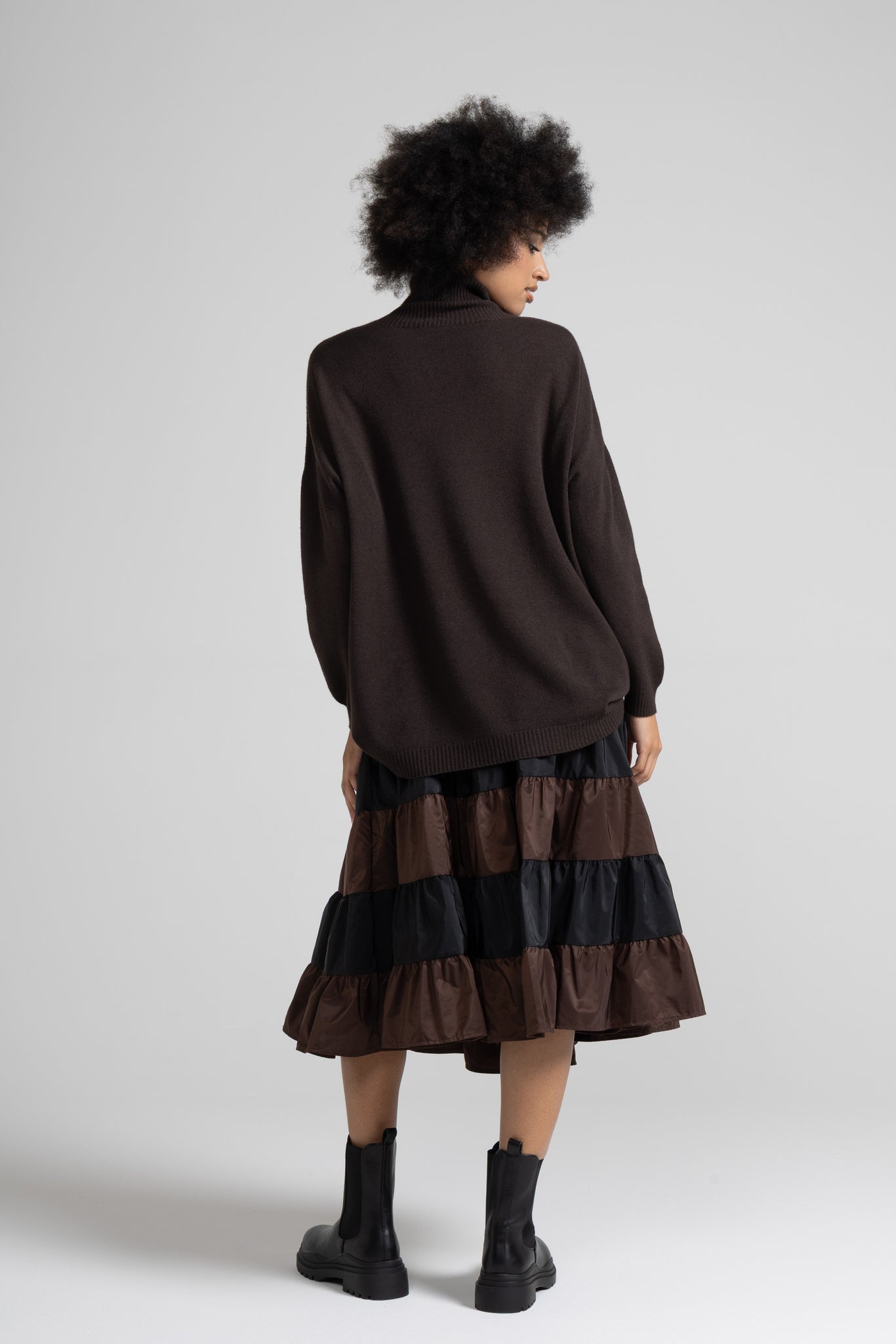 Collo alto e avvolgente a coste elasticizzate, spalle scese, maniche lunghe con polsini alti a  costine elasticizzate, lavorazione a bordo alto a costine compatte sul fondo. Linea ampia