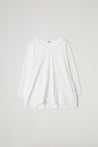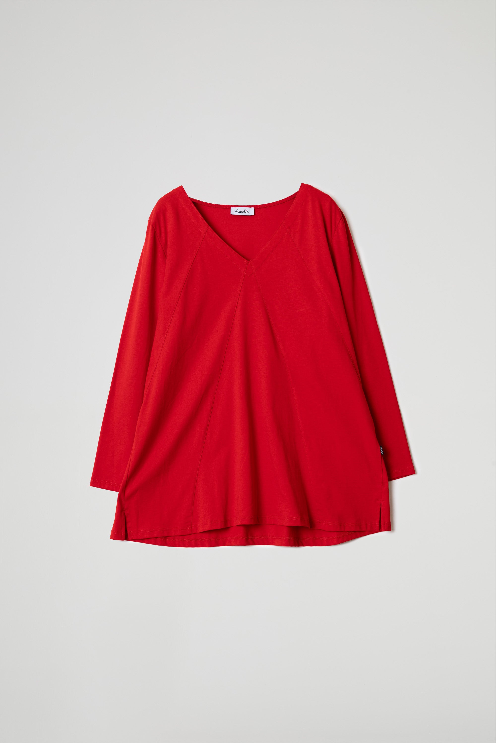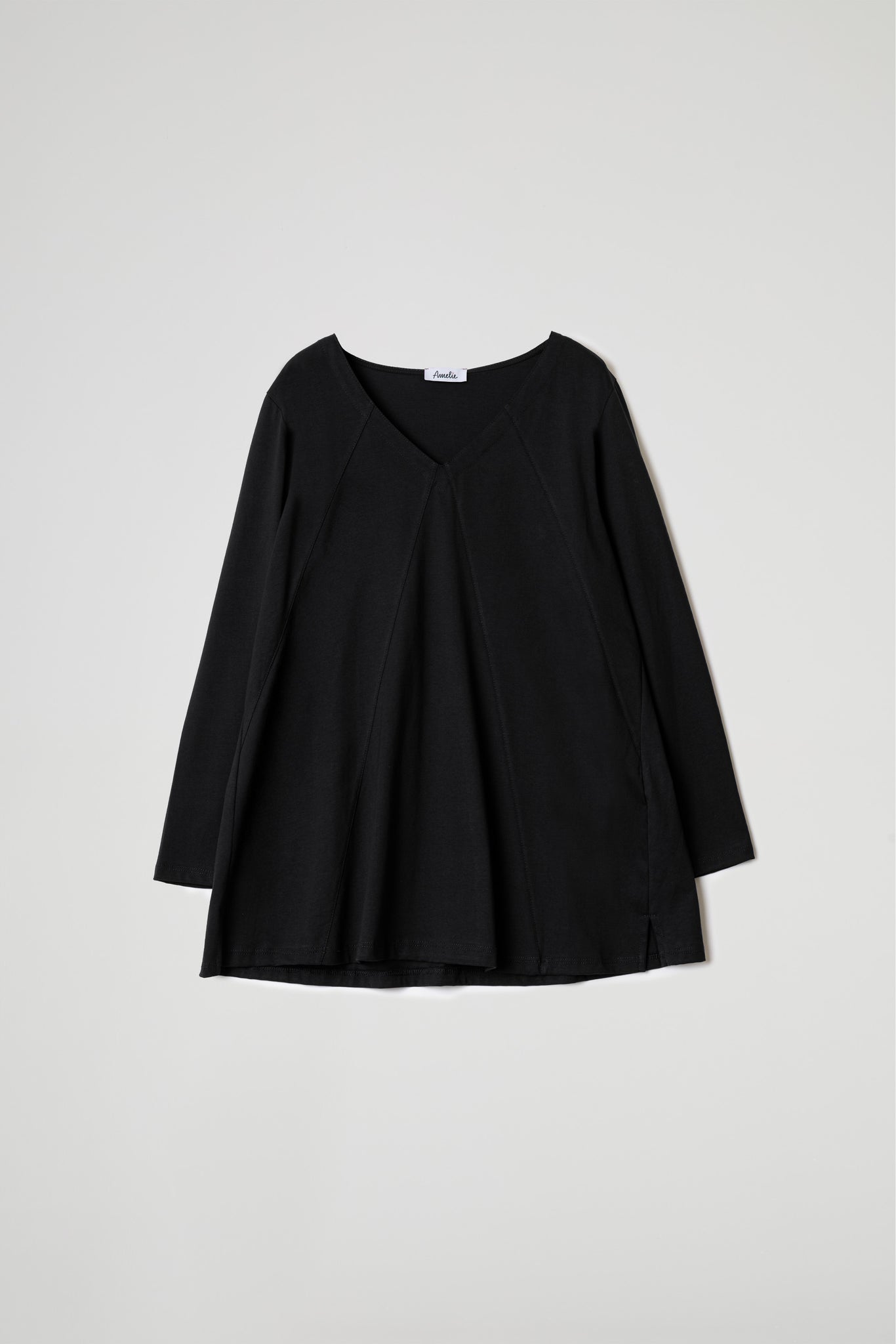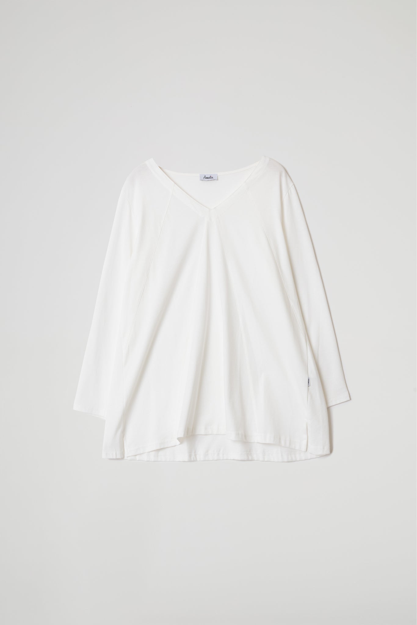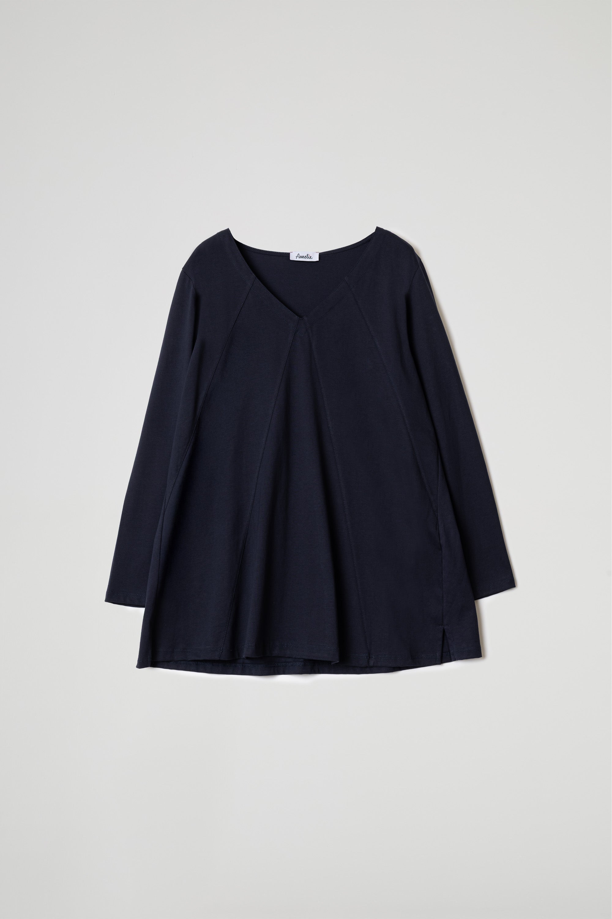 TOP IN JERSEY DI COTONE, LINEA A TRAPEZIO, SCOLLO A V, MANICA LUNGA, DETTAGLIO IMPUNTIRE SU TUTTA LA LINEA FORNTALE DEL TOP.