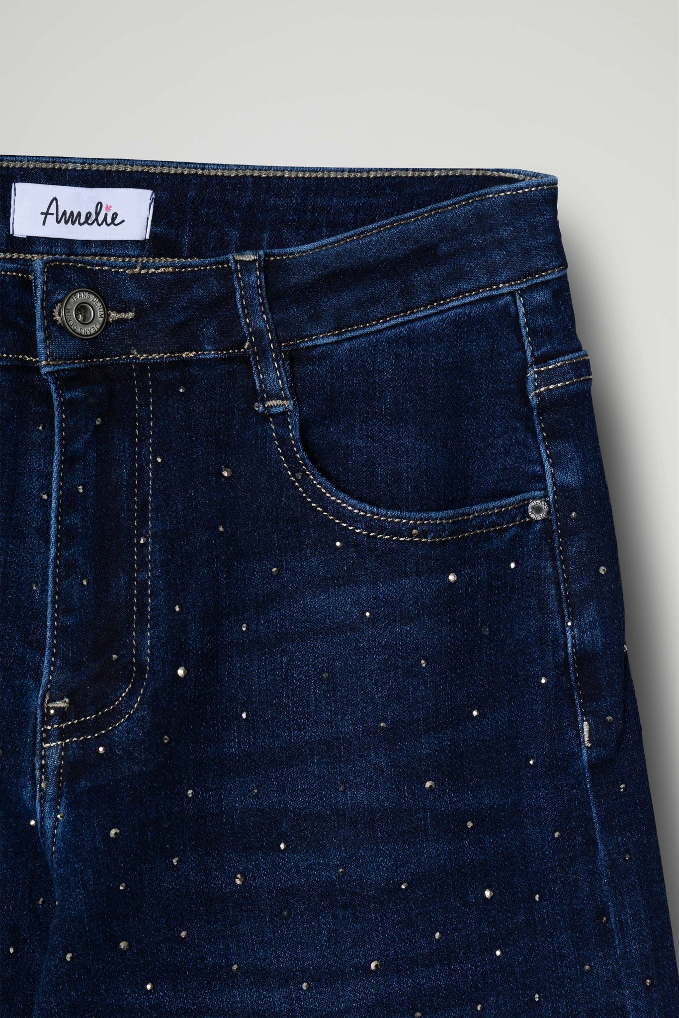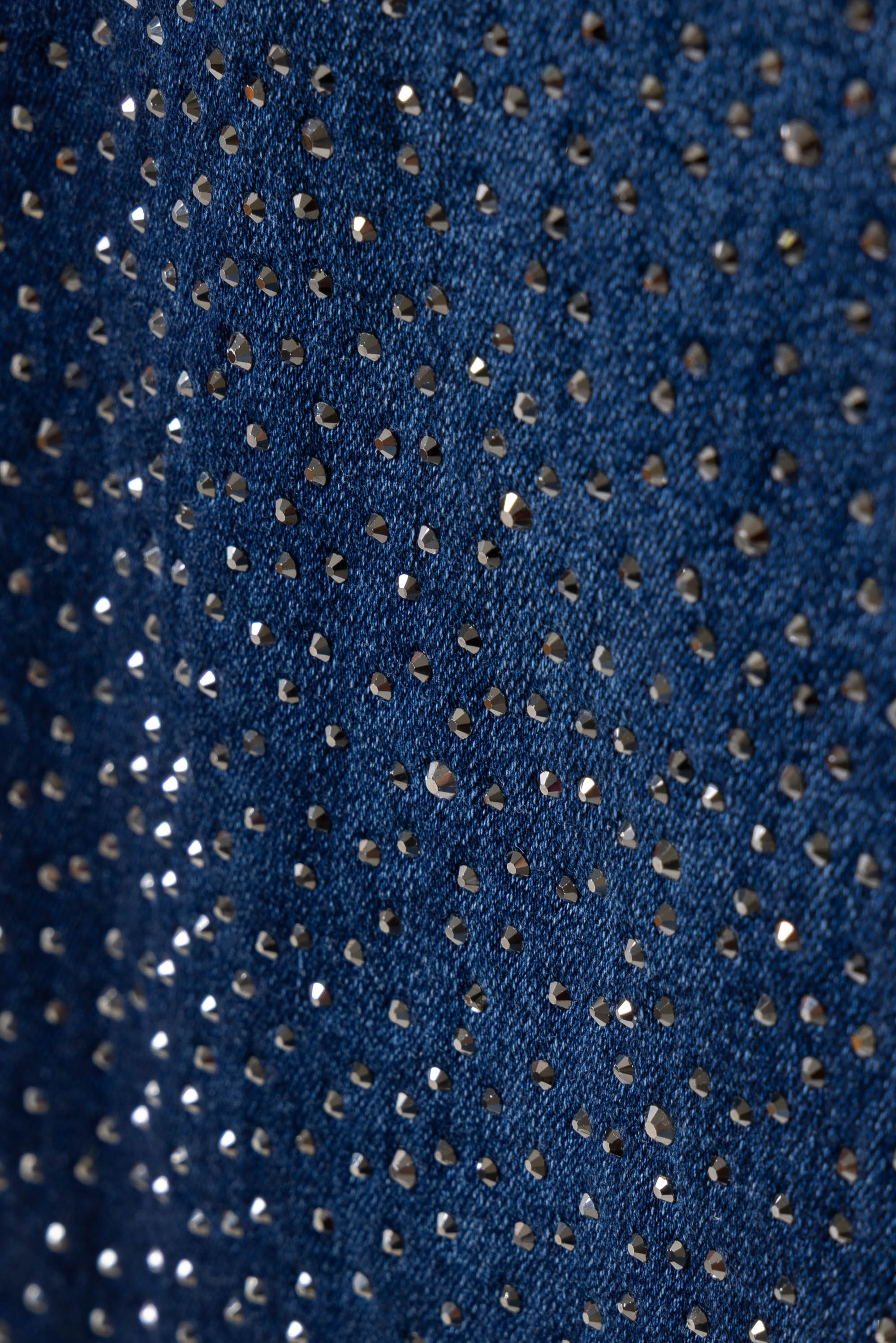 La superficie del denim è impreziosita da delicati strass luminosi, distribuiti su tutta la gamba per creare un elegante effetto brillante che rende il capo originale e di tendenza. Il classico design a cinque tasche, con chiusura con bottone e zip e passanti per cintura, mantiene tutto il fascino intramontabile del jeans.