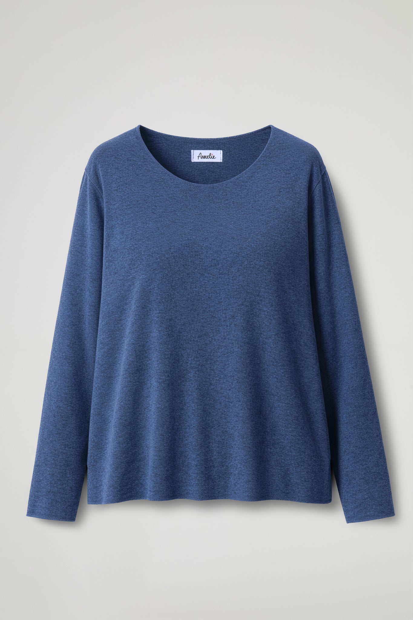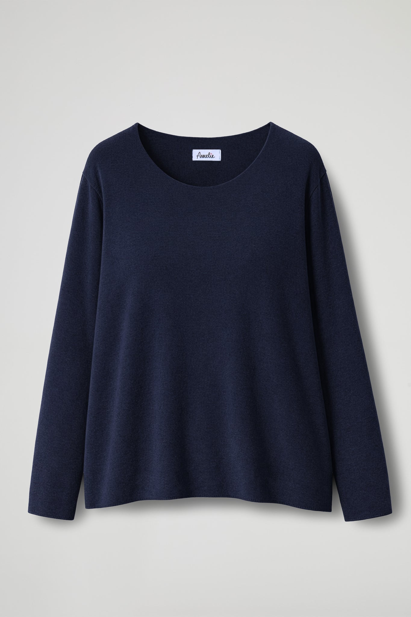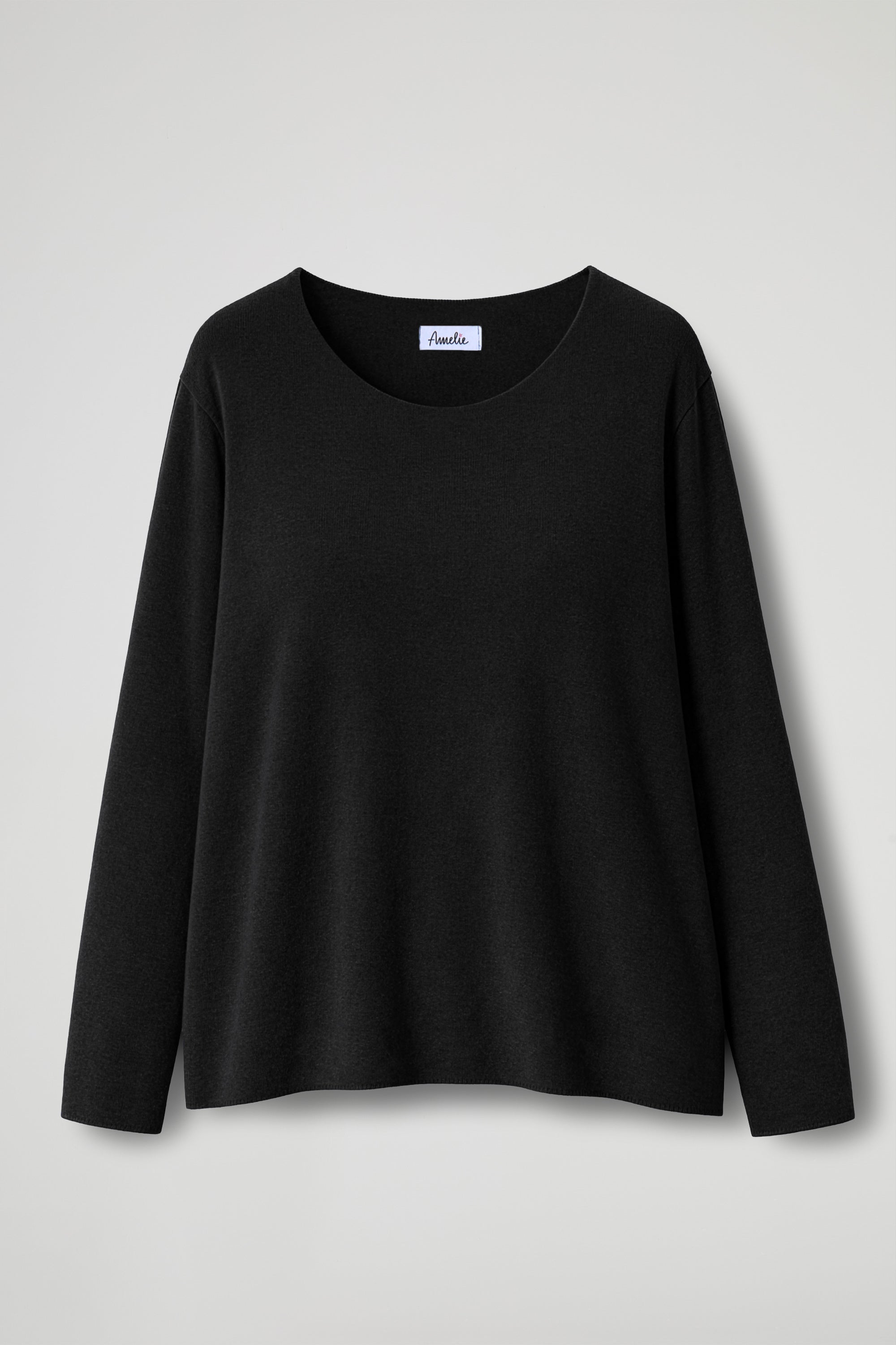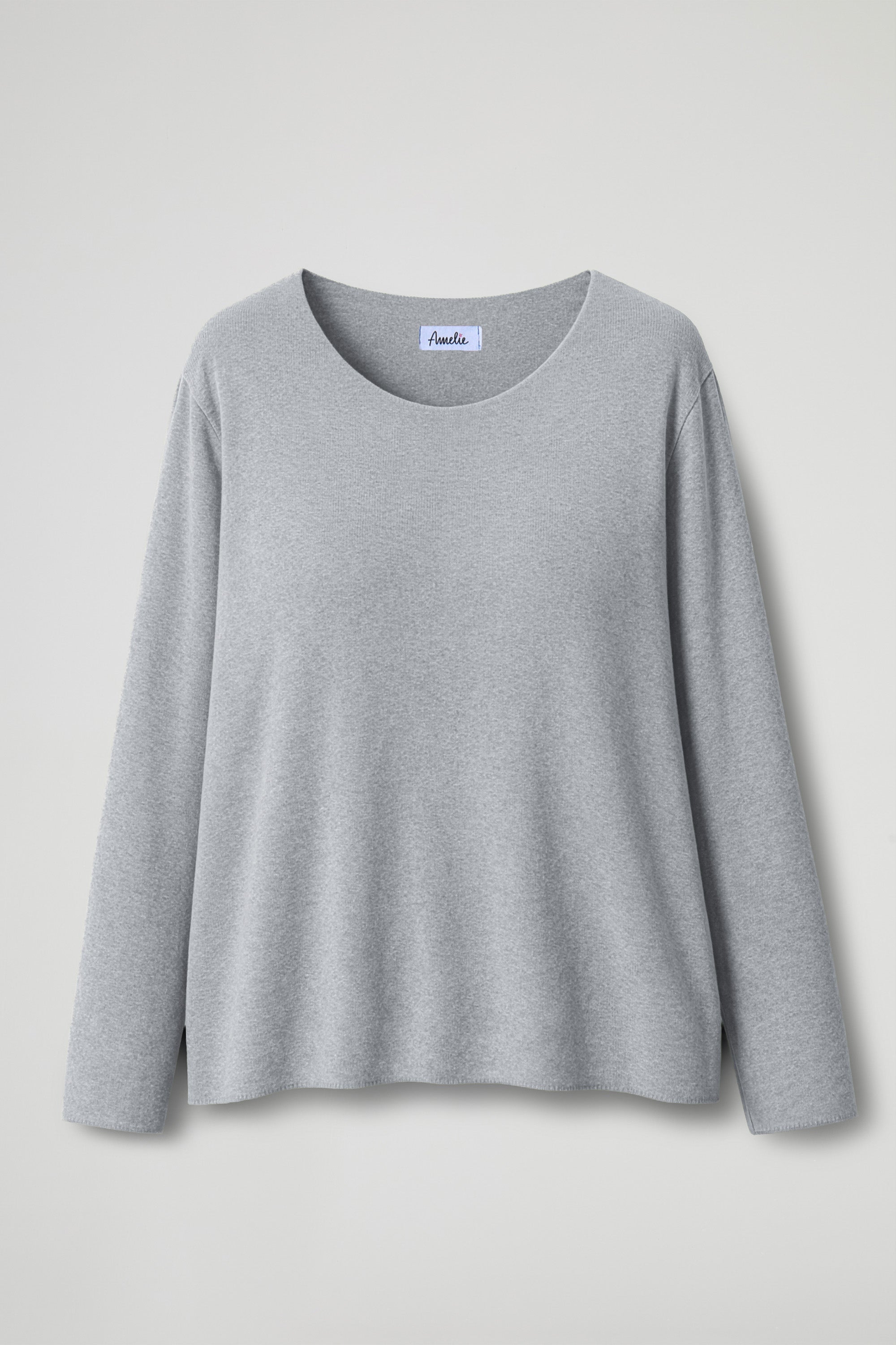 Maglia  in tessuto di viscosa, collo ampio , spalle leggermente scese manica lunga, taglio leggermente stondato sul fondo. Linea morbida