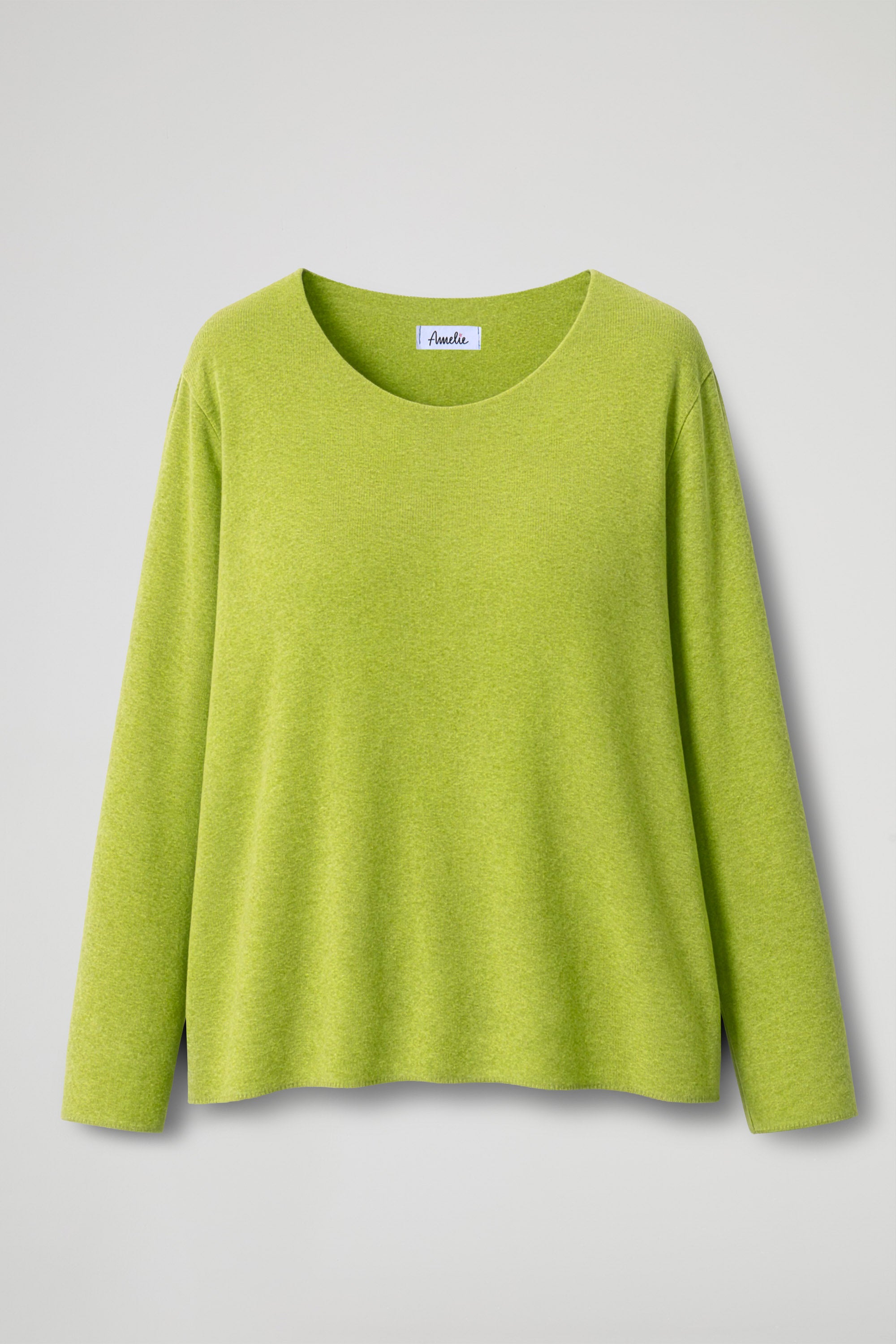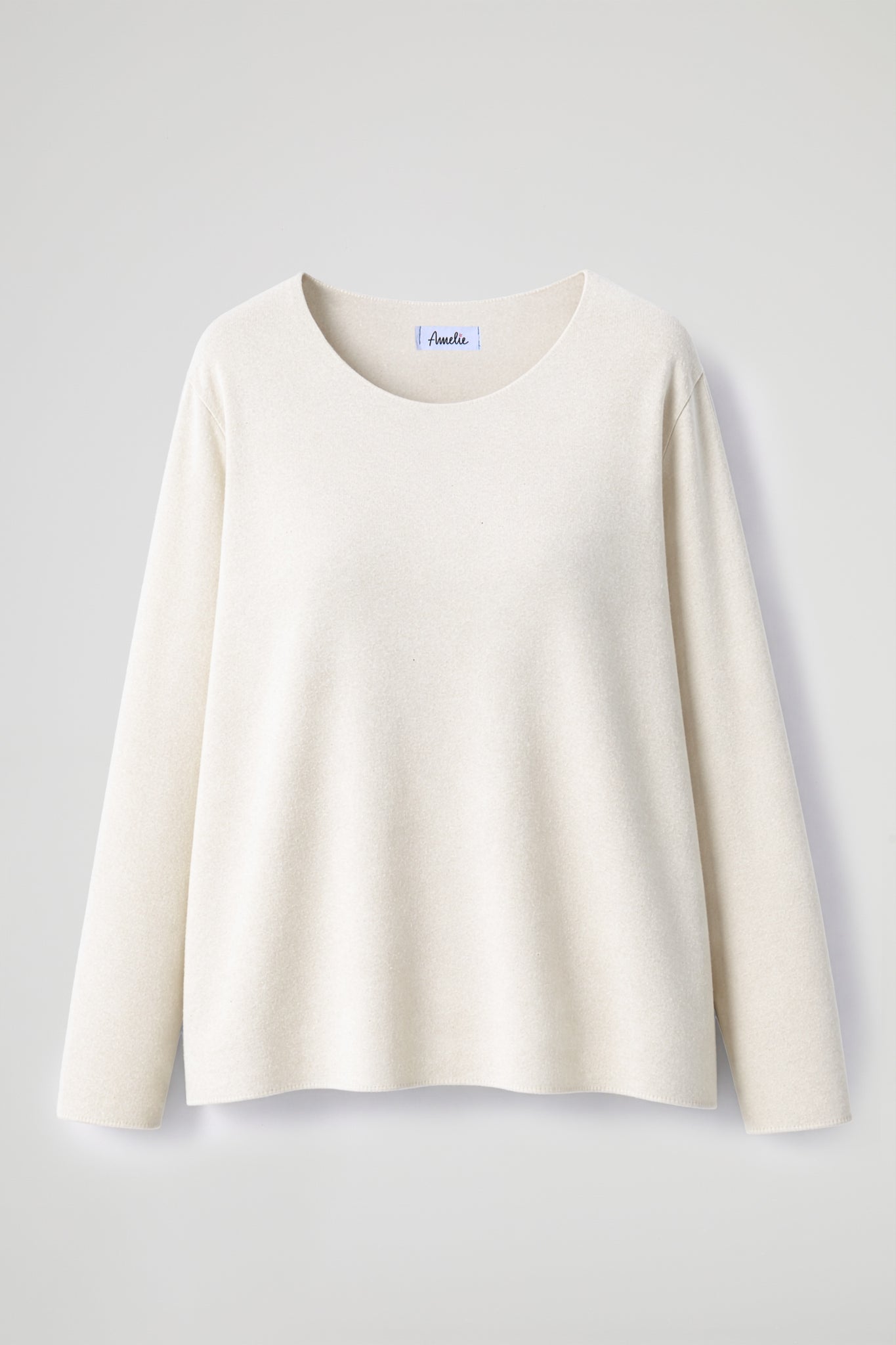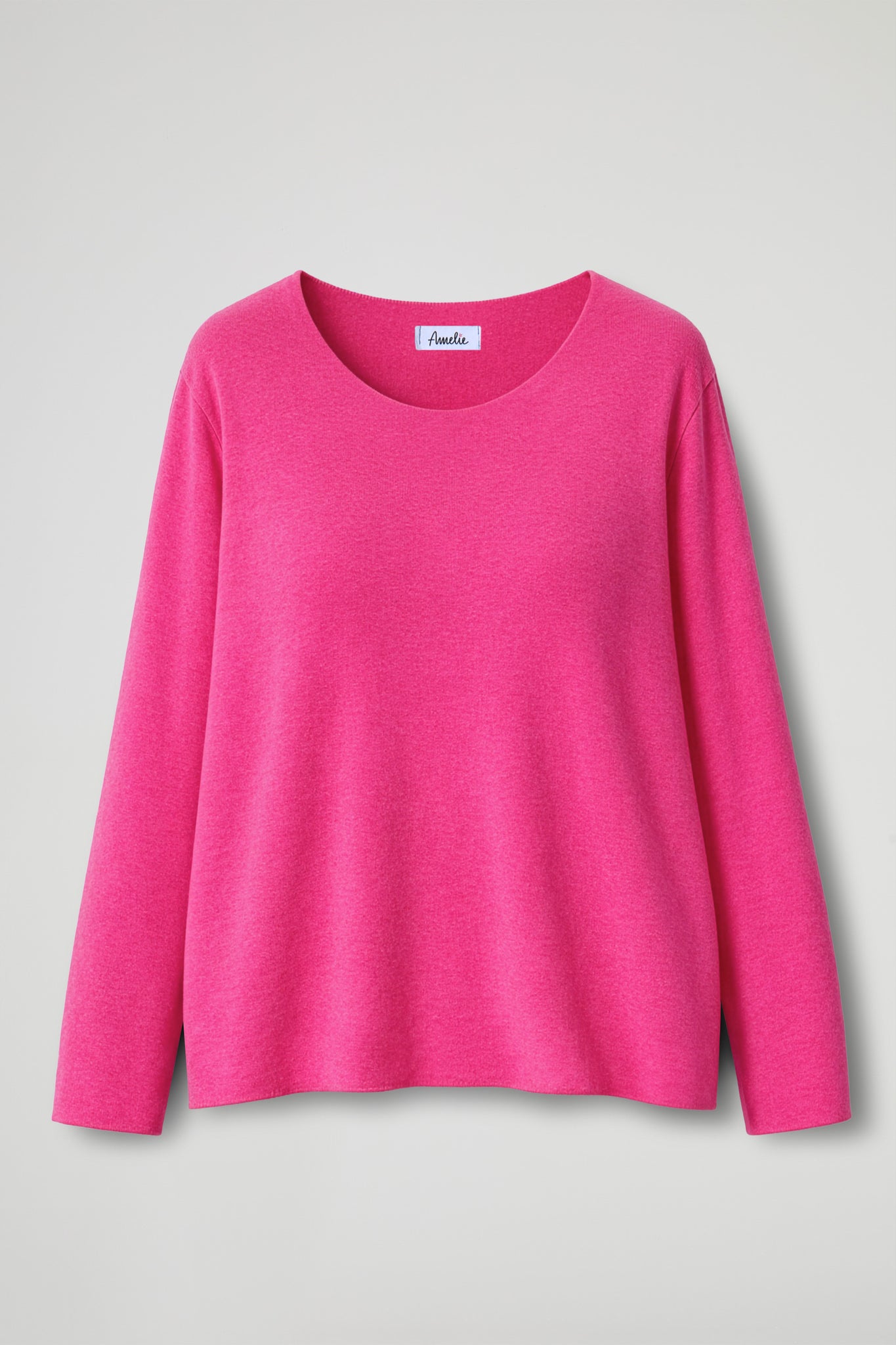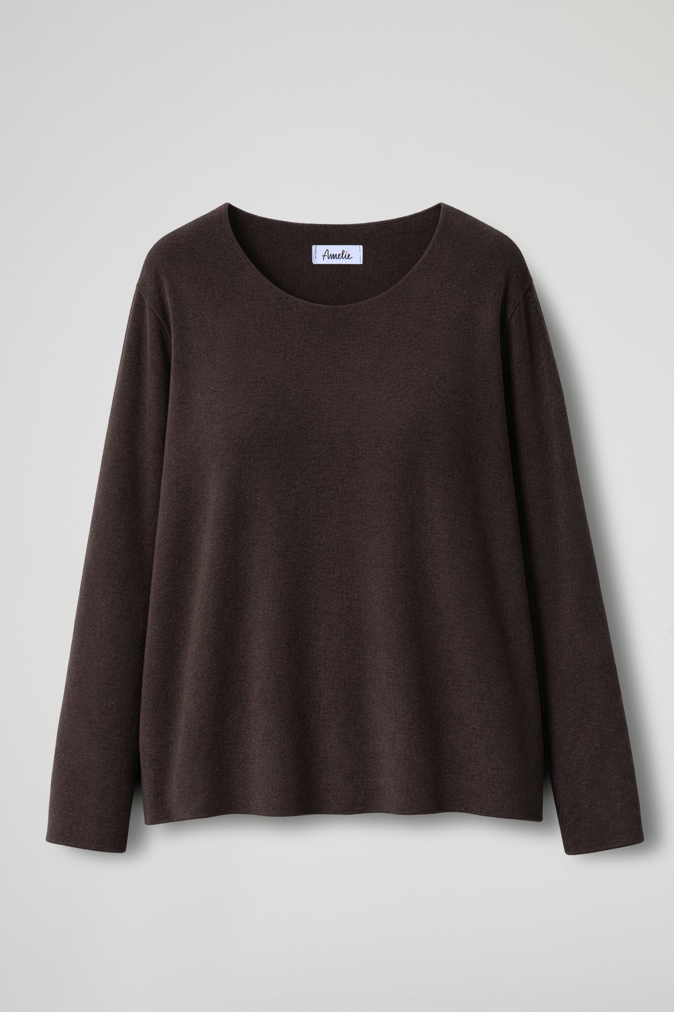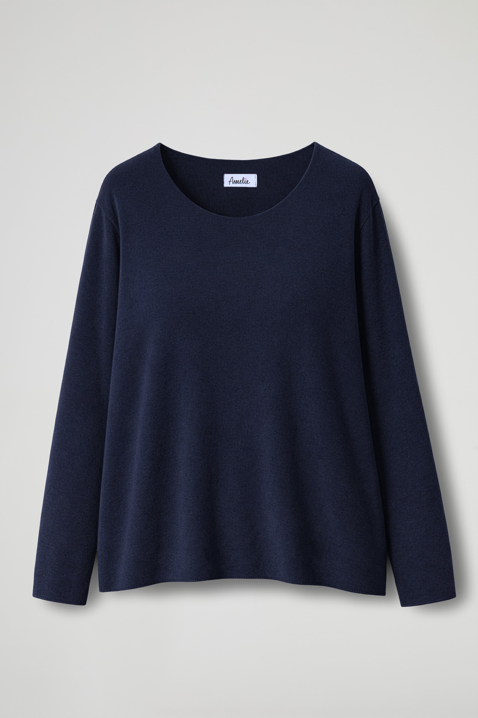 Maglia  in tessuto di viscosa, collo ampio , spalle leggermente scese manica lunga, taglio leggermente stondato sul fondo. Linea morbida