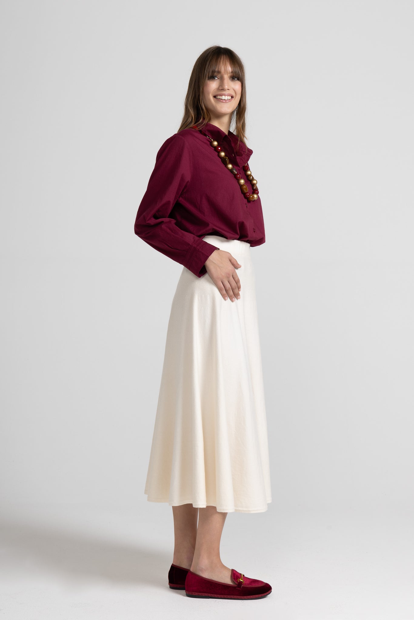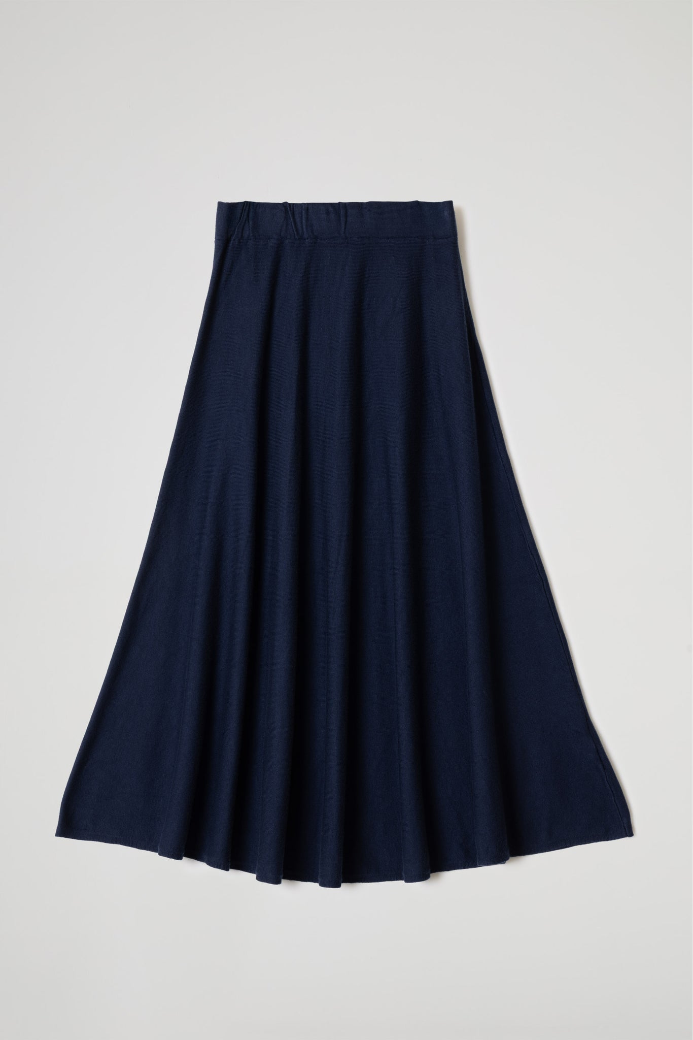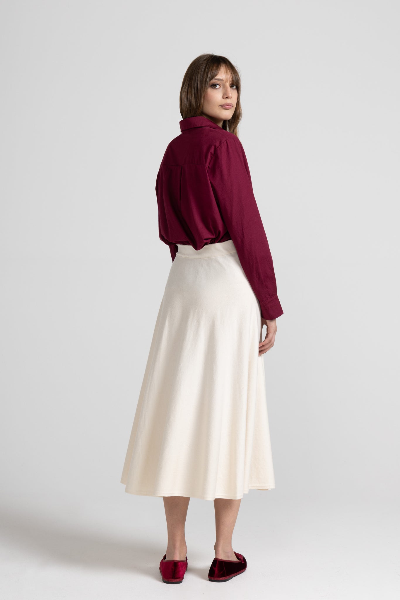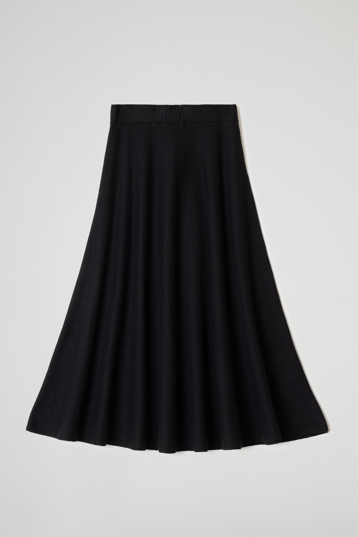 Gonna midi in morbida maglina di viscosa a trama fine, cintura liscia con elastico in vita, linea svasata e ampia che si apre gradualmente verso il fondo, creando un effetto morbido e leggermente ondulato. Linea morbida