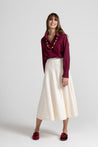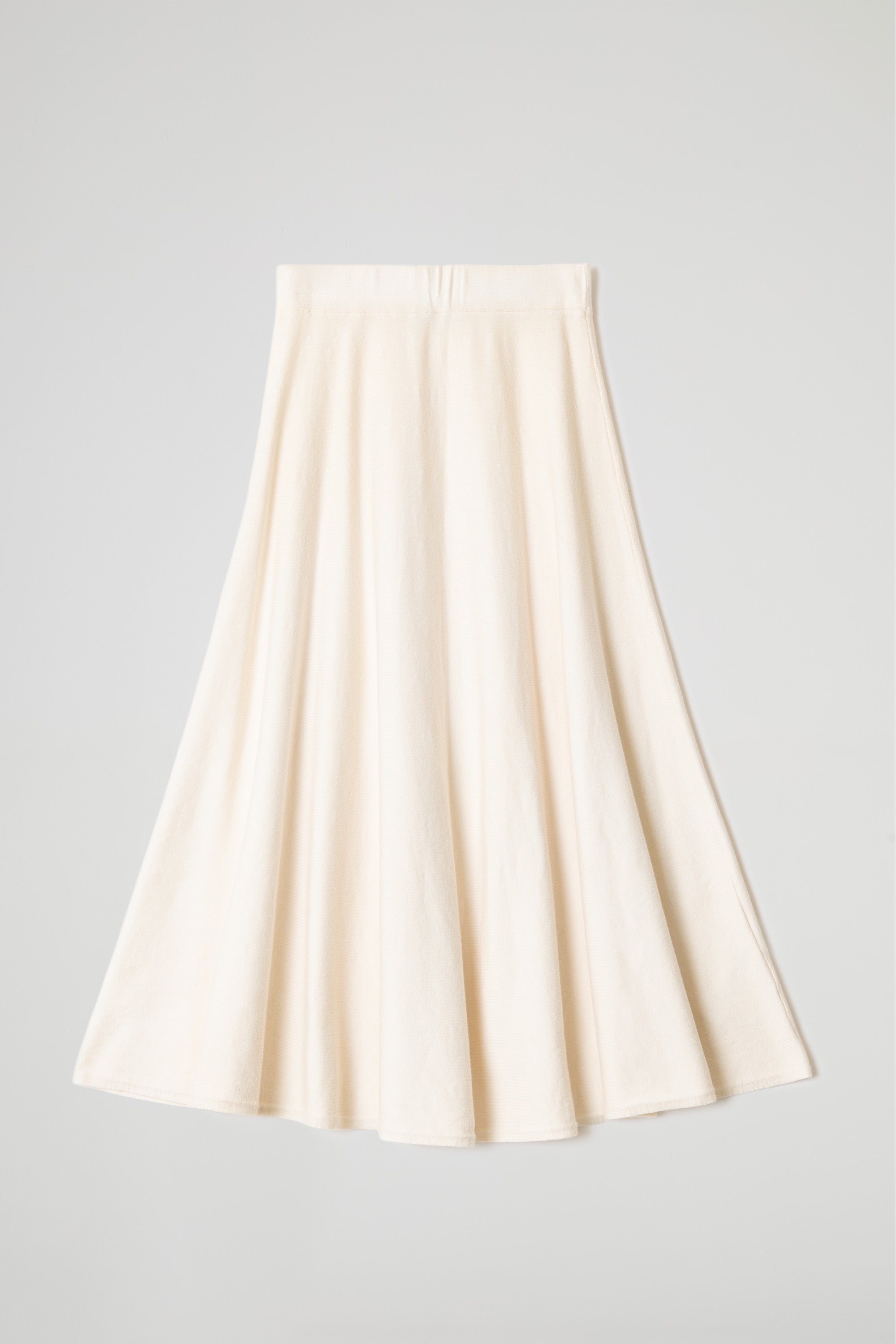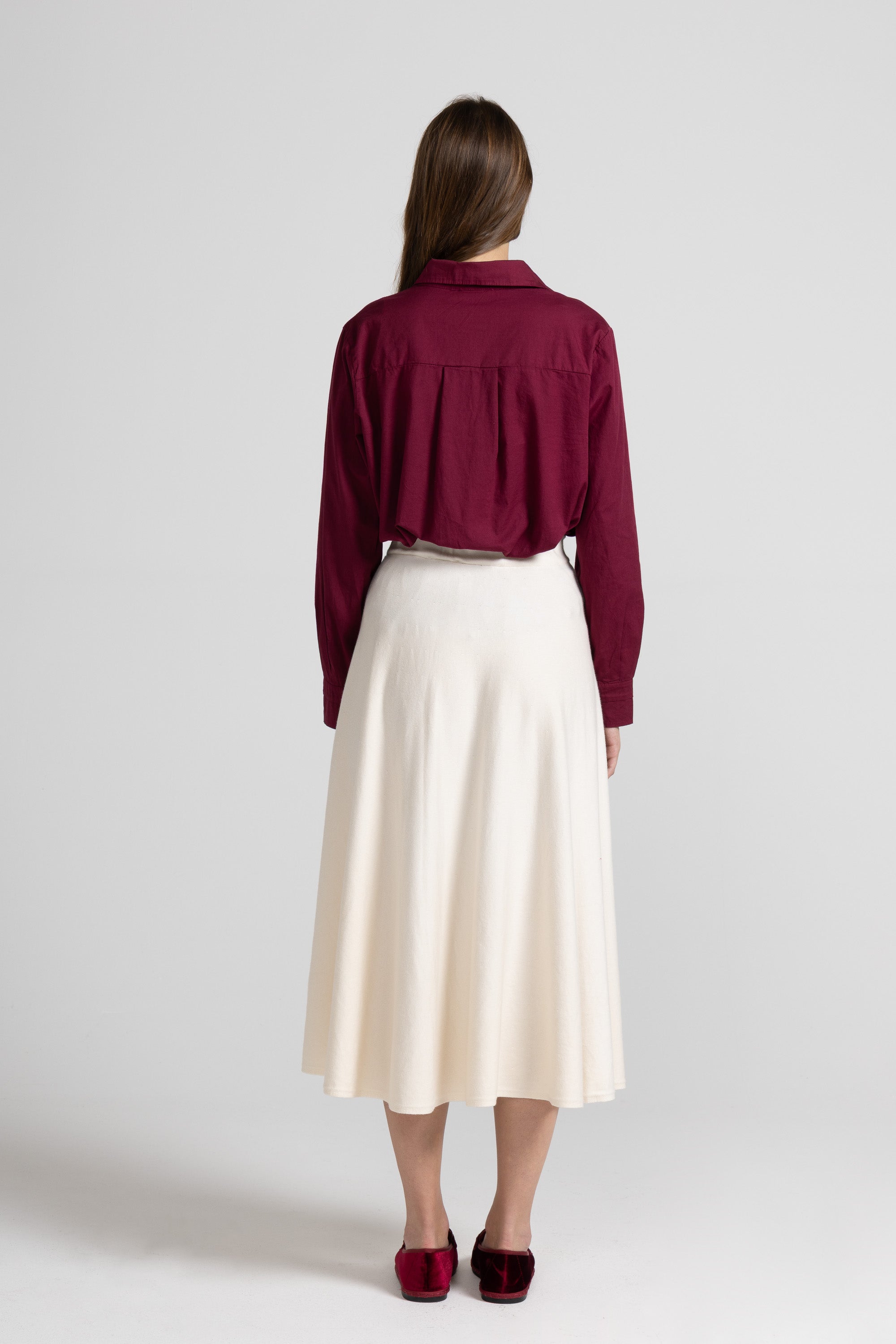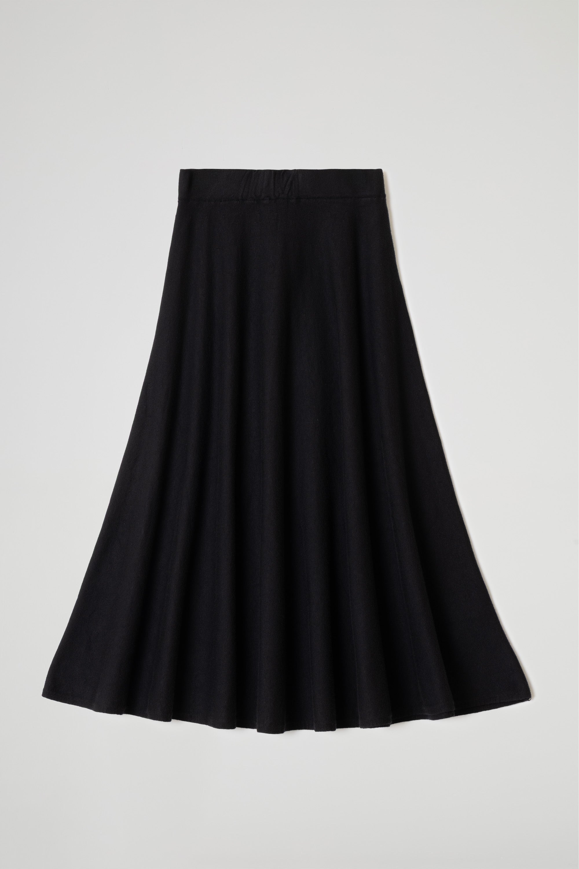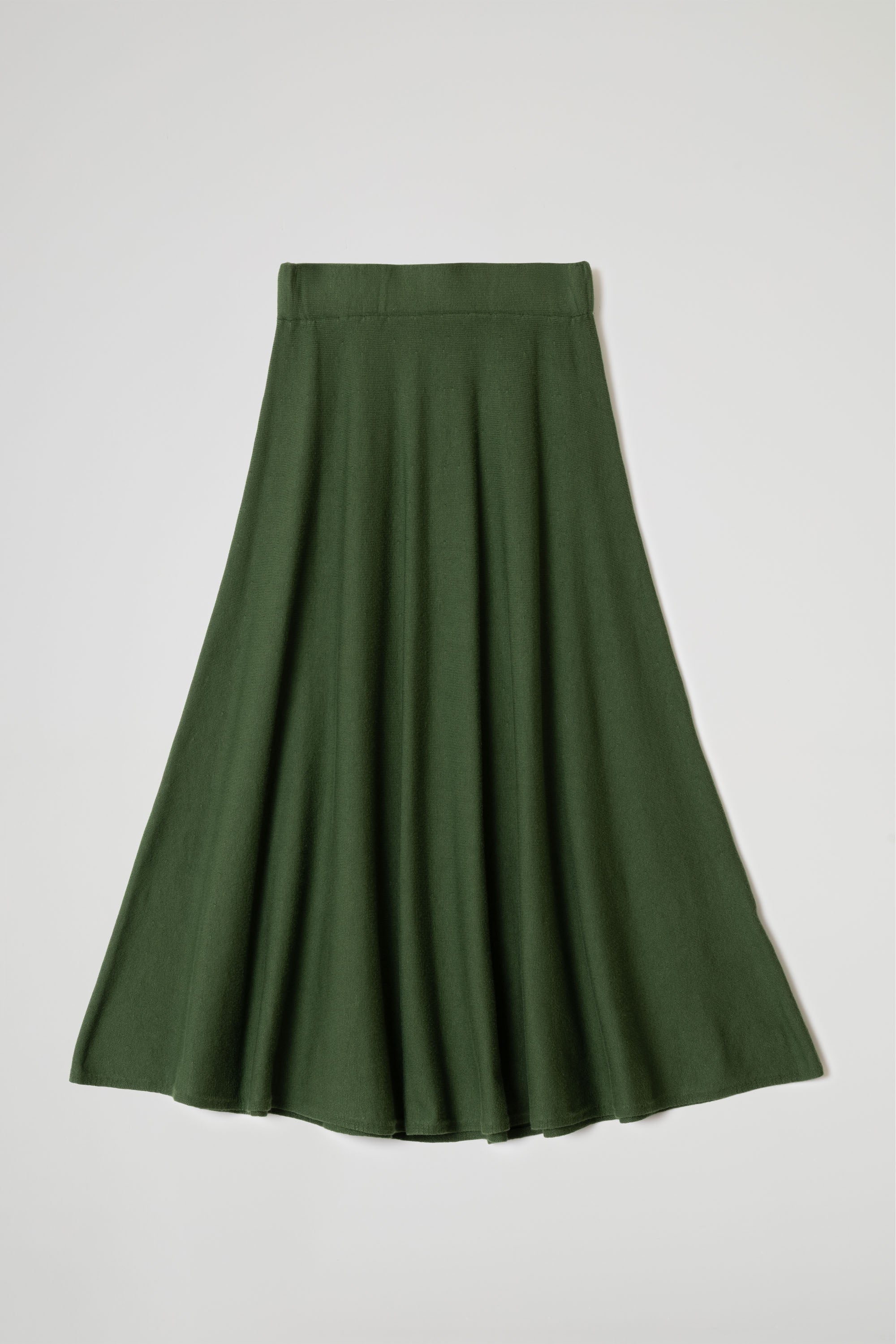 Gonna midi in morbida maglina di viscosa a trama fine, cintura liscia con elastico in vita, linea svasata e ampia che si apre gradualmente verso il fondo, creando un effetto morbido e leggermente ondulato. Linea morbida