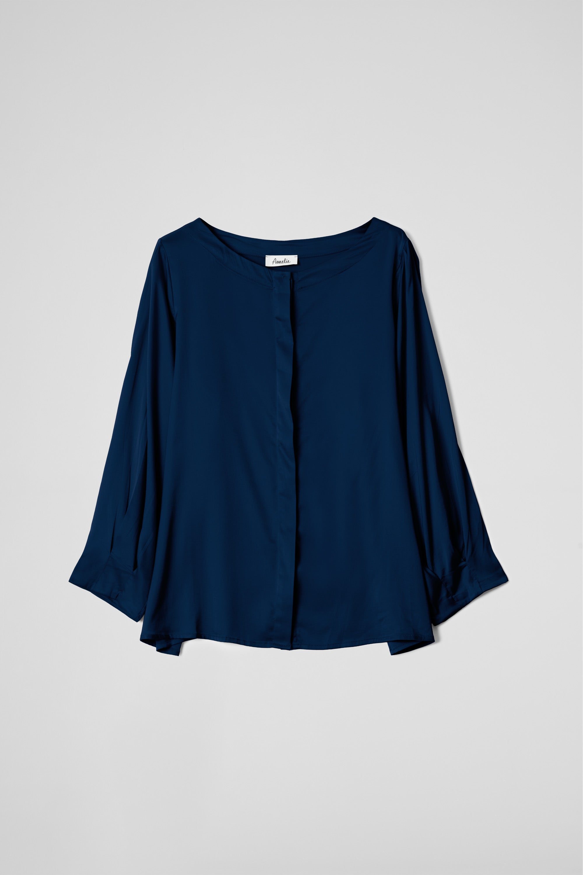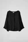 Blusa dalla linea ampia e svasata, collo tondo ampio e pulito, maniche lunghe ampie con polsino sagomato e piccole pieghe, chiusura con bottoni  coperta sul davanti. Linea morbida e fluida.