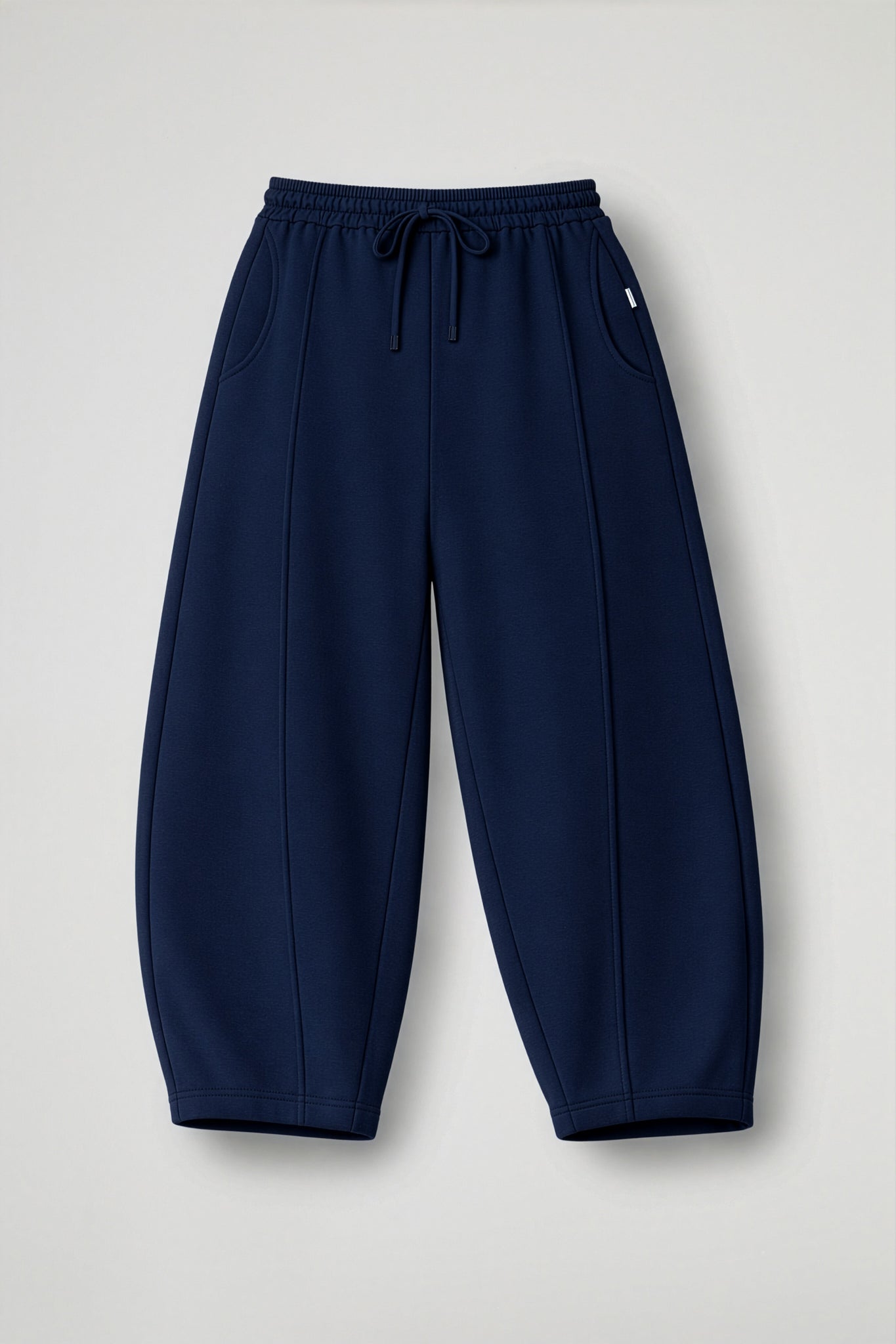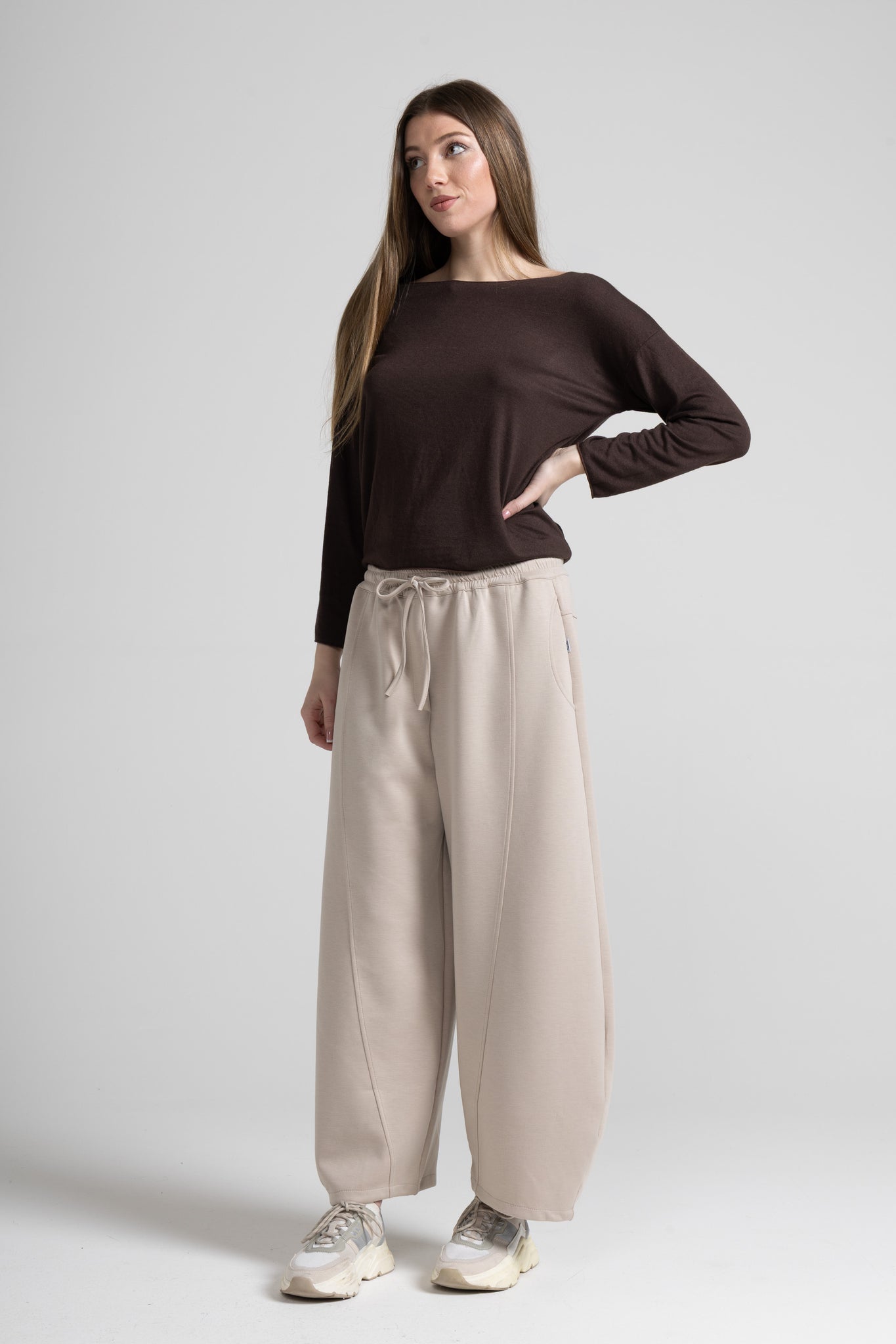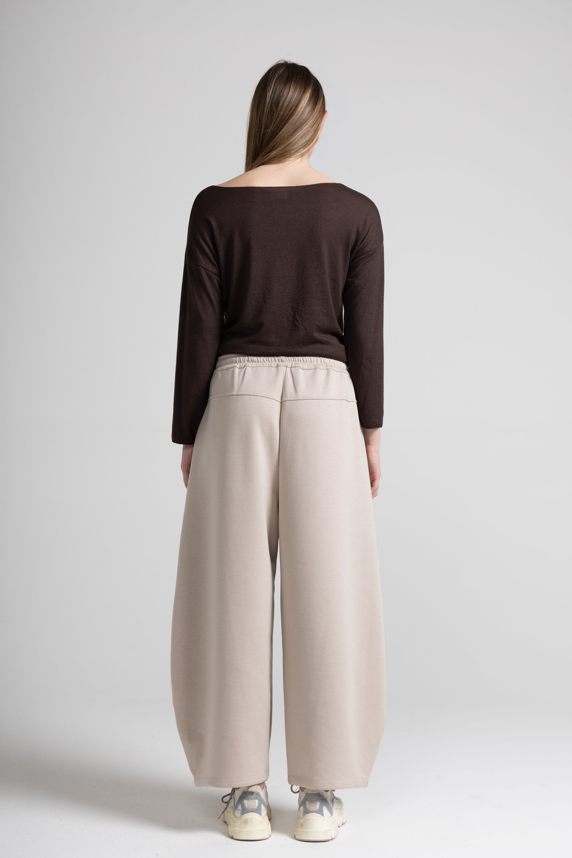 Taglio baggy, vita elastica con coulisse regolabile in tono, due tasche laterali, cucitura centrale frontale, orlo ribattuto sul fondo. Linea ampia