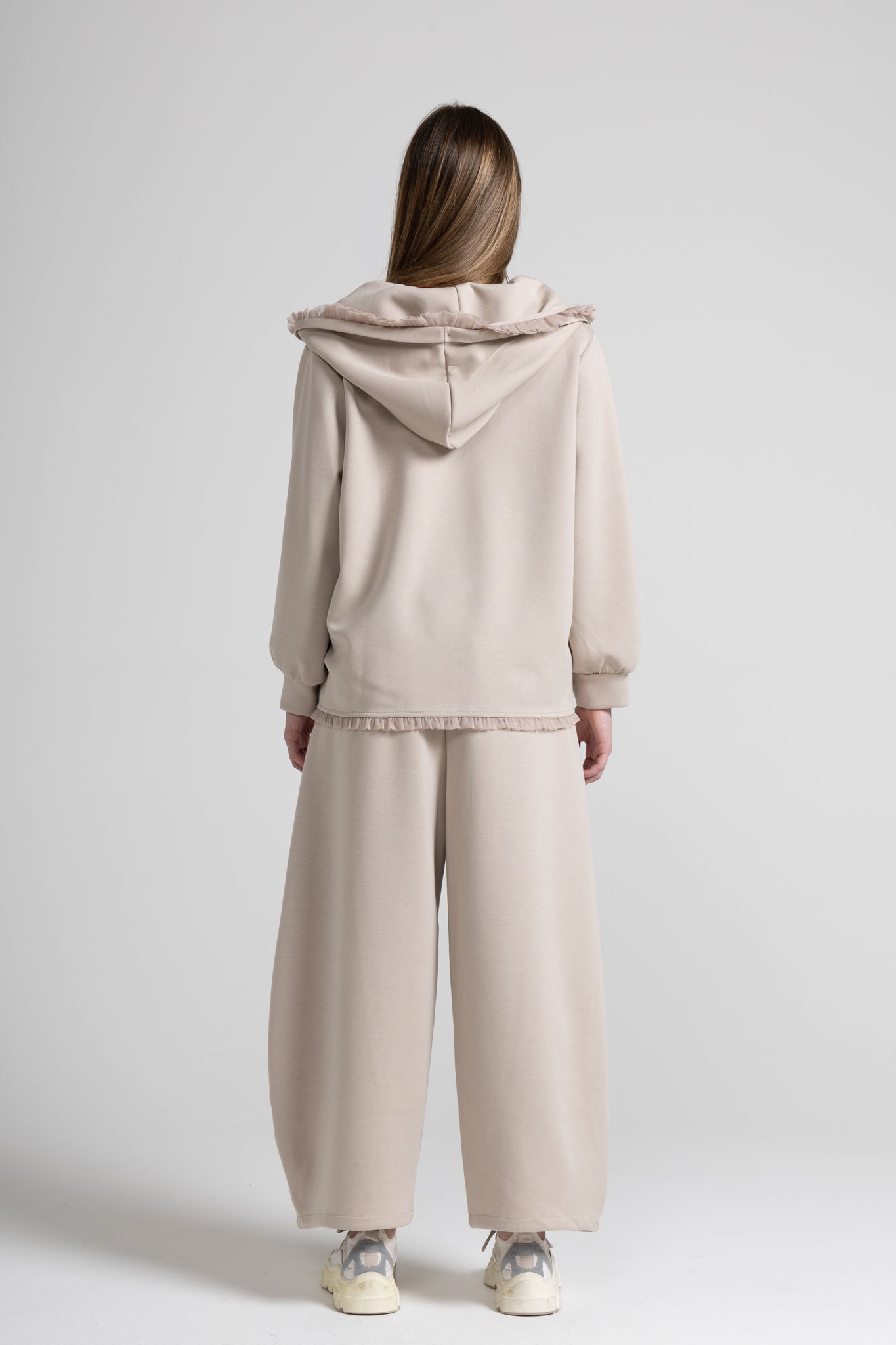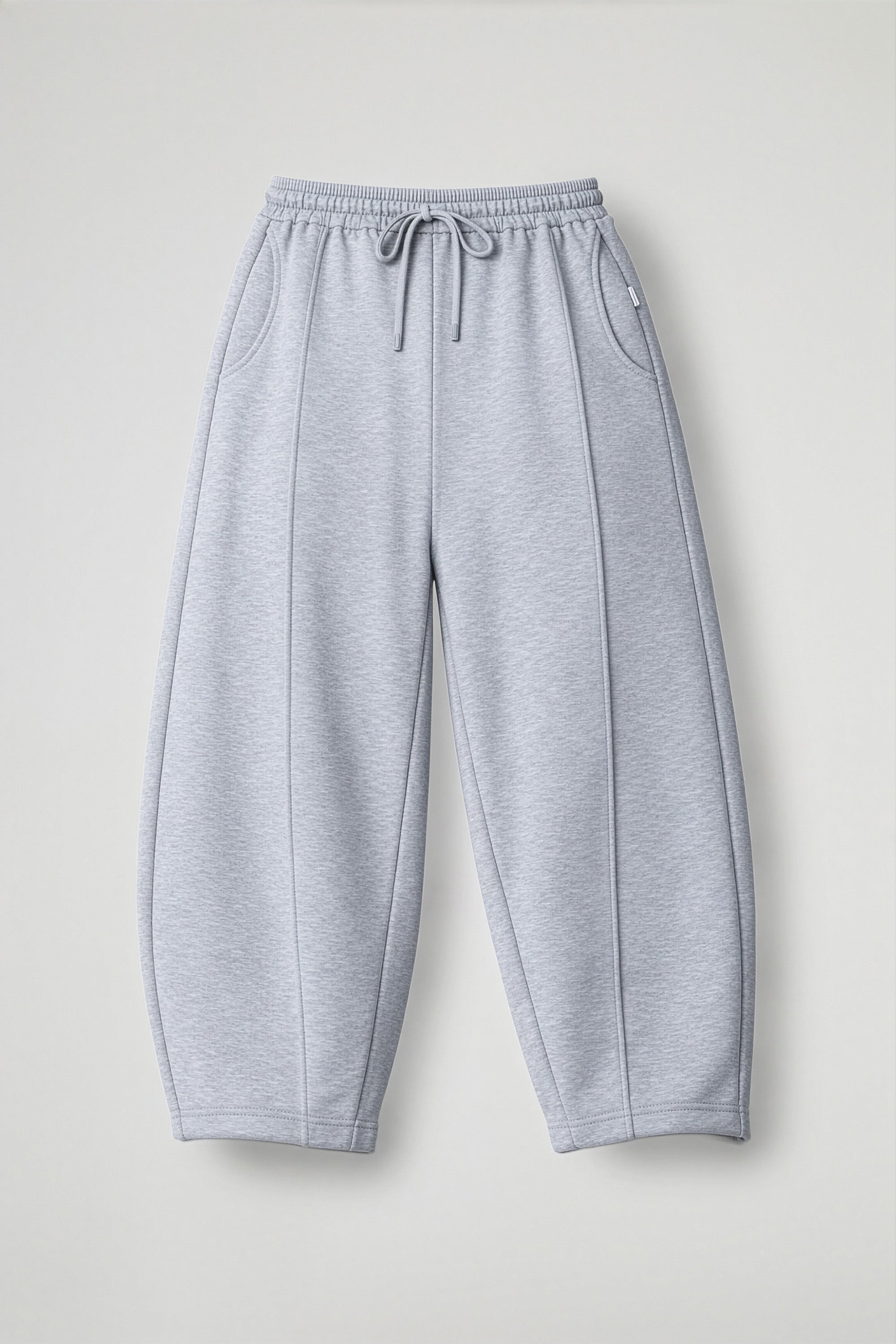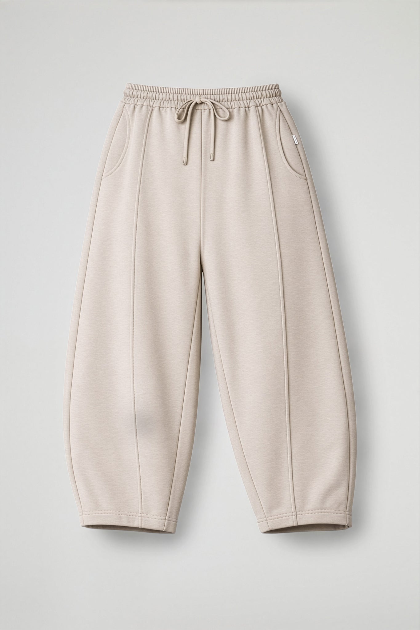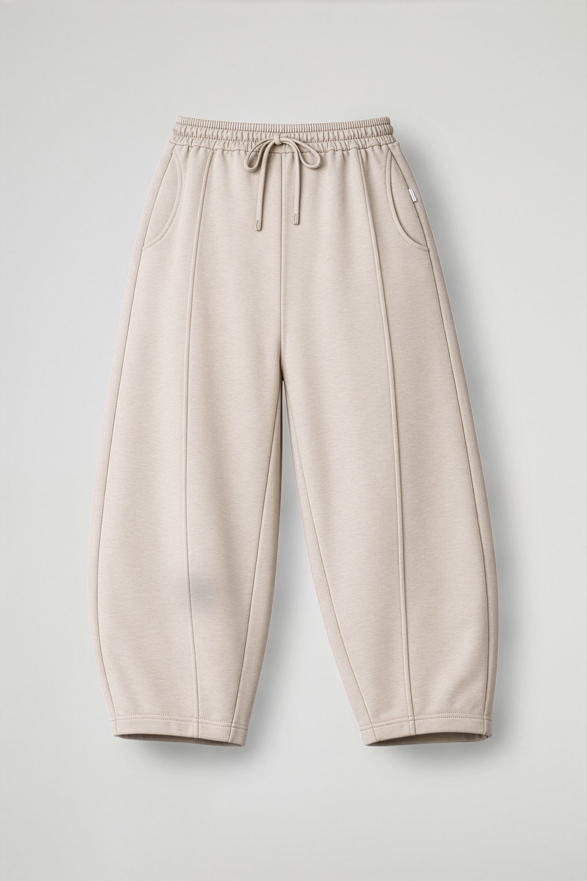 Taglio baggy, vita elastica con coulisse regolabile in tono, due tasche laterali, cucitura centrale frontale, orlo ribattuto sul fondo. Linea ampia