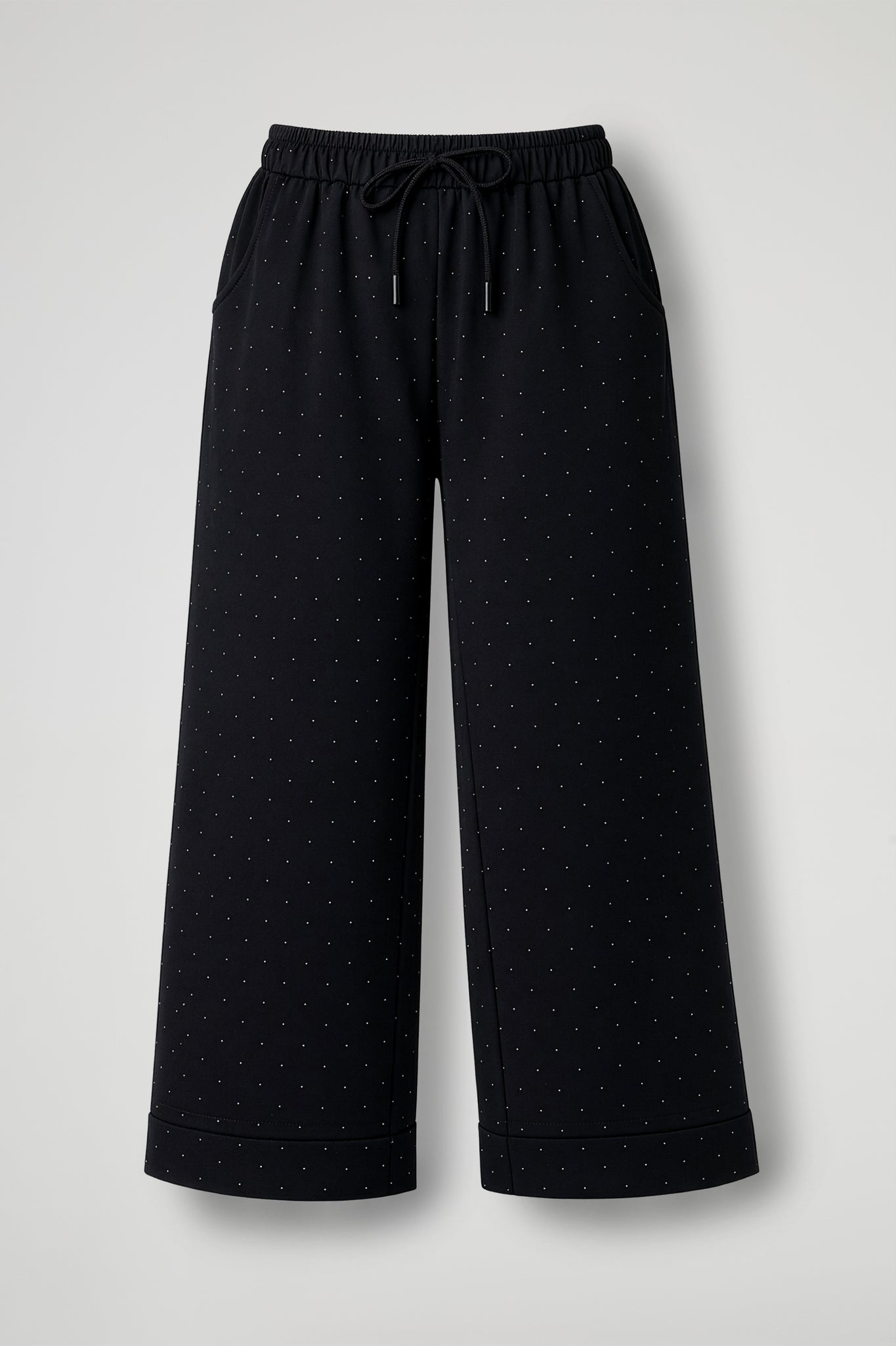 Pantalone gamba fit regular in tessuto di viscosa, elastico con coulisse regolabile in vita, tasche alla francese, dettaglio micro strass su tutto il capo, orlo dritto sul fondo.
