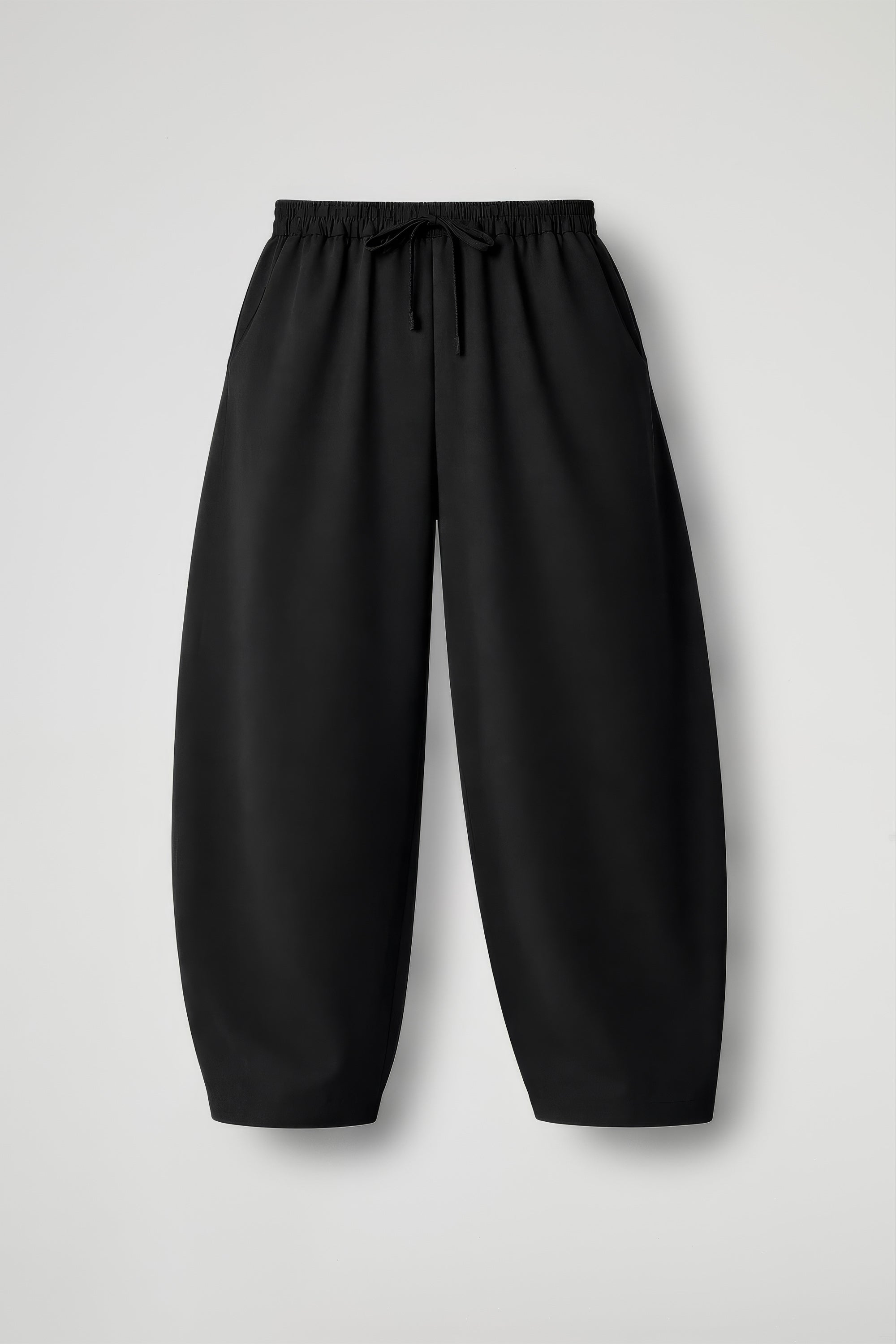 Pantalone jogger dal taglio comodo e rilassato, perfetto per look quotidiani easy-chic. La vita elasticizzata assicura comfort, mentre la coulisse con laccetto regolabile permette di adattare la vestibilità. Tasche a filo, gamba ampia che scende morbida e leggermente affusolata verso il fondo, con orlo rifinito a impuntura.