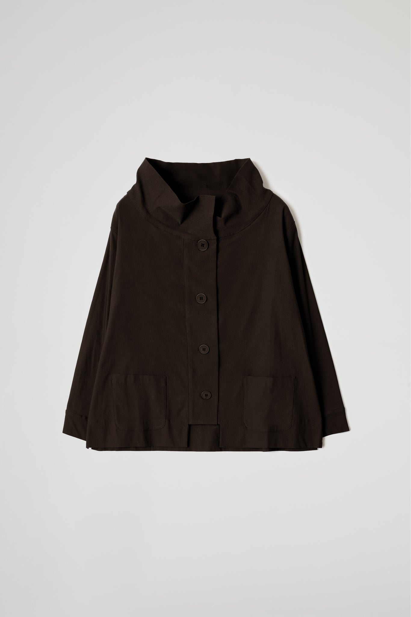 GIACCA ASIMMETRICA IN BENGALINA DI VISCOSA, AMPIO COLLO ALTO AD ANELLO, MANICA LUNGA, TASCHE A TOPPA, CHIUSURA CON BOTTONI. LINEA A TRAPEZIO.