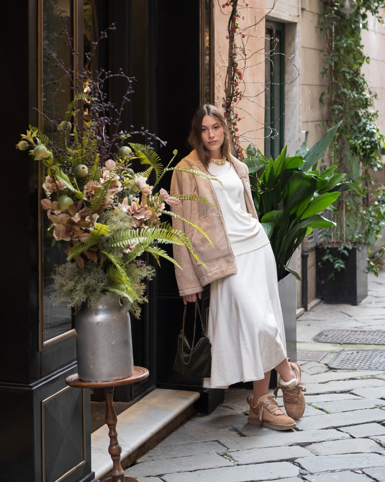 Gonna midi in morbida maglina di viscosa a trama fine, cintura liscia con elastico in vita, linea svasata e ampia che si apre gradualmente verso il fondo, creando un effetto morbido e leggermente ondulato. Linea morbida