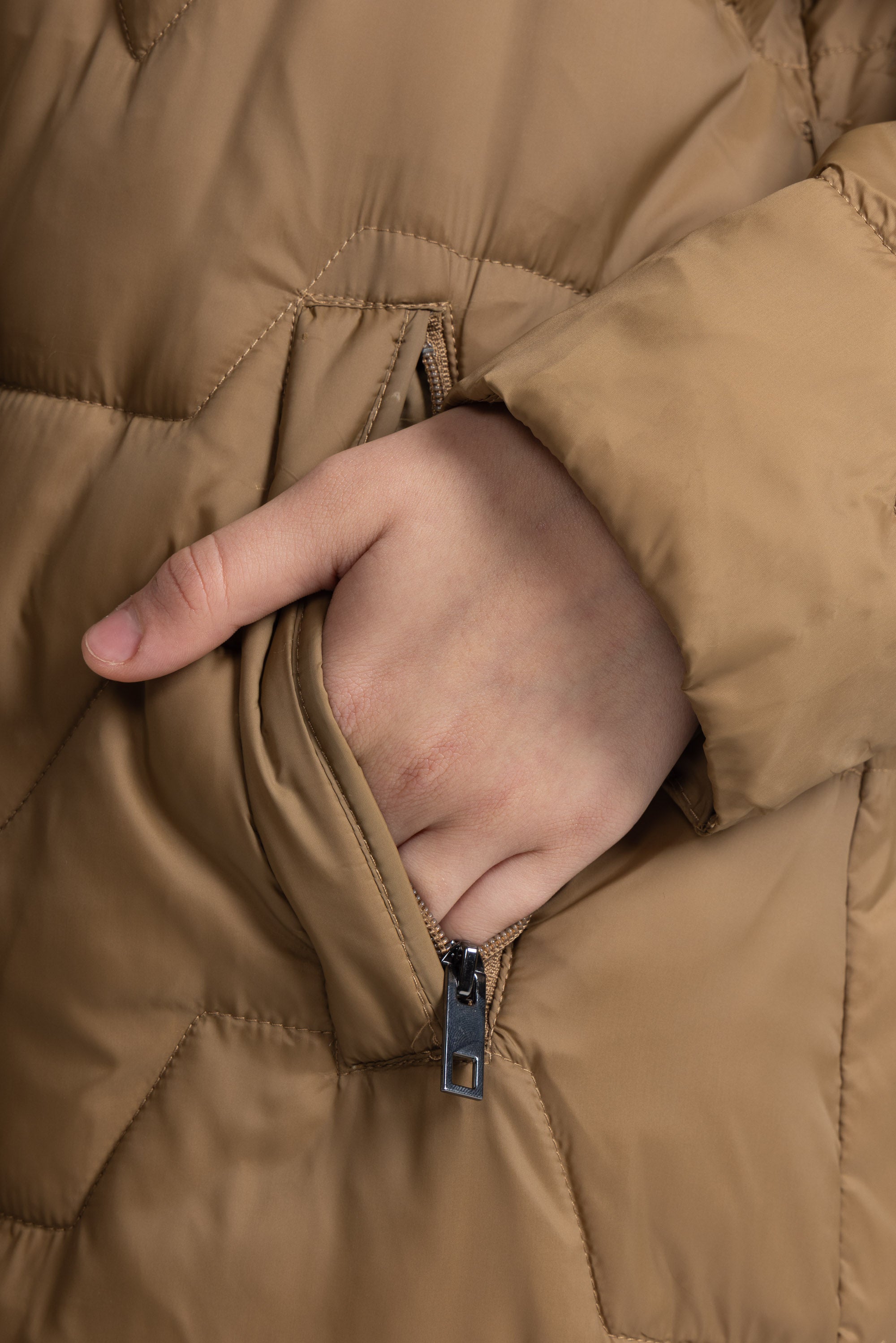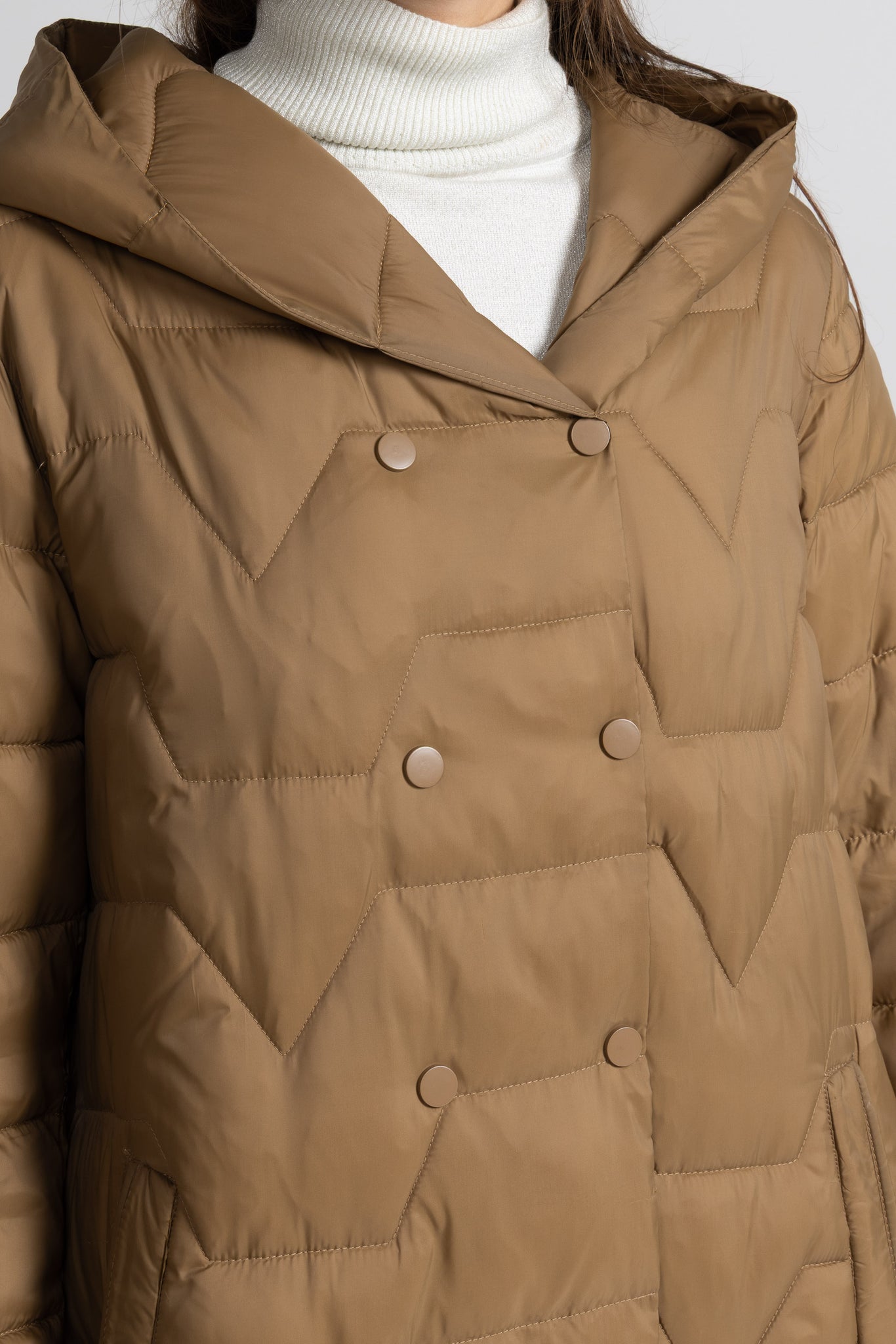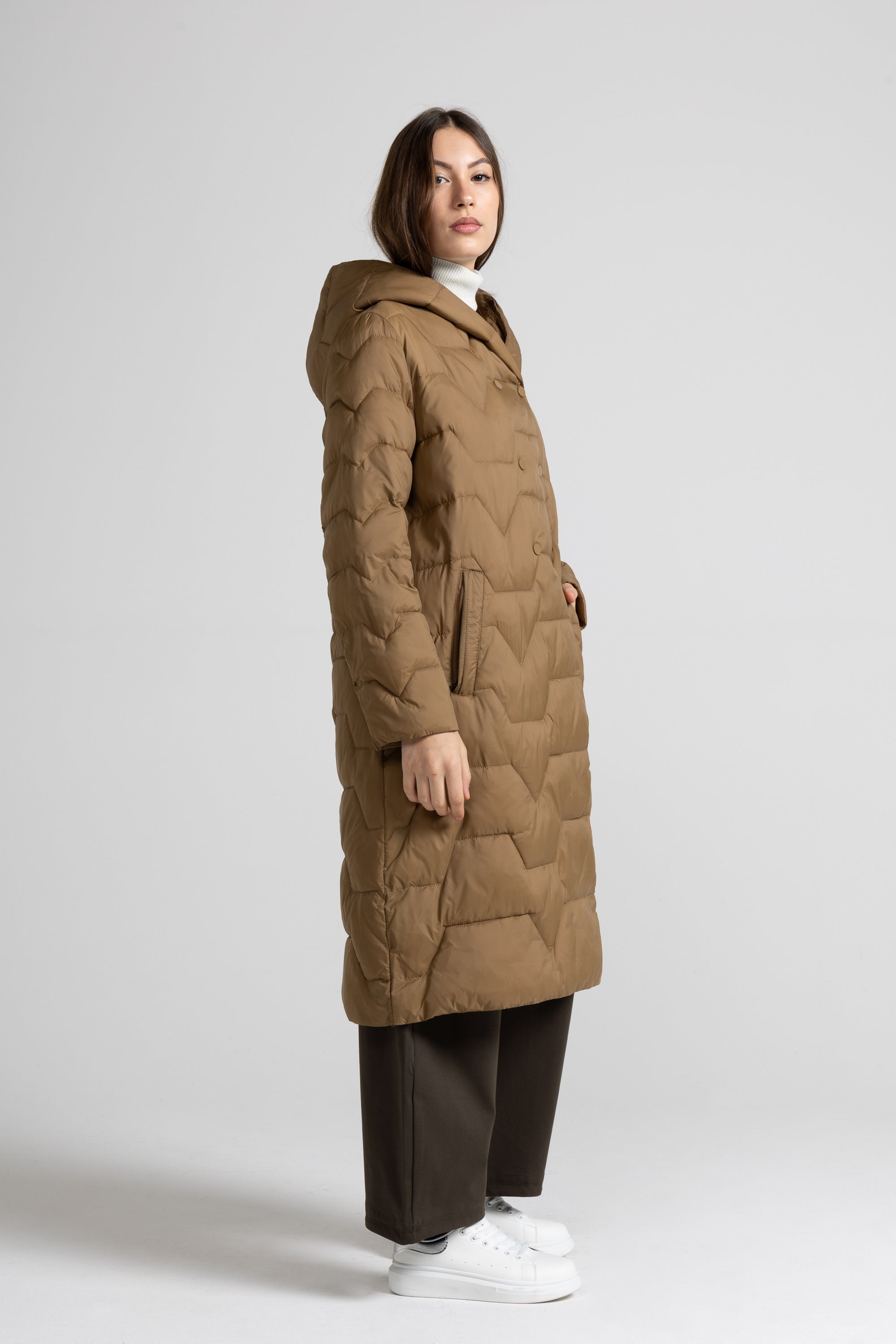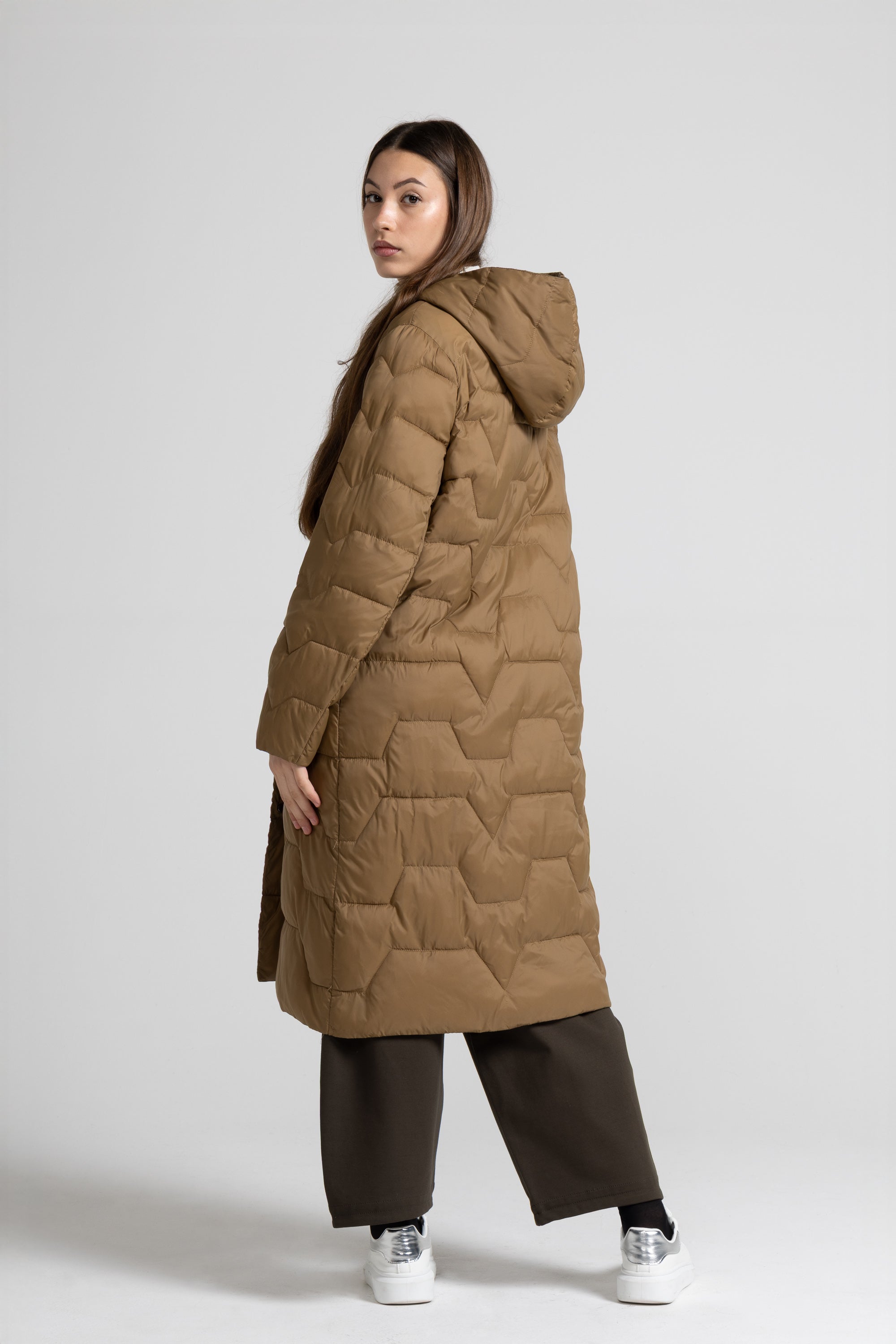 Piumino lungo dal design trapuntato a motivo geometrico che valorizza la silhouette, unendo funzionalità, stile e leggerezza, ideale per affrontare le giornate più fredde con un tocco di eleganza.