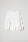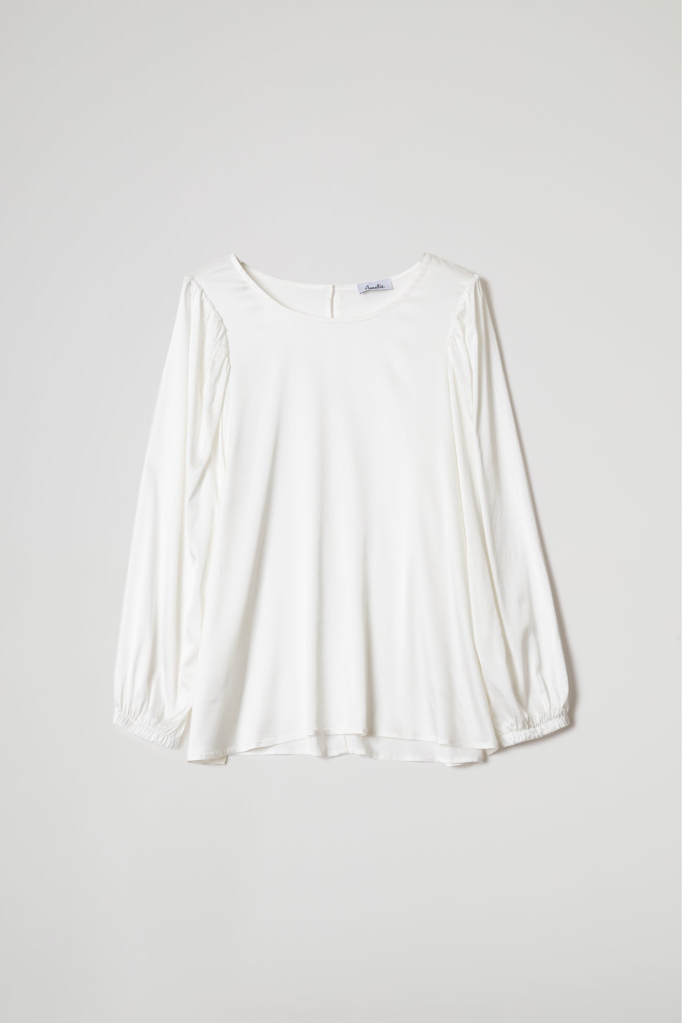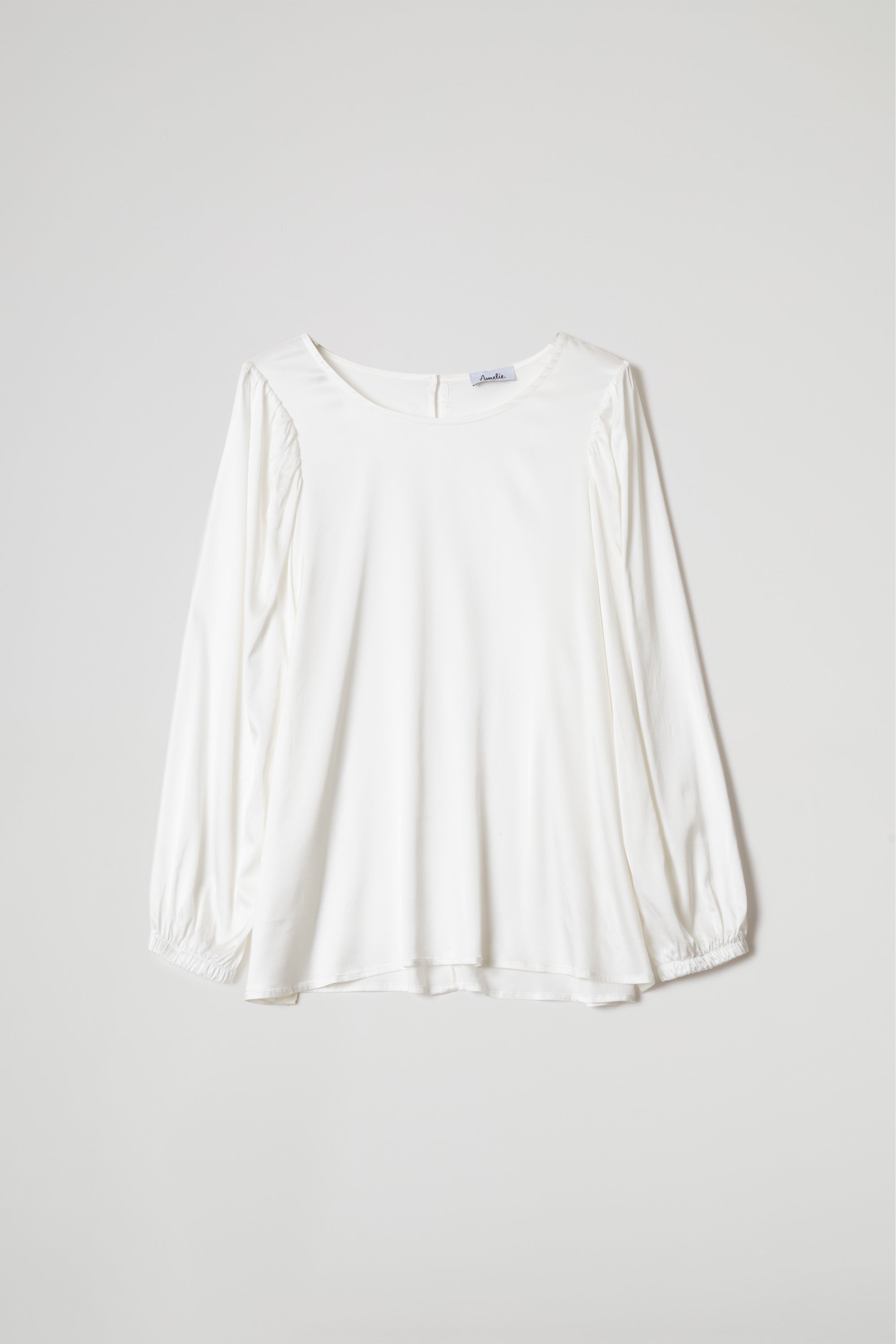 BLUSA IN RASO DI VISCOSA E ECOVERO STRETCH, SCOLLO ROTONDO, MANICA LUNGA CON ELASTICO SU POLSO, MANICA CON LEGGERA ROUCHES, SPACCHETTI LATERALI. LINEA A TRAPEZIO.FIT COMFORT EFFETTO PYJAMA.