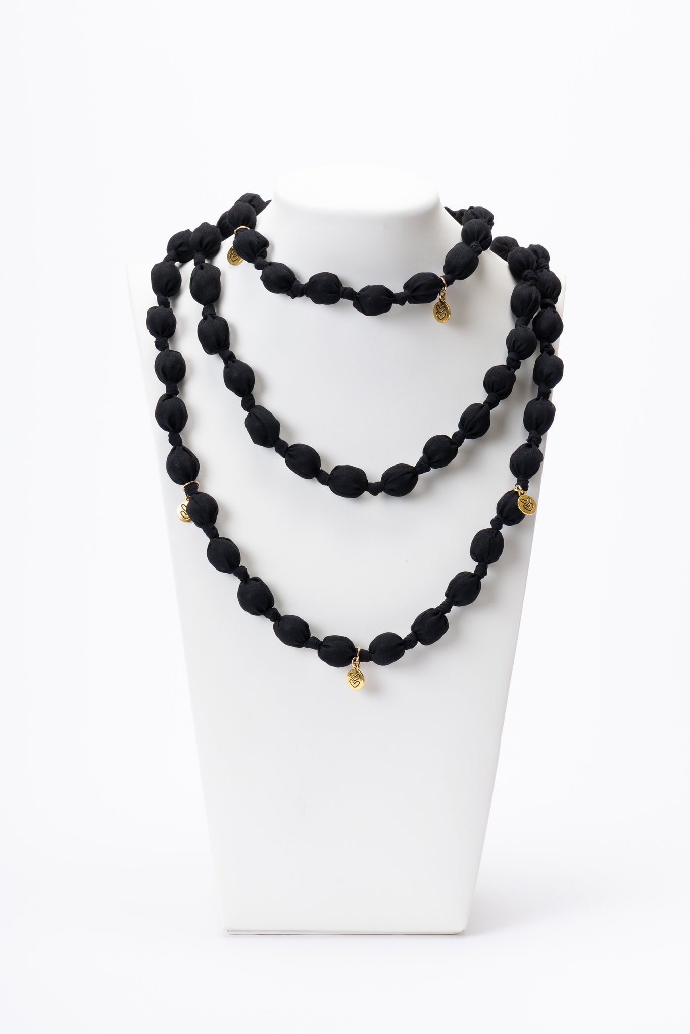 Collana composta da una serie di perle rivestite in tessuto nero, annodate una a una per creare un effetto morbido e sofisticato. Il design è caratterizzato da una struttura lunga e modulare, che permette di indossarla in più giri attorno al collo.