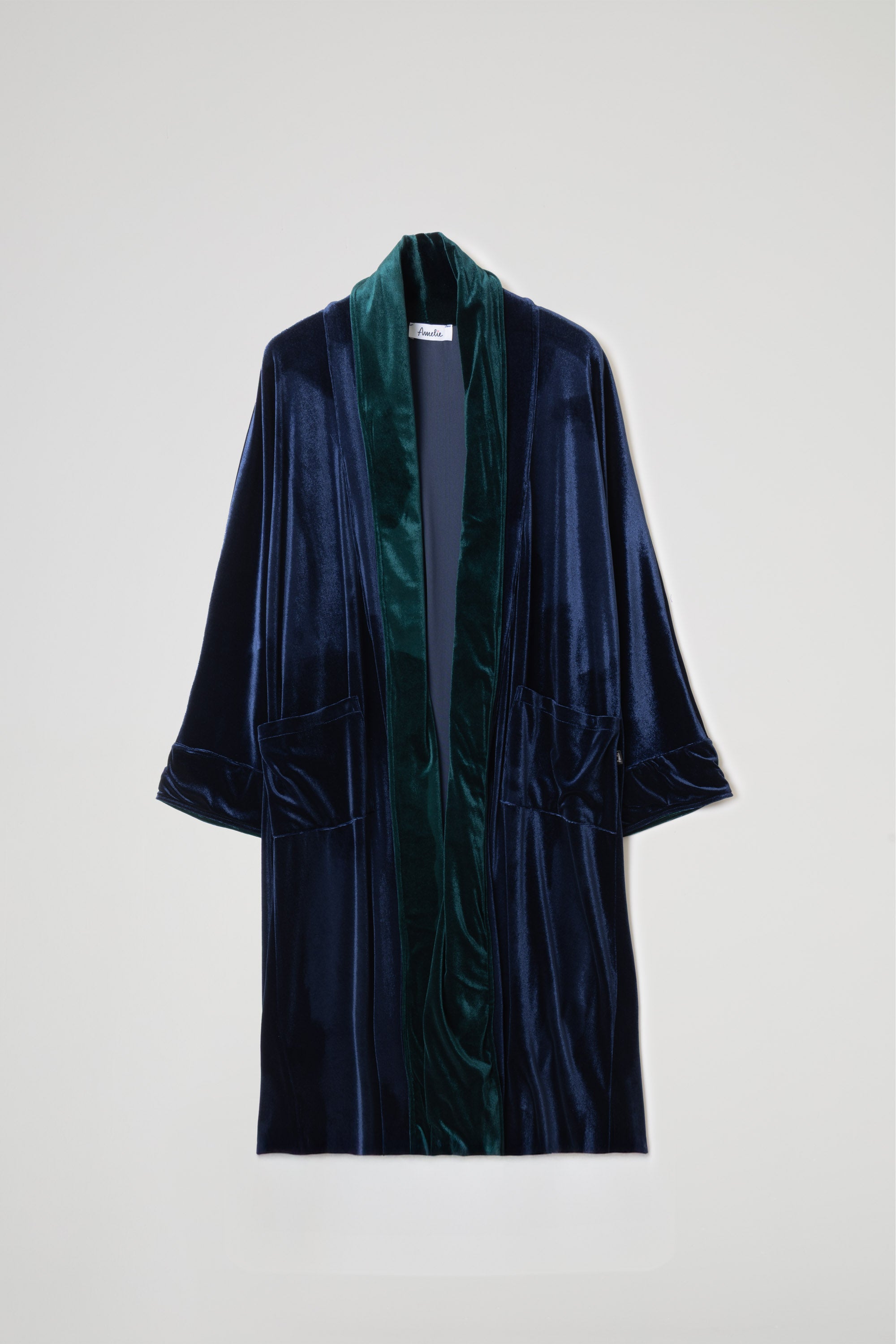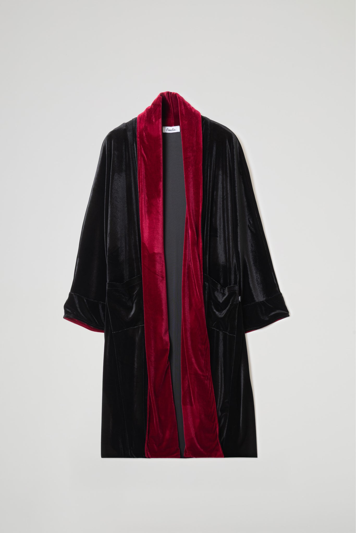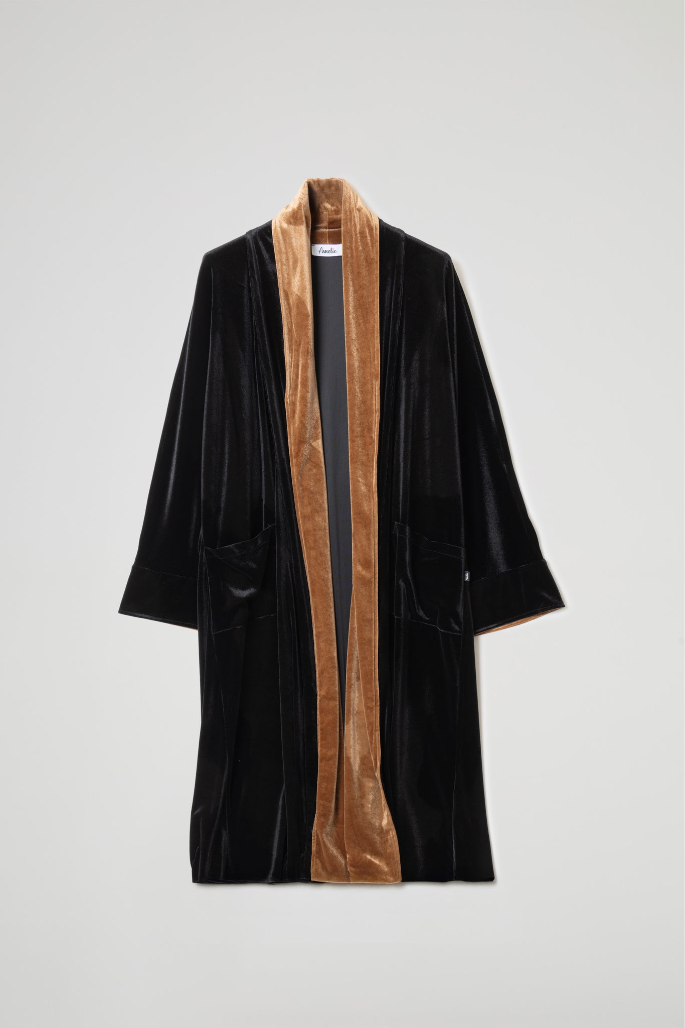 LONG DUSTER COAT IN STRETCH VELVET, ¾ SLEEVES, PATCH POCKET, SHAWL COLLAR WITH TWO-TONE DETAIL, HIGH FOLDED CUFF WITH TWO-TONE DETAIL. A-LINE SHAPE.