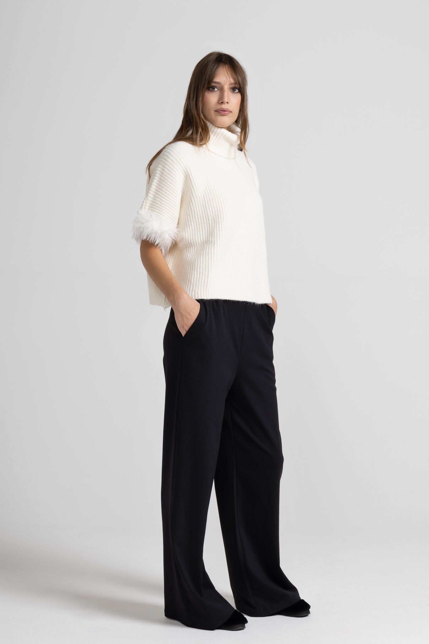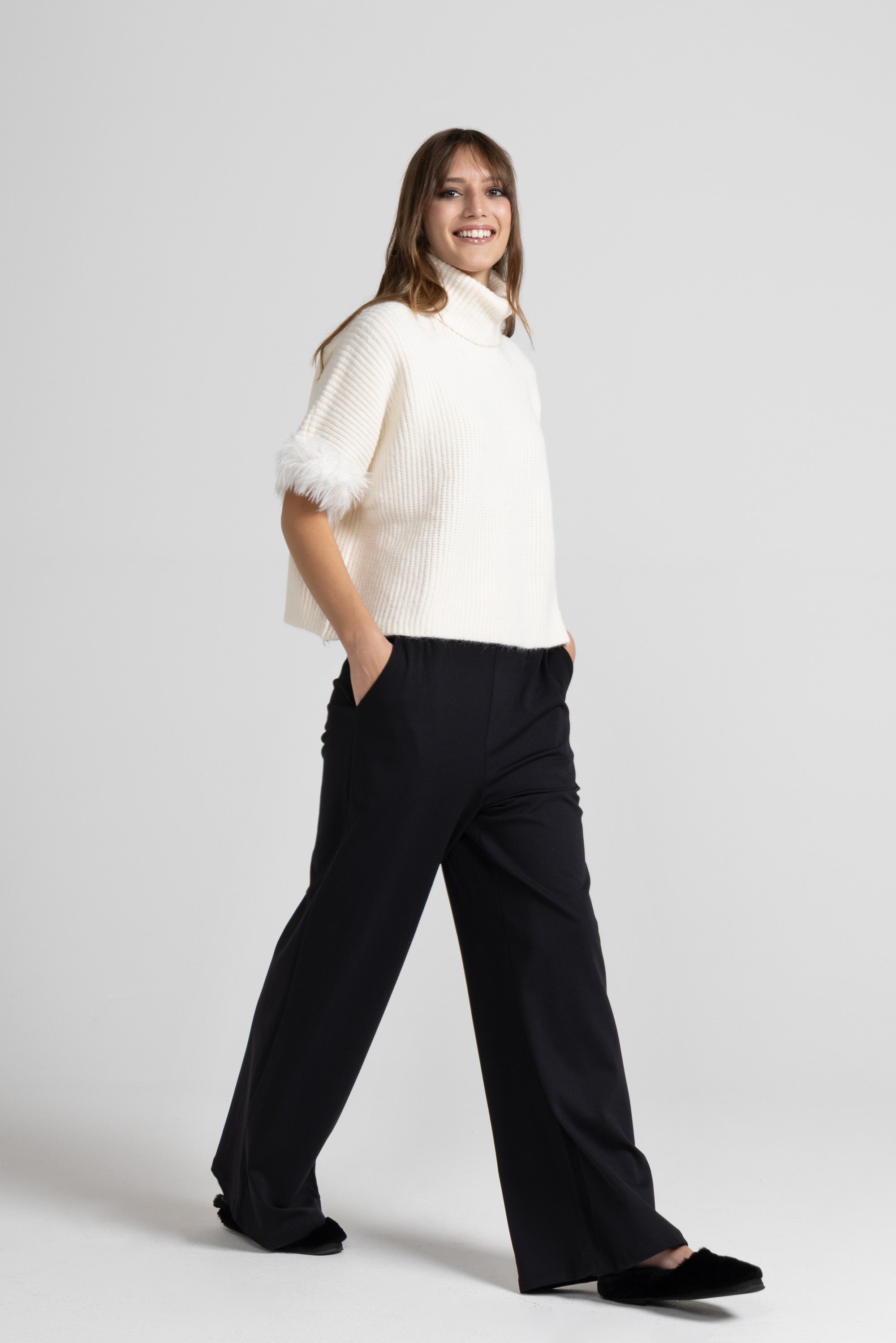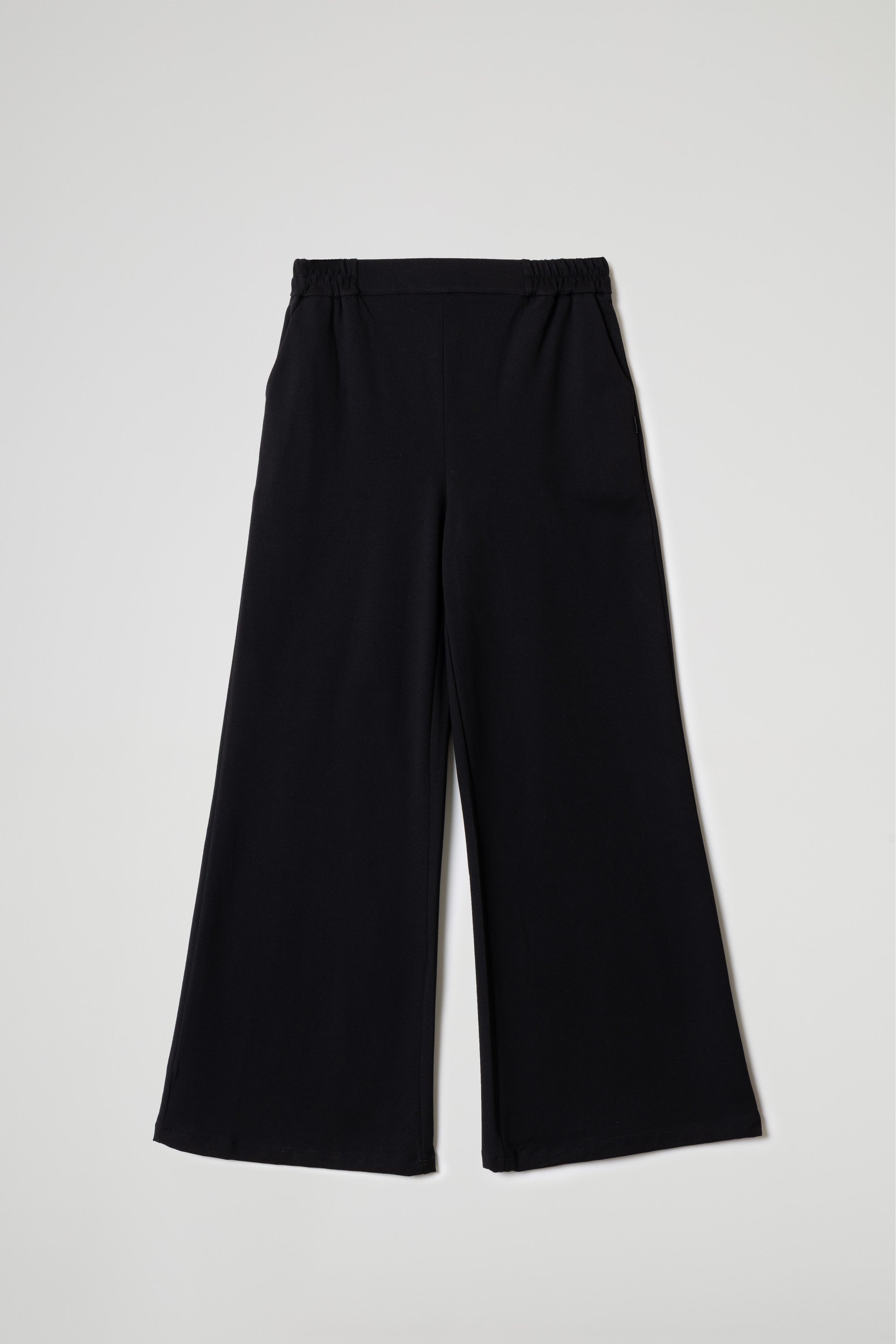 Palazzo trousers in Milanese viscose stitch fabric, soft and pleasant to the touch, elastic waist for optimal comfort, slant pockets. Soft lining.