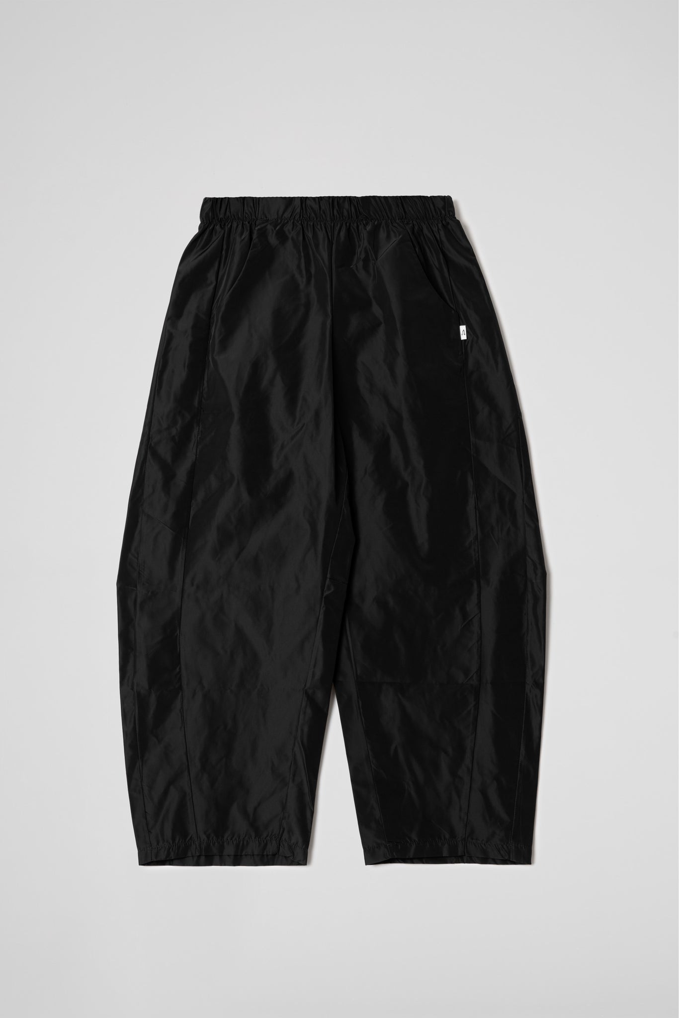 BARREL TROUSERS IN NACRE-EFFECT TAFFETA FABRIC, ELASTIC WAIST, CUT ON THE LEG, SQUARE POCKETS, BAGGY LINE