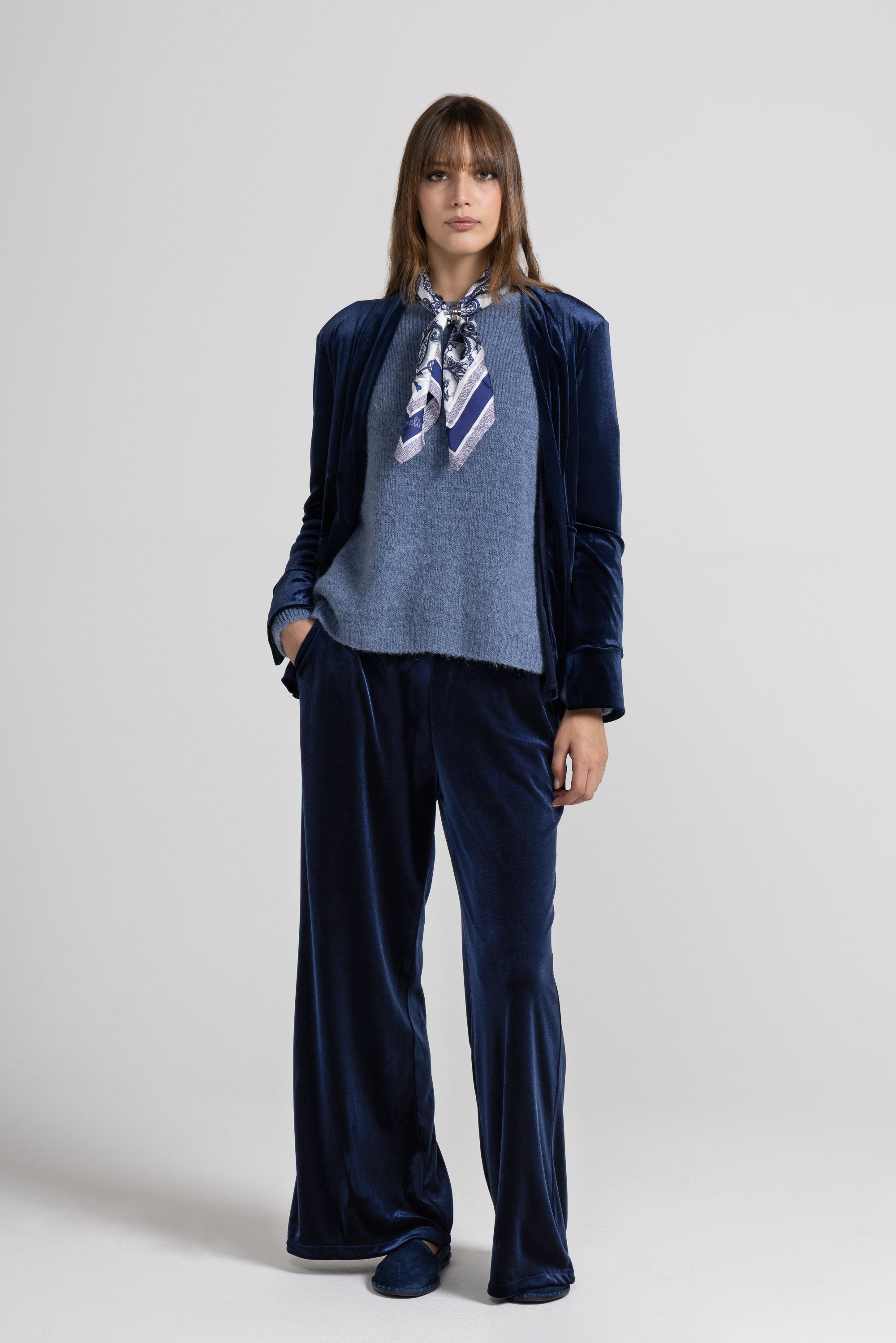 Stretch velvet jacket with a lapel collar, structured shoulders that flatter the figure, a front opening, patch pockets with flaps, and long sleeves with a contrasting slit at the bottom that adds a distinctive and refined touch. The lining ensures comfort and a flawless fit. Relaxed fit.