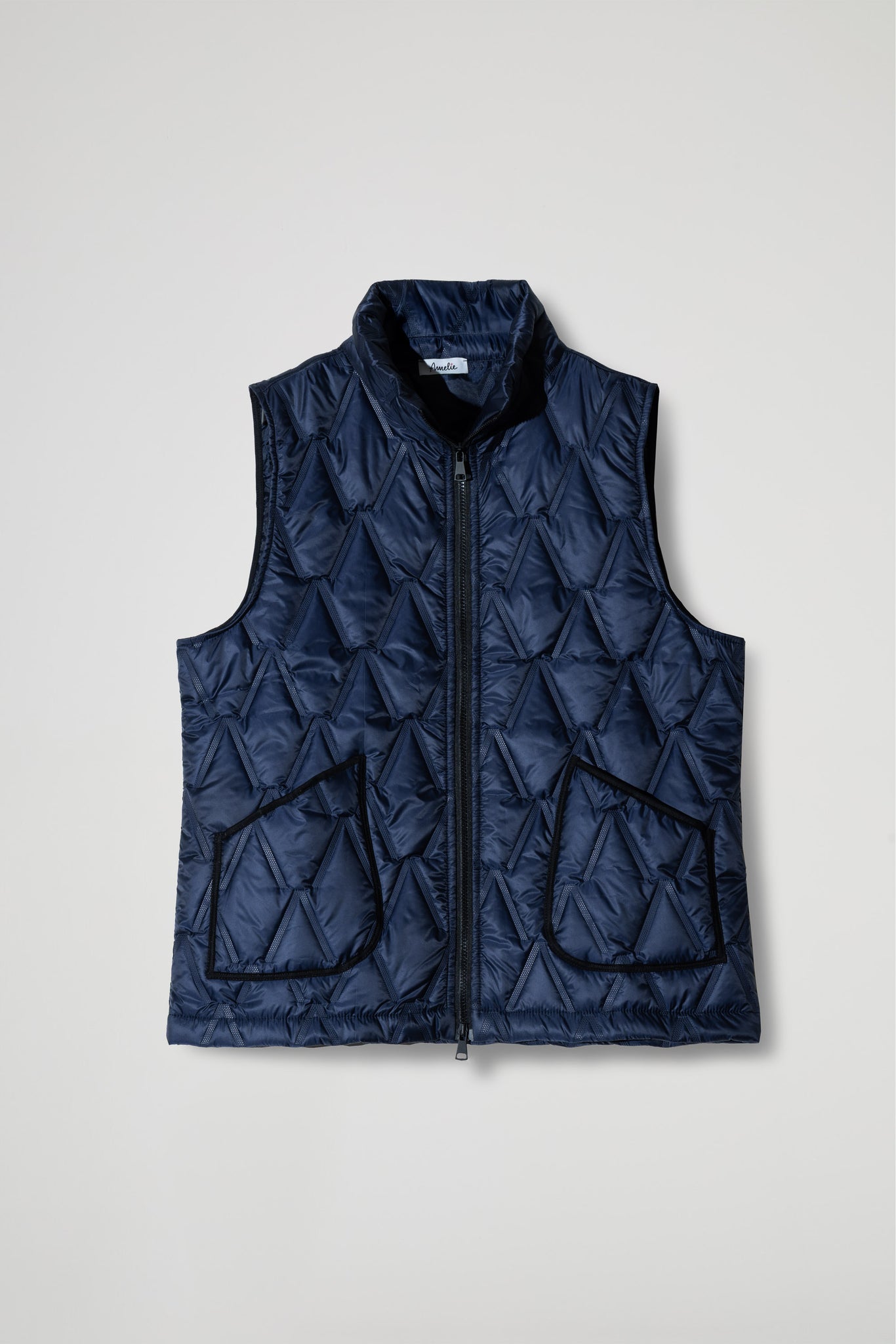 Collo alto e avvolgente, chiusura centrale con zip a doppio cursore a contrasto colore, due tasche applicate sul davanti con bordatura a contrasto, disegno romboidale su tutto il capo, orlo inferiore ribattuto alto.
