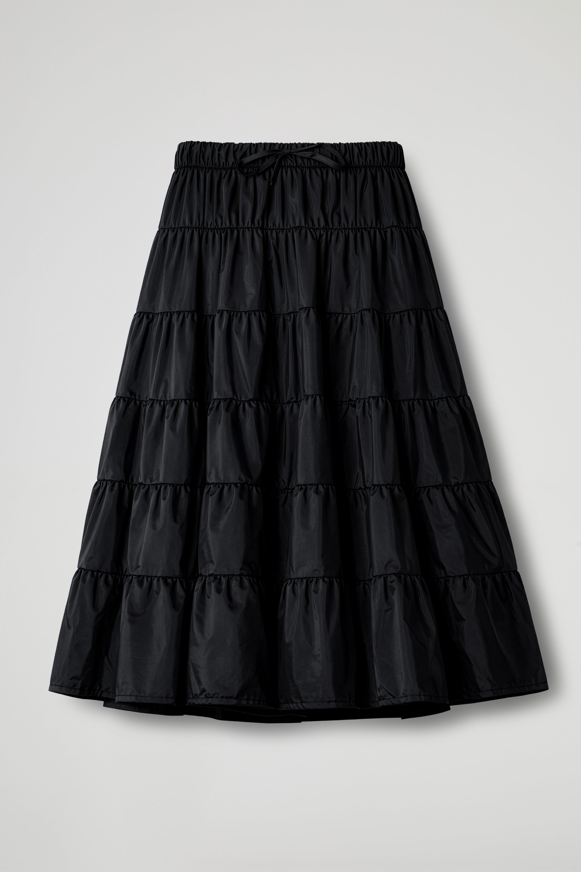 Long A-line skirt in nacre-effect taffeta, adjustable elastic waistband, welt pockets, and gathered horizontal ruffles. Loose and relaxed fit.