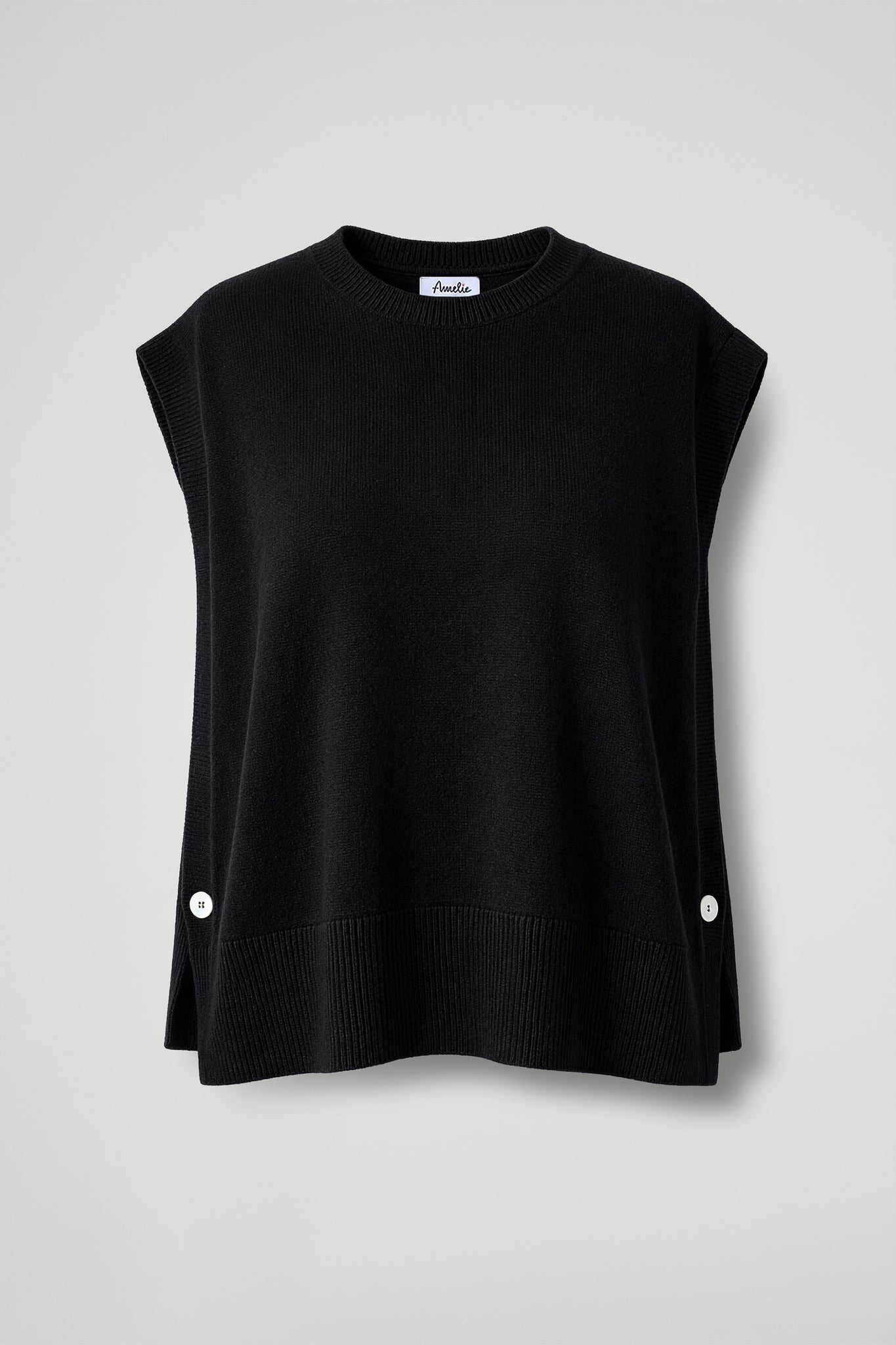 Smanicato in morbida maglina di viscosa, essenziale ma super versatile; è il capo passe-partout da stratificare in mille modi. La linea è morbida e leggermente oversize, con girocollo e bordi a costine che definiscono la silhouette. Ai lati presenta spacchi con bottoni a contrasto che aggiungono un dettaglio ricercato e permettono più libertà di movimento.