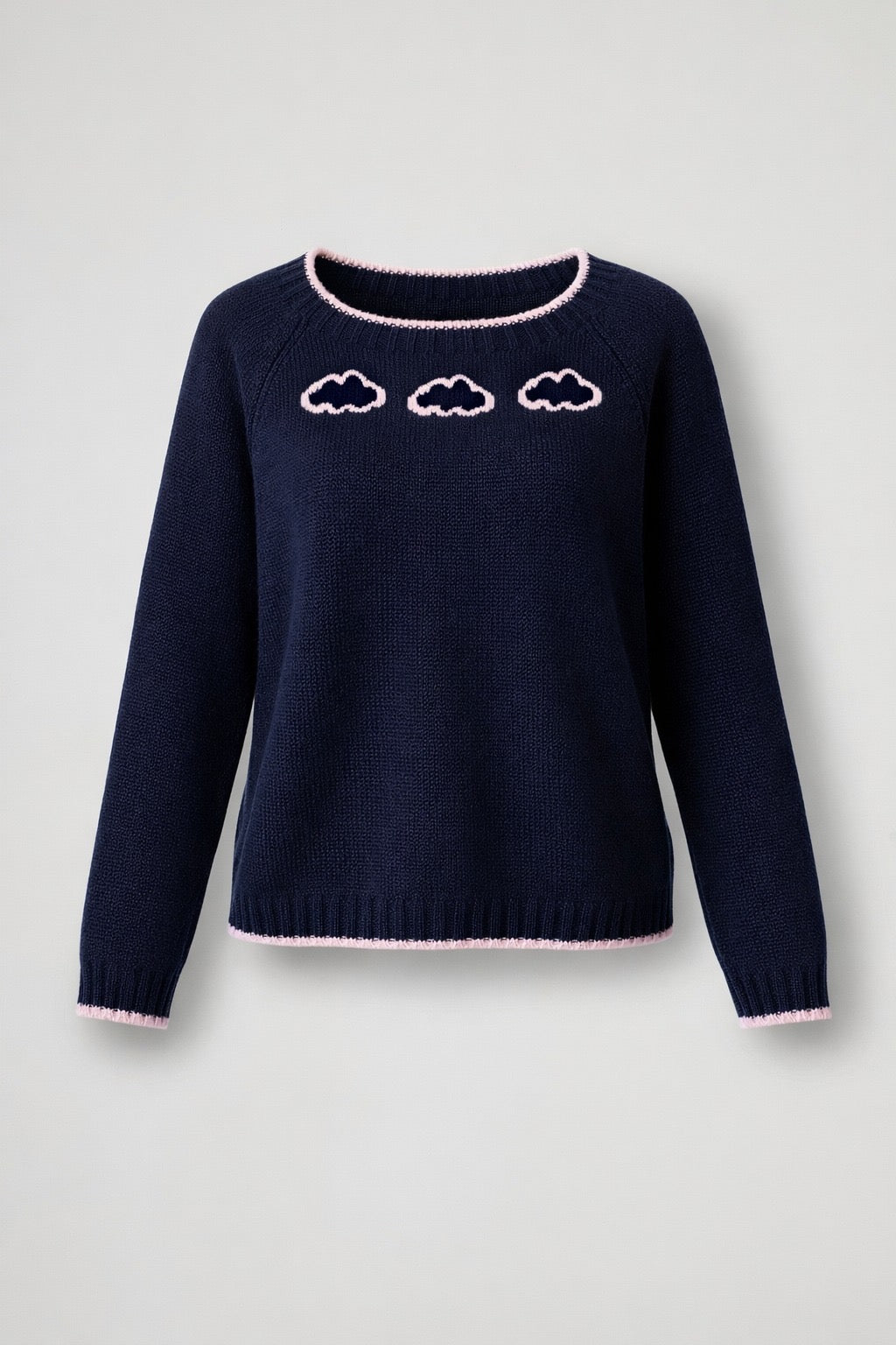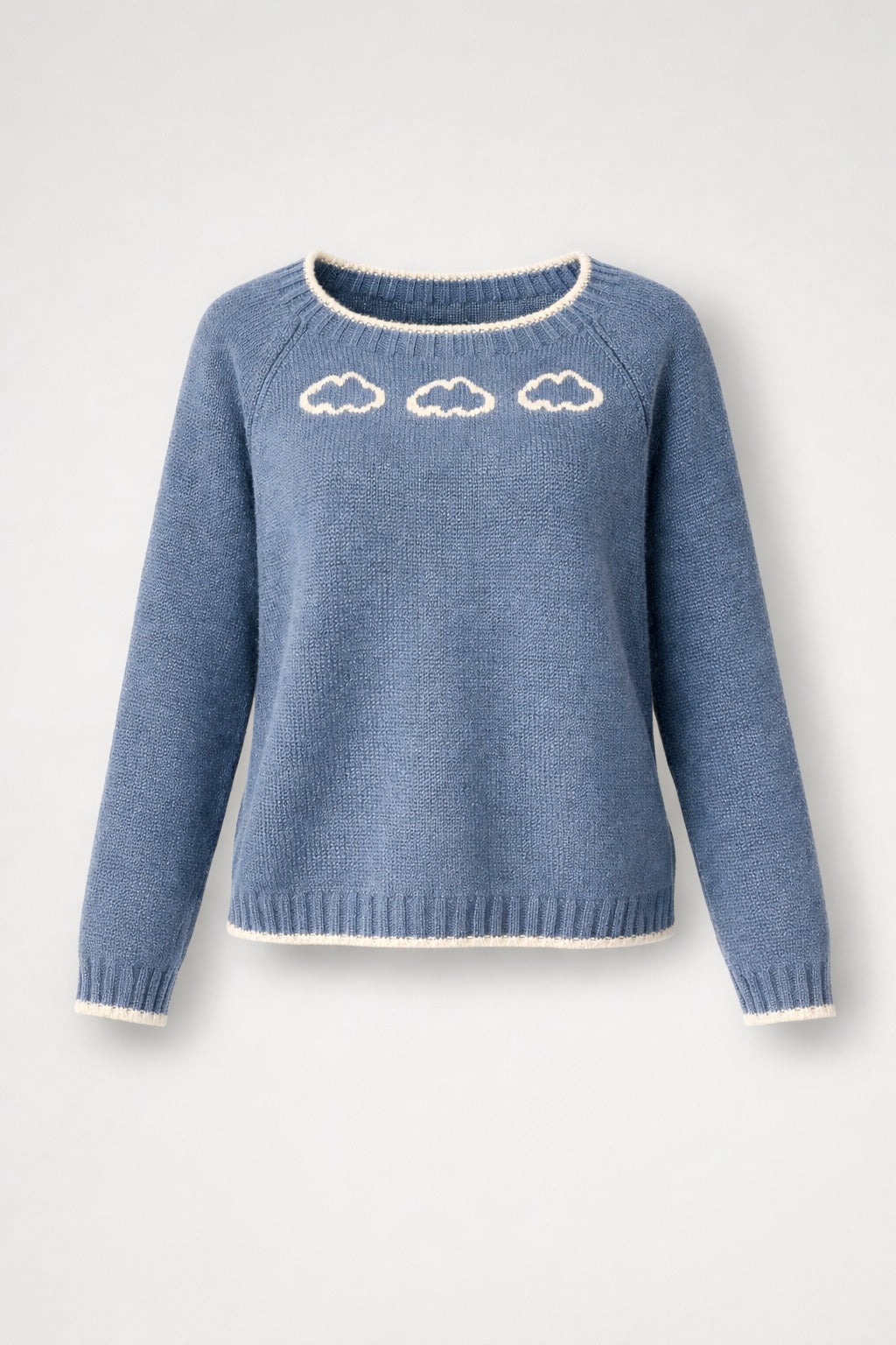 Maglione scollo a barca con bordatura a contrasto colore, spalla scesa, manica lunga con polino a coste e profilo a contrasto, stampa sul davanti e scritta " in the clouds" sul retro, fondo a coste con profilo a contrasto.
