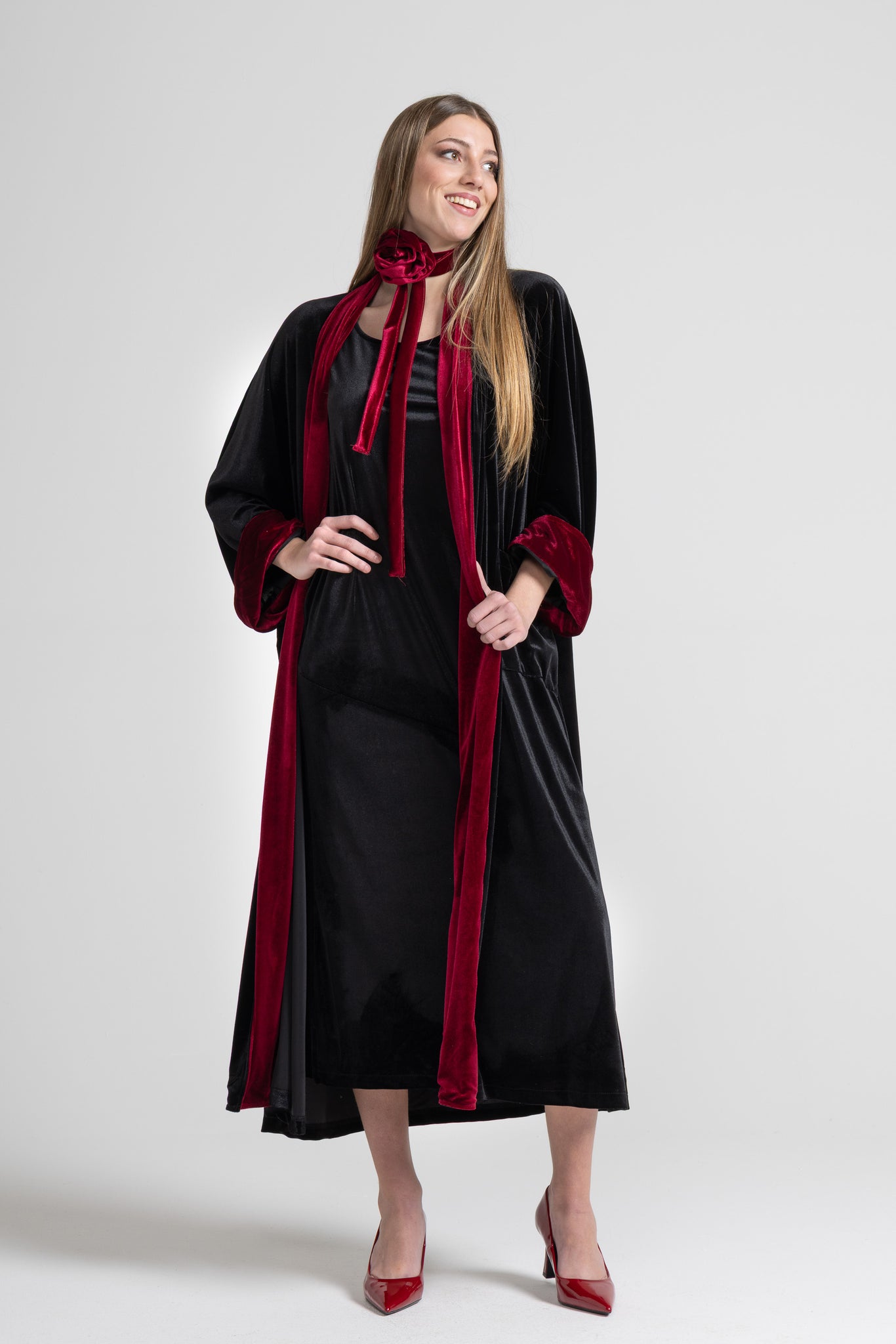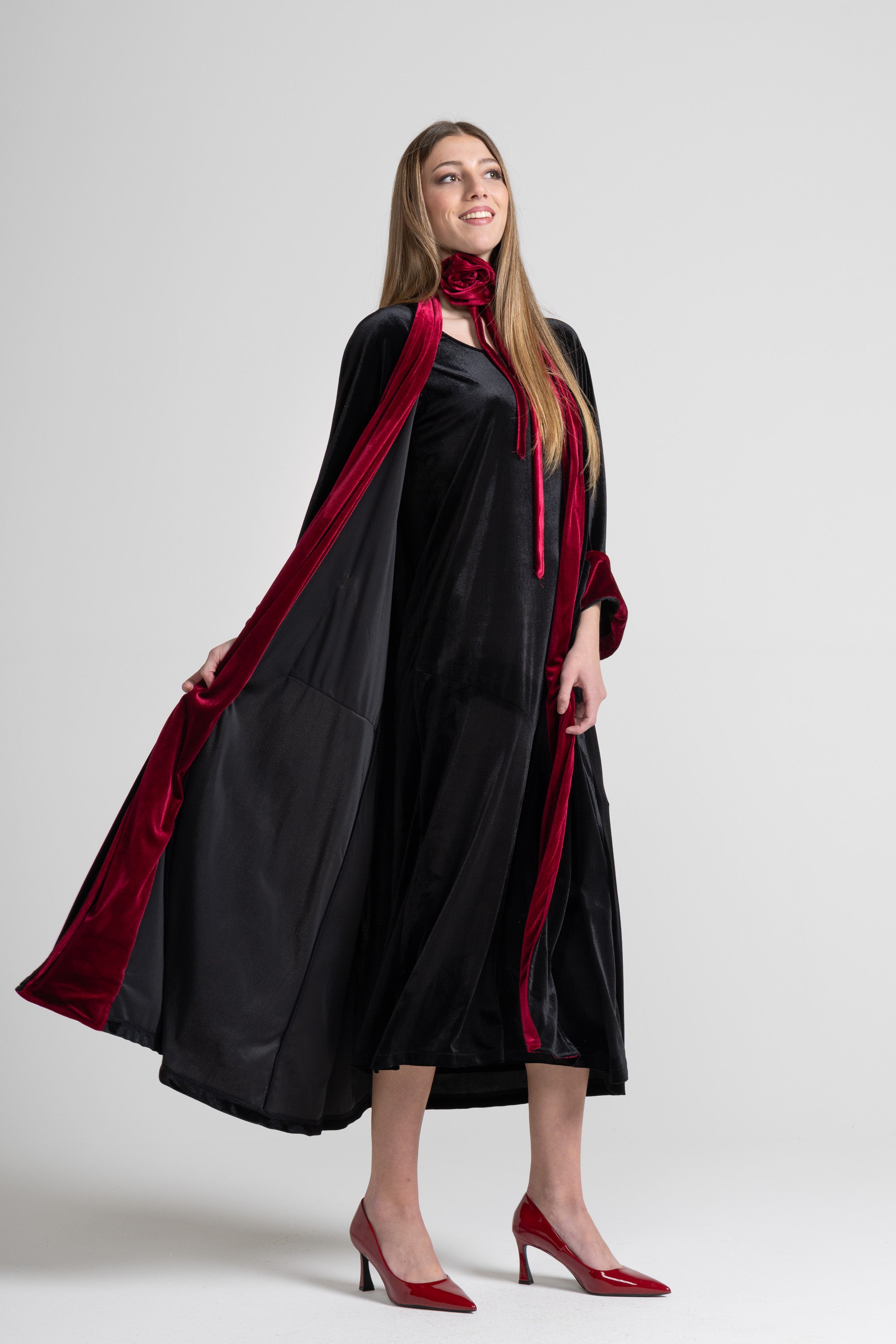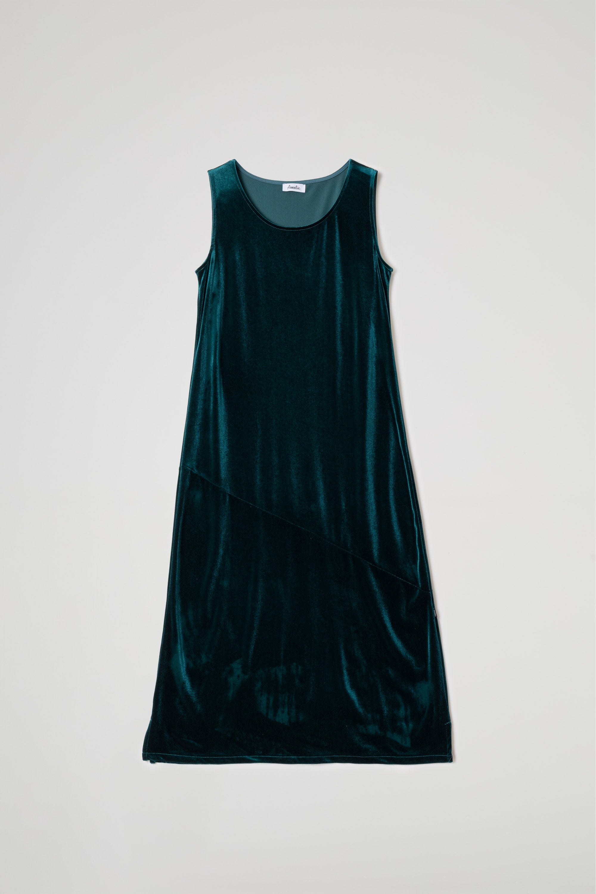 This soft, shimmering velvet dress captures the light with every step, creating a play of reflections that enhances the depth of the color. Its clean, flowing lines caress the silhouette with natural elegance, while the diagonal cut at the front adds movement and modernity, a piece that combines simplicity and sophisticated charm.