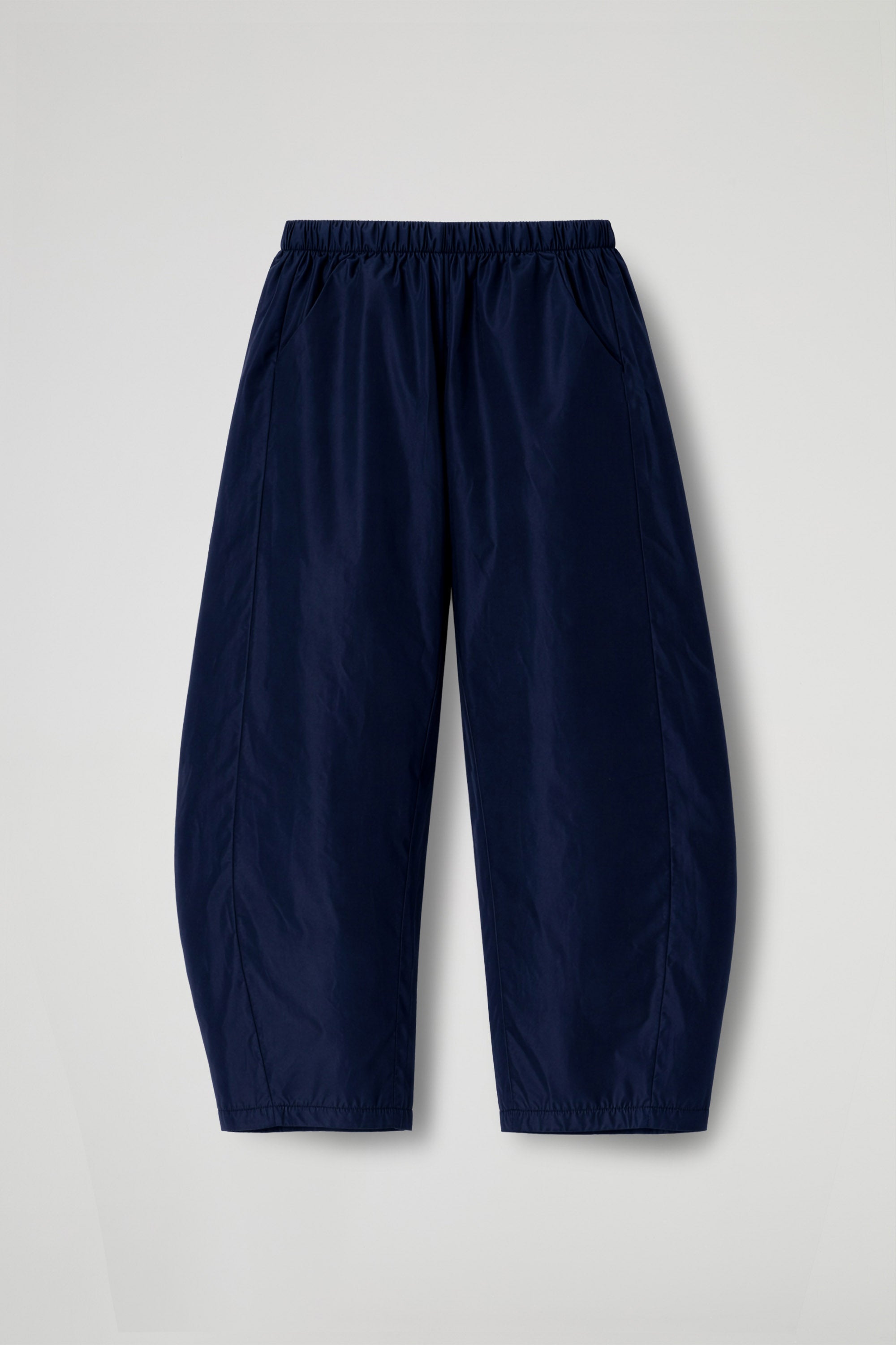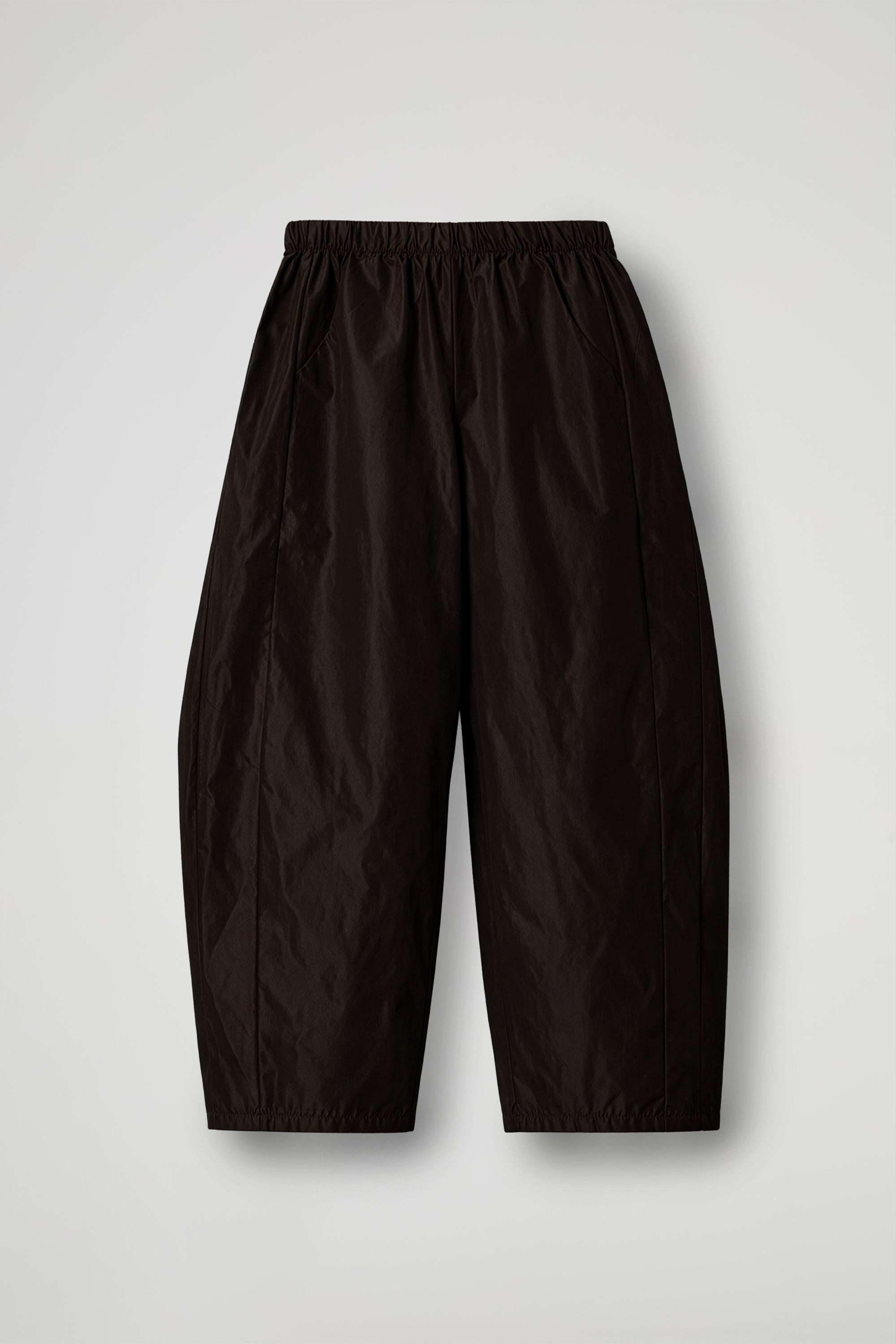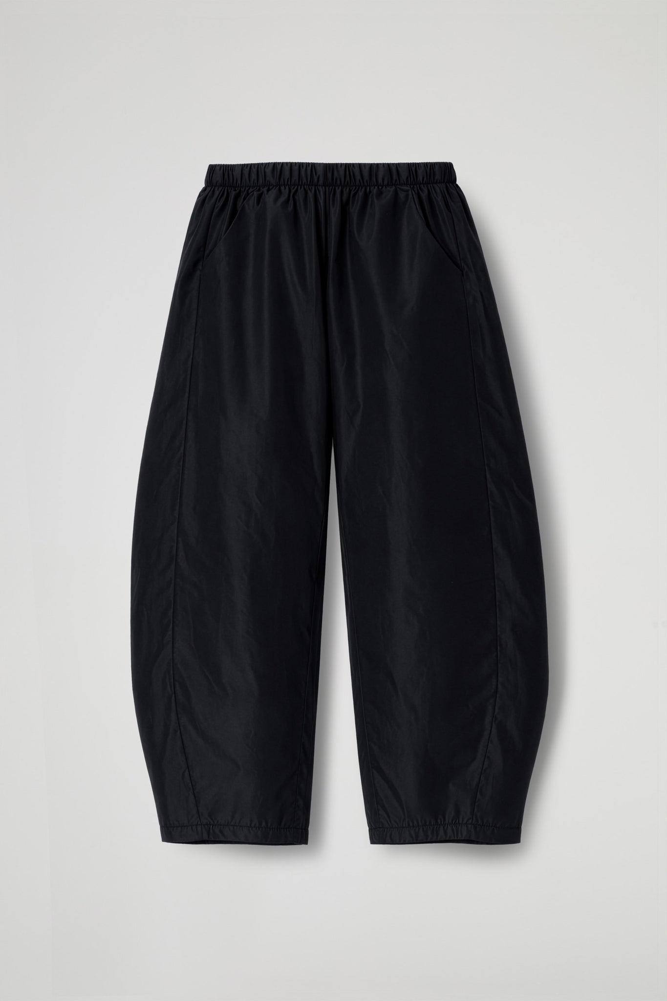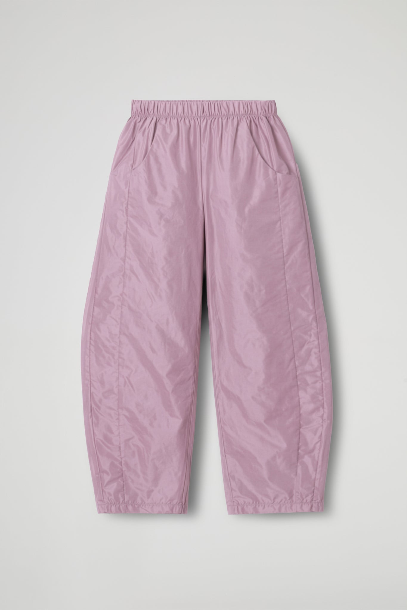 BARREL TROUSERS IN NACRE-EFFECT TAFFETA FABRIC, ELASTIC WAIST, CUT ON THE LEG, SQUARE POCKETS, BAGGY LINE