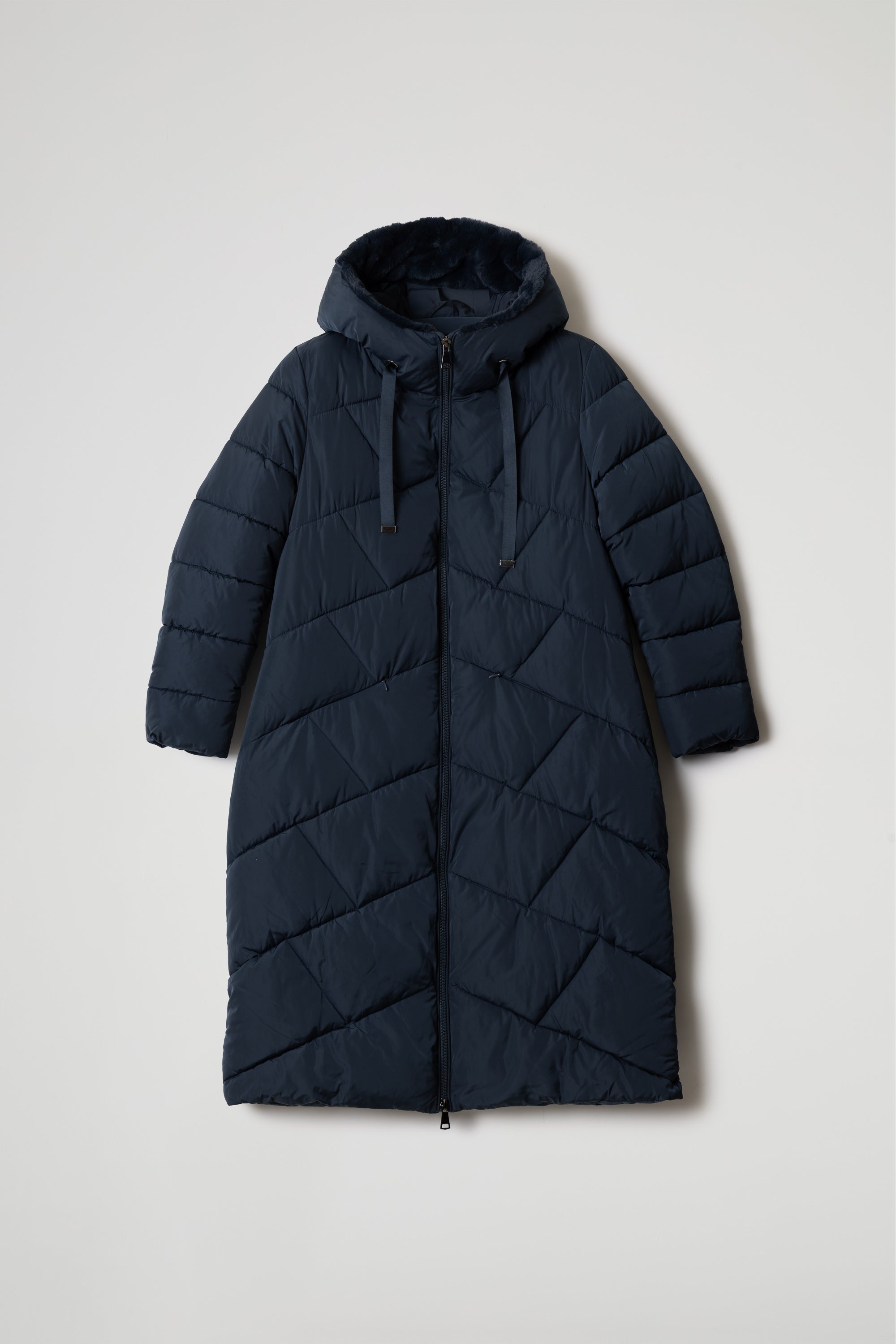 Long down jacket, large and enveloping faux fur hood adjustable with matching ribbons and metal tips, long central zip with double slider, side pockets with invisible zips, quilted detail throughout. Loose fit.