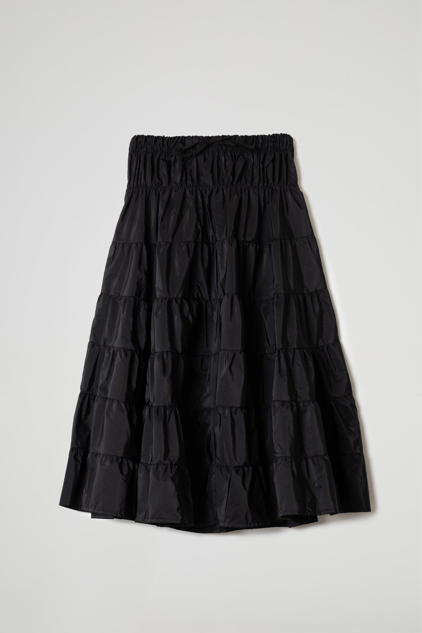 Long A-line skirt in nacre-effect taffeta, adjustable elastic waistband, welt pockets, and gathered horizontal ruffles. Loose and relaxed fit.