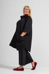 TOP OVER IN TESSUTO FLUIDO DI VISCOSA, MANICA LUNGA TAGLIO RAGLAN, COLLO ASIMMETRICO AD ANELLO RIGIRATO, DETTAGLIO TAGLIO A VIVO, TASCHE A TOPPA SUL FRONTE, ORLO A PETALO. LINEA OVER