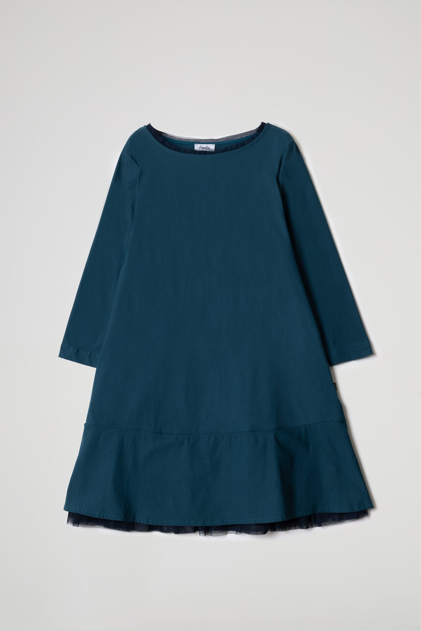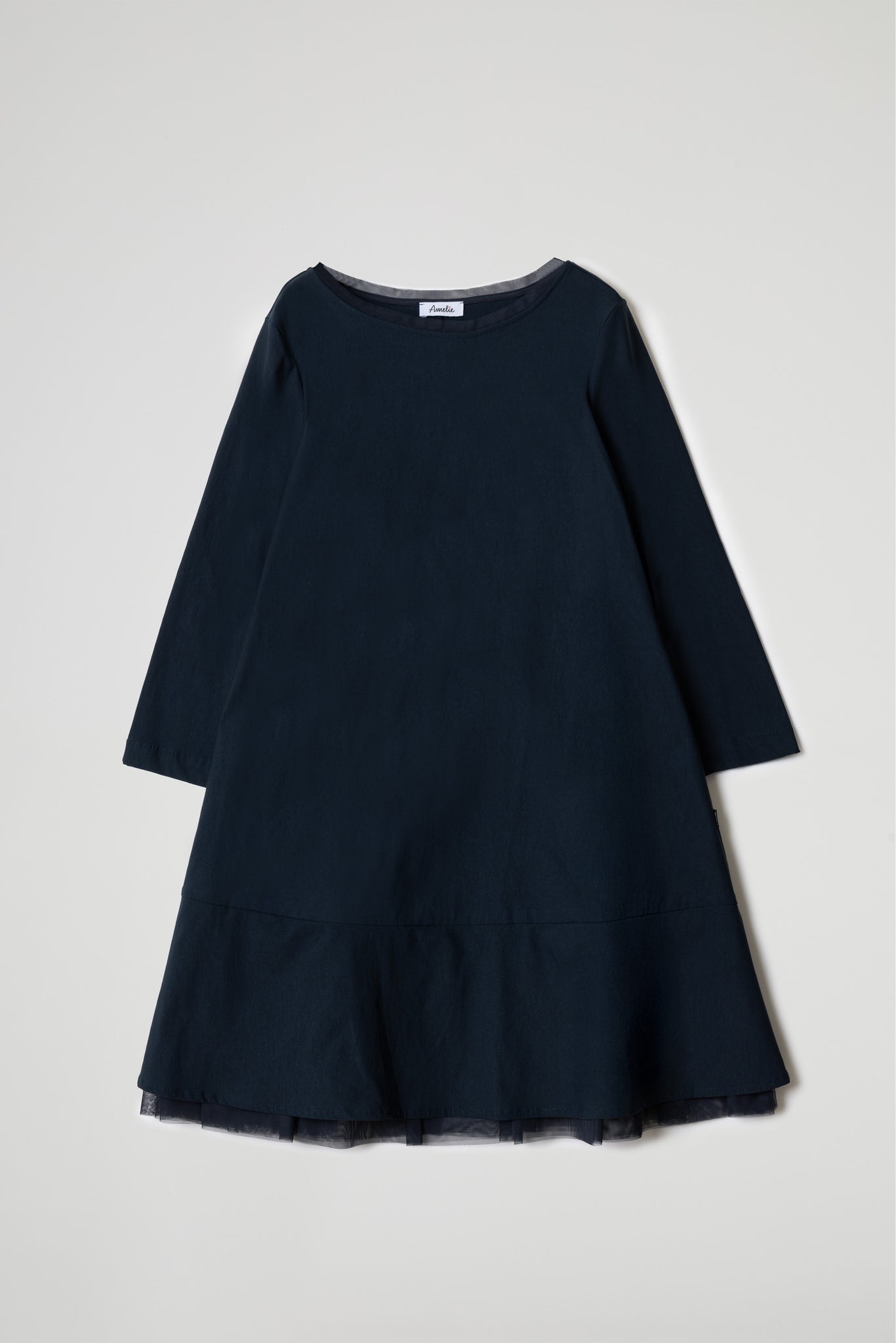Midi dress in stretch viscose bengaline fabric, crew neck finished with tulle insert, long sleeves, welt pockets, flared line with slightly asymmetrical hem, decorative stitching at the bottom, tulle detail at the hem that adds a touch of lightness and refinement to the dress, giving it a feminine and modern look.