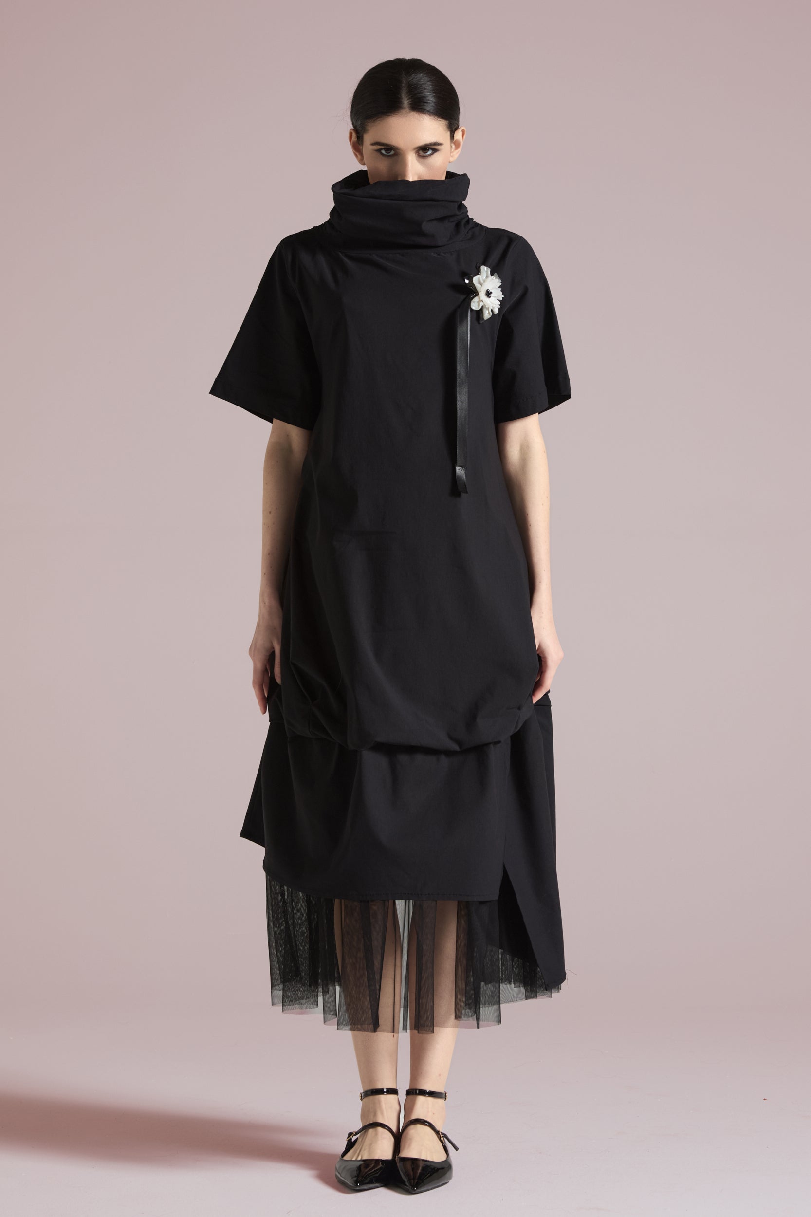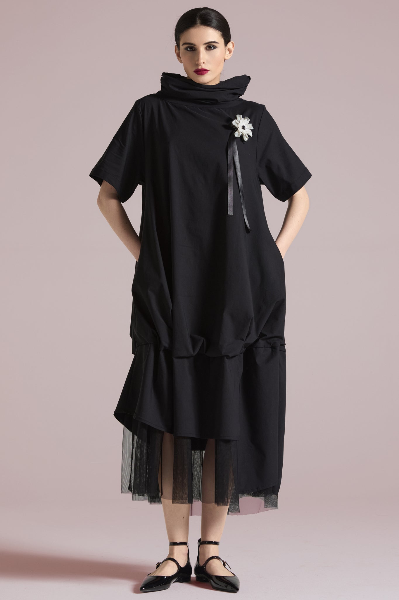 Asymmetrical oversized dress with a contemporary feel, crafted from soft, flowing viscose, featuring a wide, draped cowl neck , short sleeves , and a flared silhouette that falls comfortably on the body. The hem is constructed with layered volumes , creating a slightly balloon-like effect, complemented by a tulle insert that adds movement and lightness.