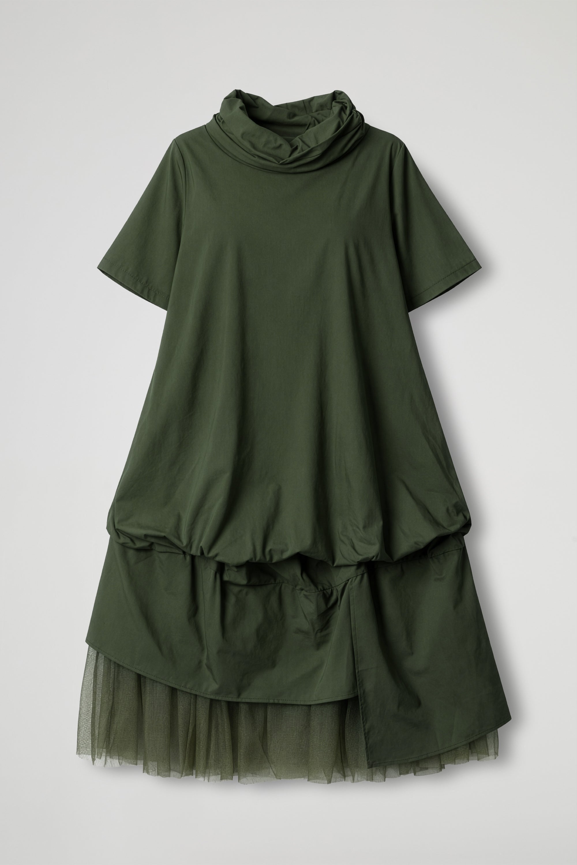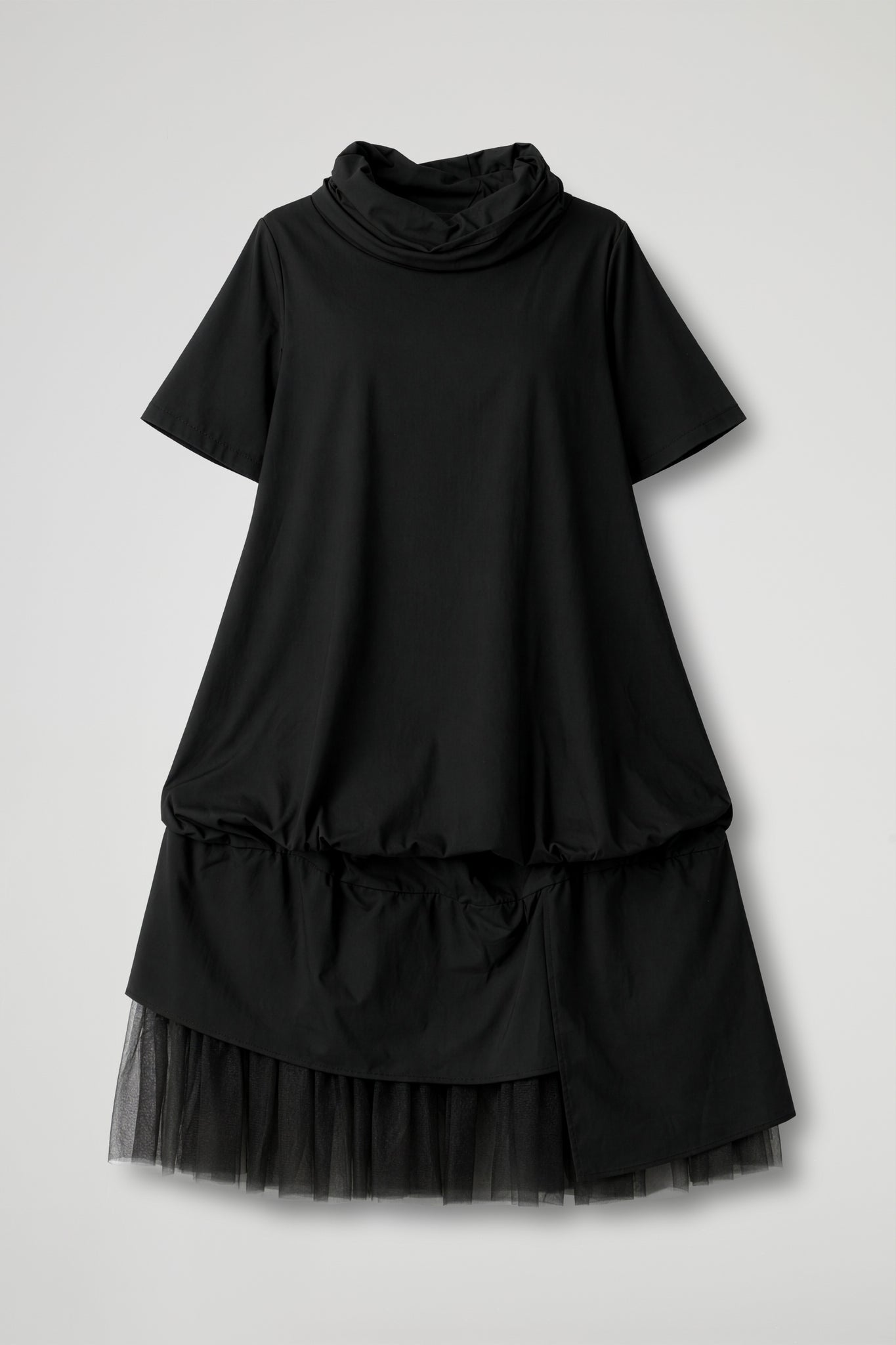 Asymmetrical oversized dress in viscose fabric, wide cowl neck, short sleeves with clean hem, slightly puffed silhouette with tulle insert at the bottom, tulle lining throughout. Loose fit.