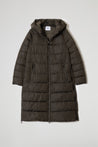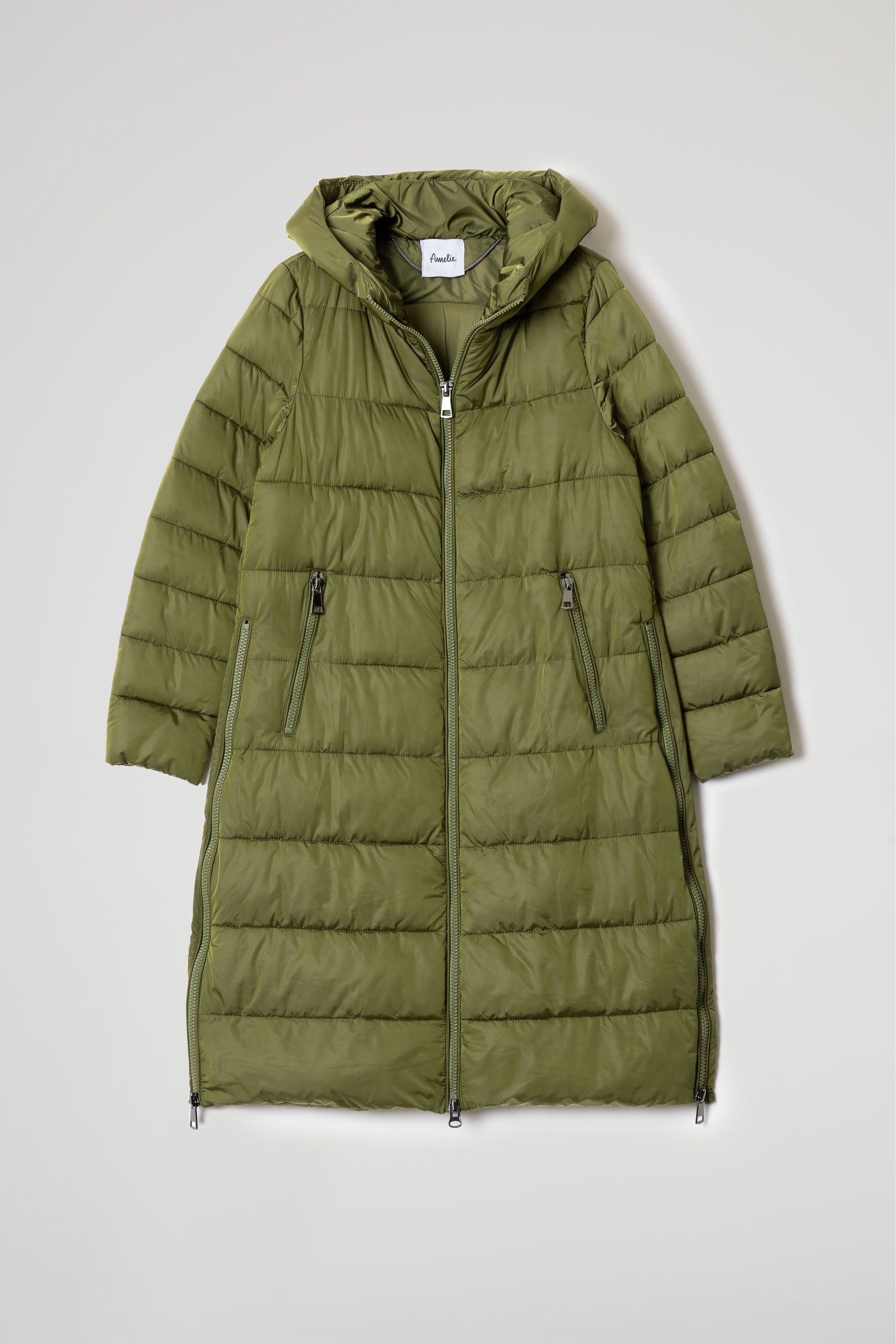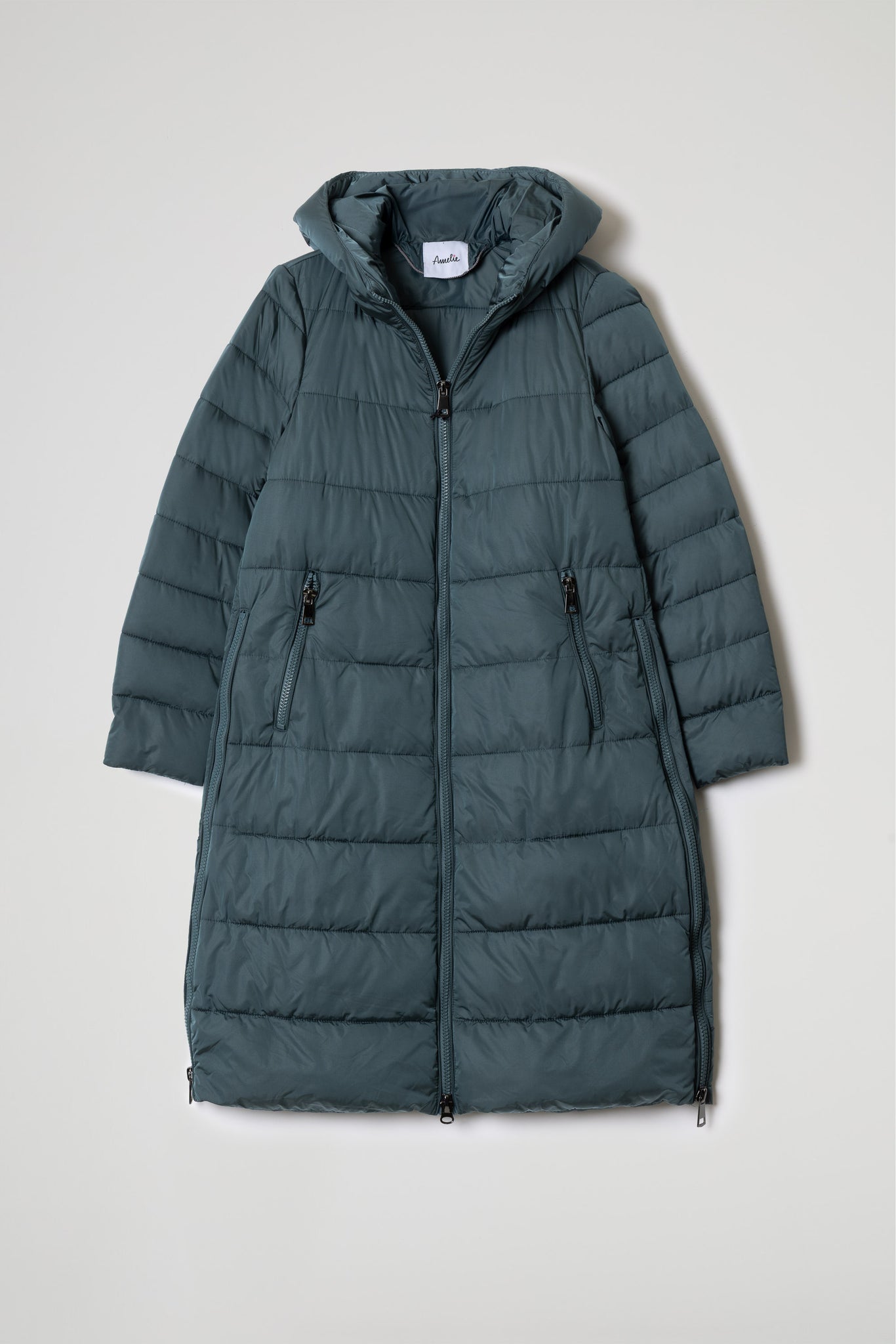 Piumino sagomato lungo, cappuccio fisso con particolare intreccio sul retro, manica lunga, chiusura zip frontale a doppio cursore, tasche laterali con chiusura zip invisibile, zip laterali apribili per maggior libertà di movimento, trapuntatura orizzontale, leggero effetto lucido del tessuto che dona luminosità l capo. Linea confortevole